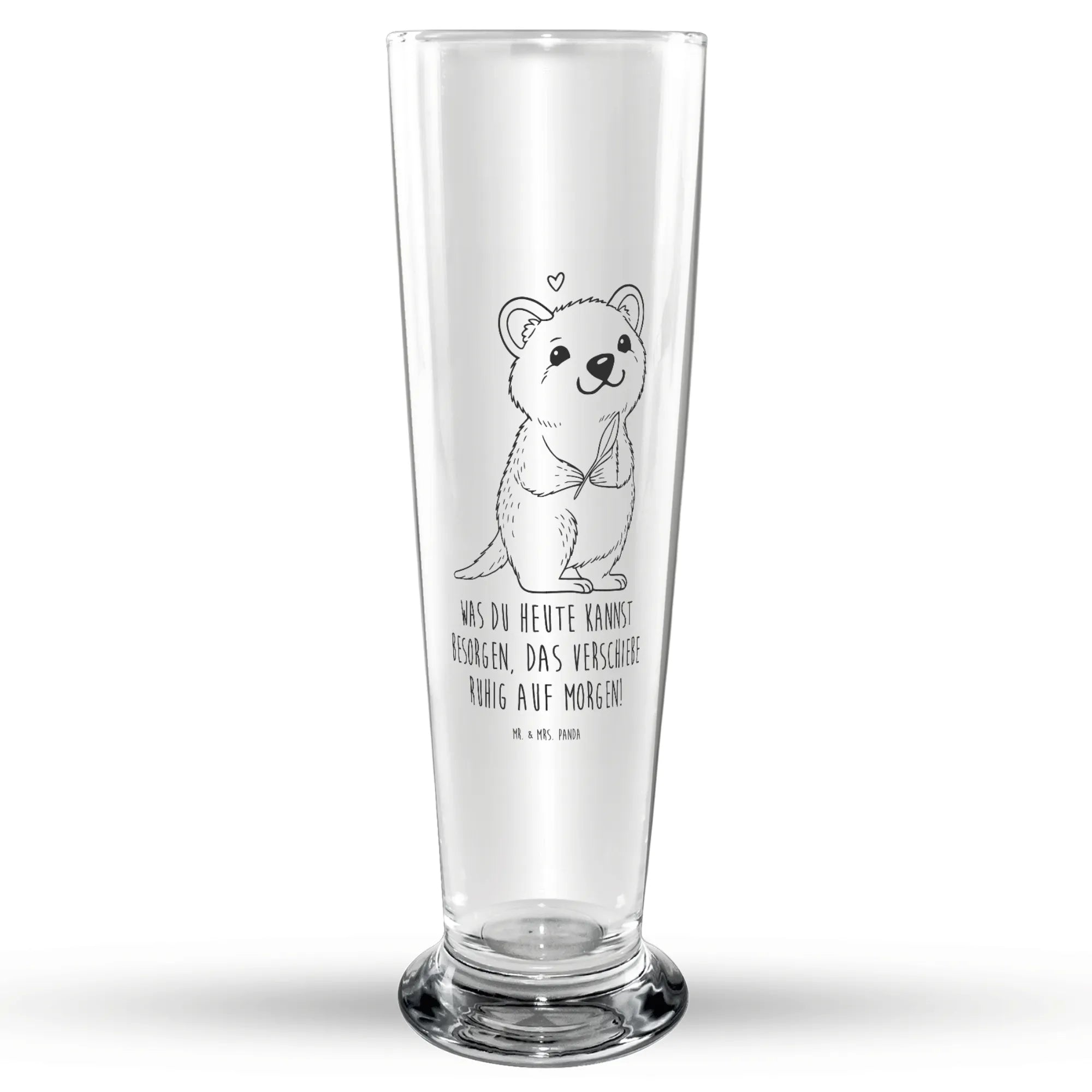 Bierglas Quokka Happy aus der Kollektion Small World ist ein ganz besonderes Geschenk für alle Bierliebhaber! Ideal für Vatertag, Geburtstage oder einfach als Gute-Laune-Geschenk. Die drollige Gravur eines Quokkas mit dem lustigen Spruch "Was du heute kannst besorgen, das verschiebe ruhig auf morgen!" bringt nicht nur ein Lächeln auf die Gesichter, sondern erinnert daran, das Leben nicht zu ernst zu nehmen!