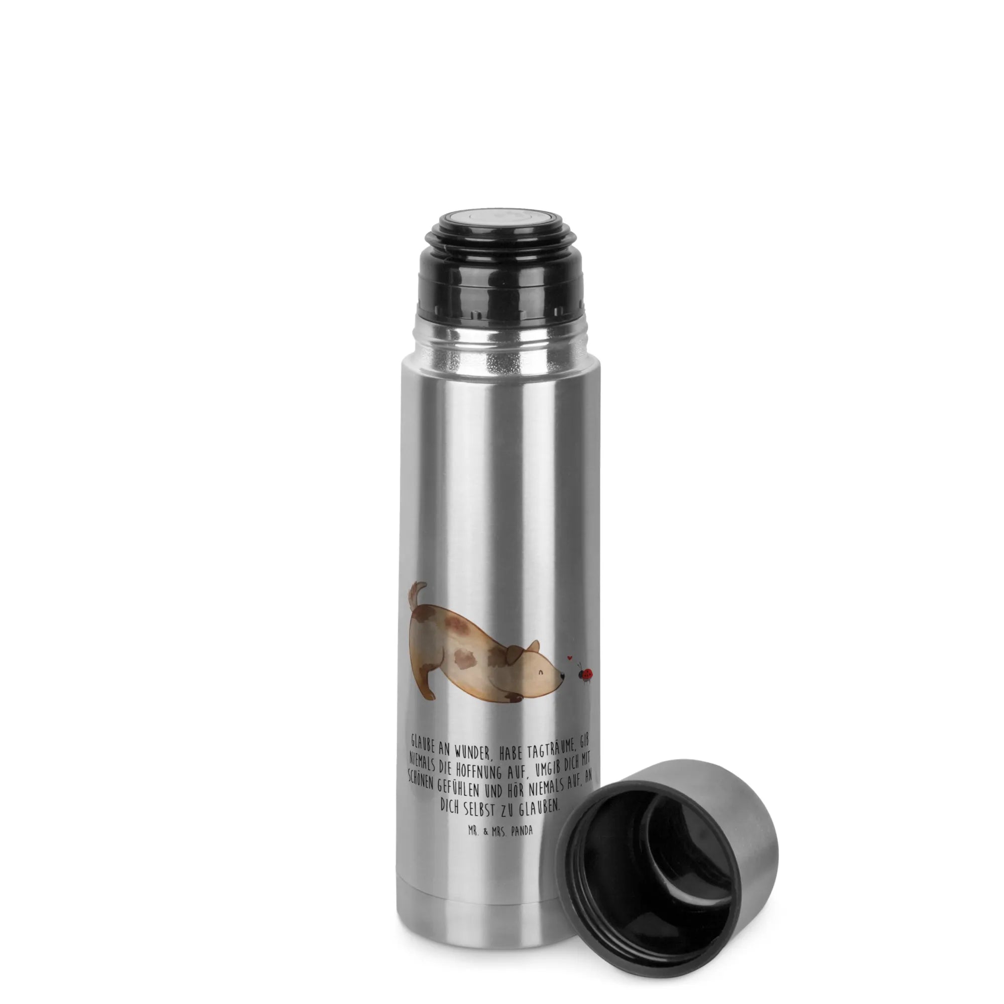 Der Spruch "Glaube an Wunder, habe Tagträume, gib niemals die Hoffnung auf, umgib dich mit schönen Gefühlen und hör niemals auf, an dich selbst zu glauben" bringt zusätzlich eine positive Botschaft mit, die dich immer begleiten wird. Lass dich von dieser liebevoll gestalteten Thermoskanne inspirieren und genieße deine Getränke in bester Gesellschaft. Hol dir jetzt die "Hund Marienkäfer" Thermoskanne von Mr. & Mrs. Panda und zeige die Liebe zu deinem Haustier auf eine ganz besondere Weise! Hol dir dieses exquisite Stück in dein Zuhause oder verschenke es an einen lieben Menschen in deinem Leben, der Hunde liebt!