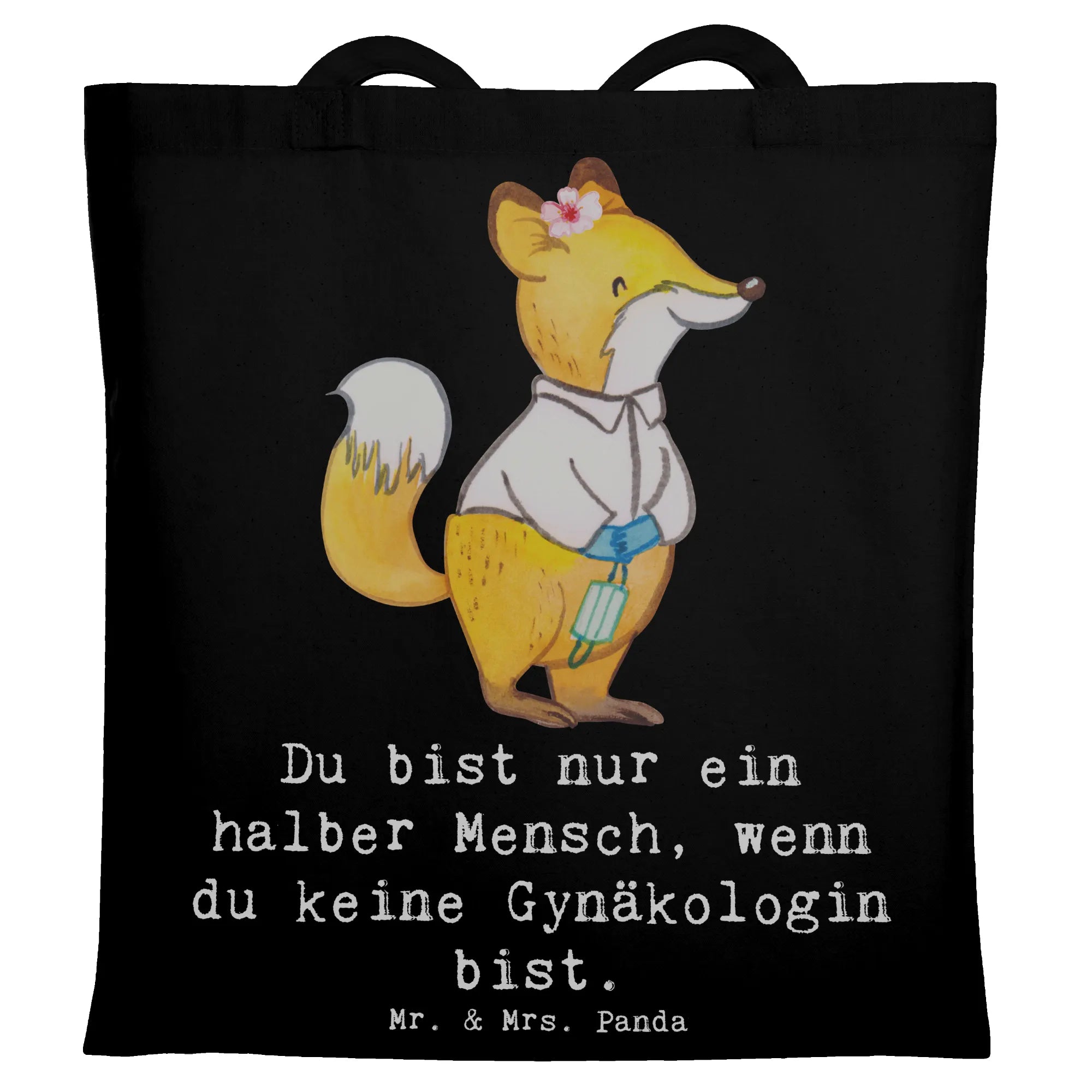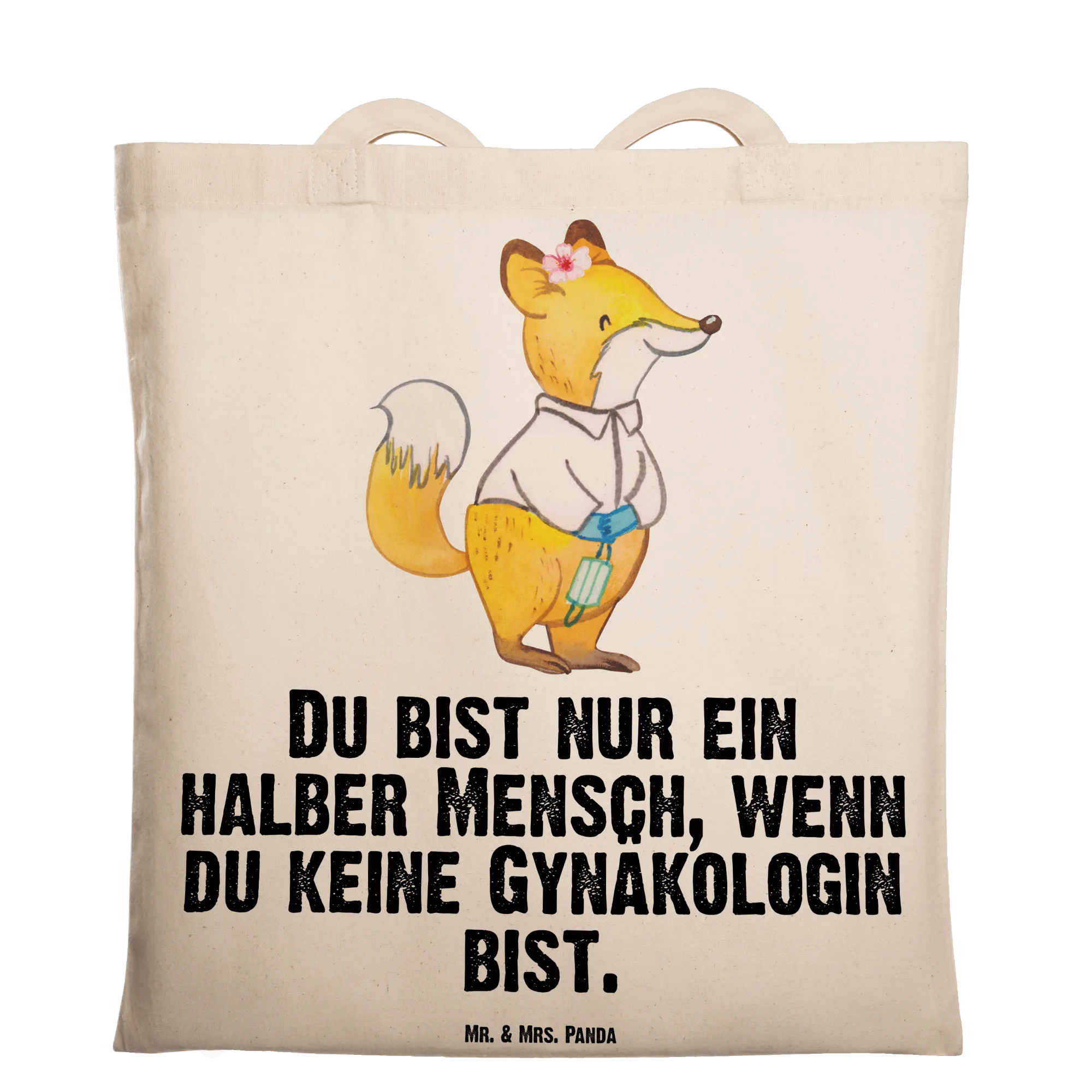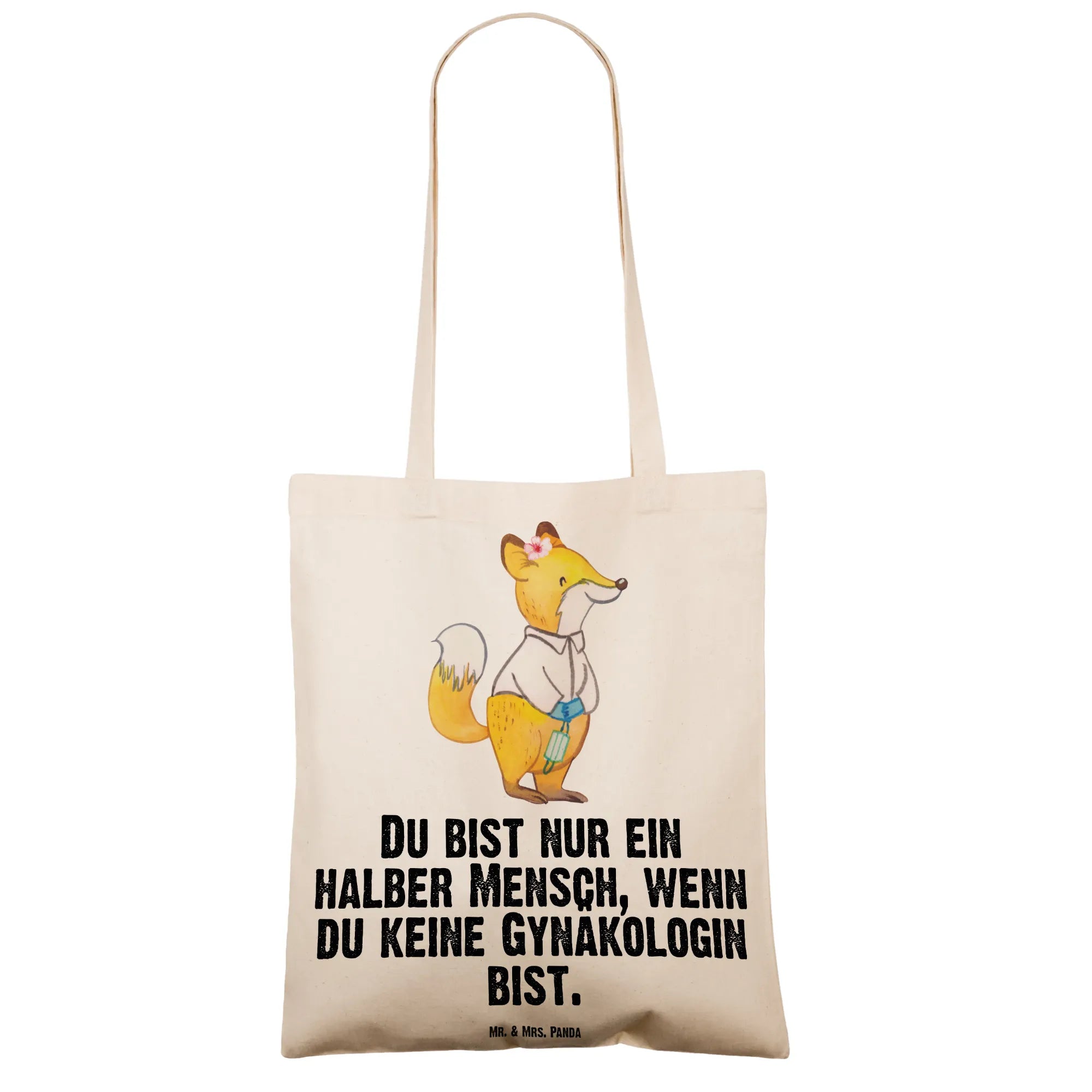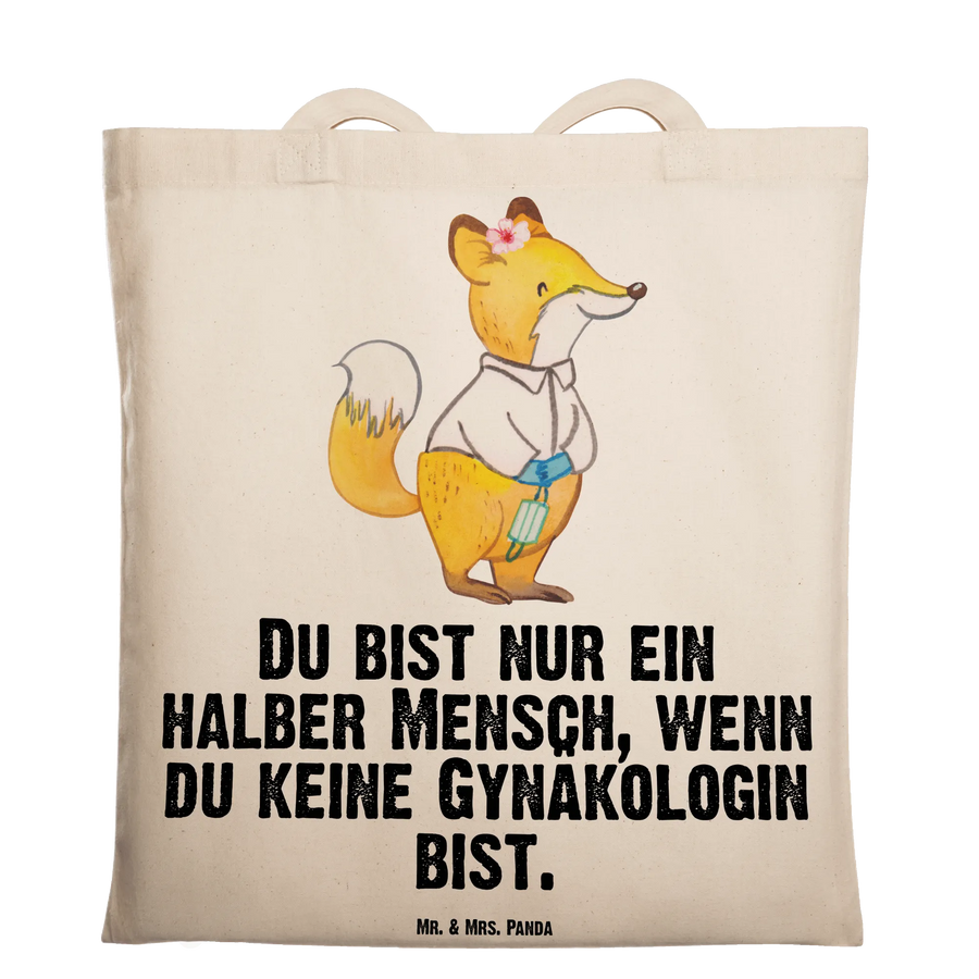 Eine wunderschöne Tragetasche von Mr. & Mrs. Panda: Die "Gynäkologin mit Herz" ist ein liebevoll gestaltetes Geschenk aus unserer Berufe-Kollektion. Das niedliche Fuchs-Motiv zeigt eine weibliche Gynäkologin mit Herz und den frechen Spruch „Du bist nur ein halber Mensch, wenn du keine Gynäkologin bist.“ – perfekt, um deiner Frauenärztin ein Lächeln zu schenken.