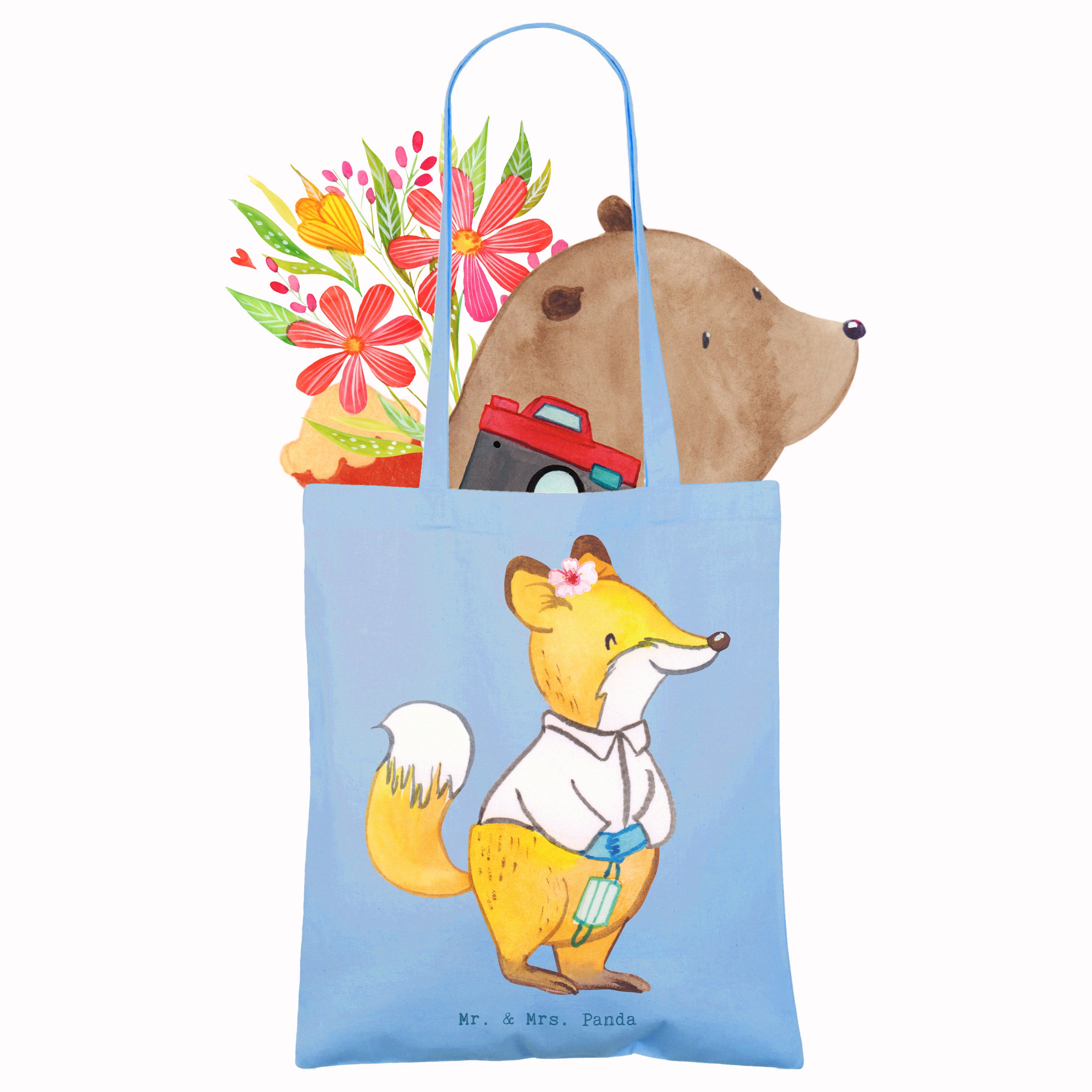 Das Motiv wurde von Mrs. Panda in Aquarell handgezeichnet und hochwertig gedruckt. Die frische Sky Blue Hintergrundfarbe wirkt ruhig und professionell und macht die Tasche zum wunderbaren Begleiter für den Alltag, den Einkauf oder die Praxis. Durch die stabilen, langen Tragegriffe ist die Tasche bequem über der Schulter zu tragen und bietet zuverlässige Stabilität durch Cross Stitching an den Griffen.