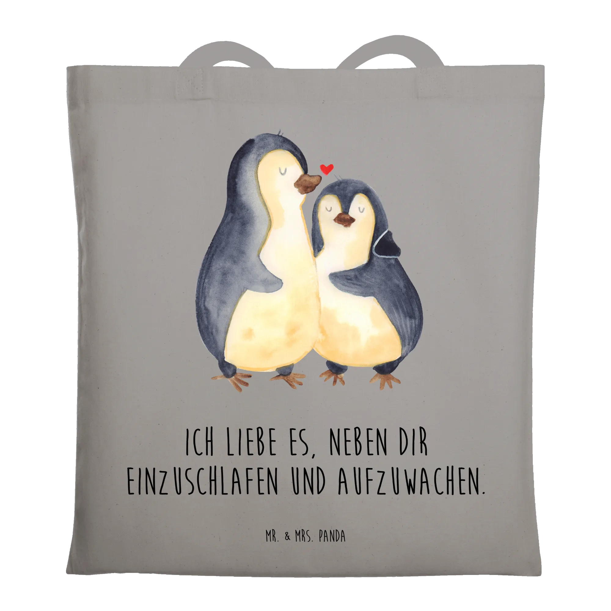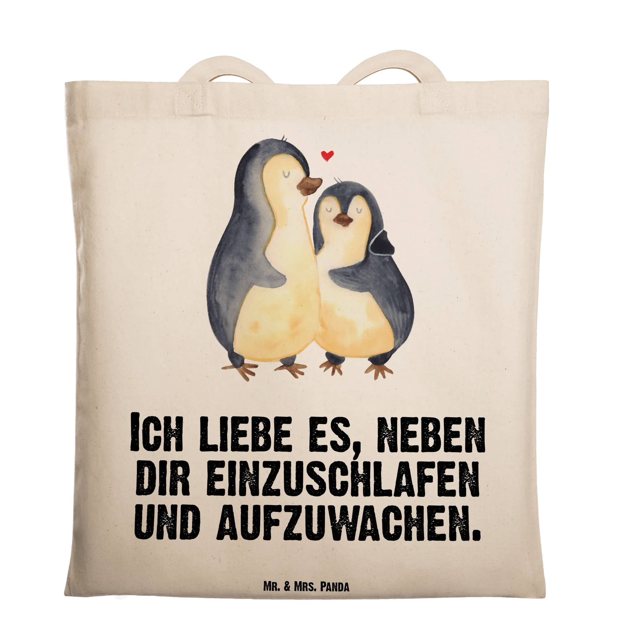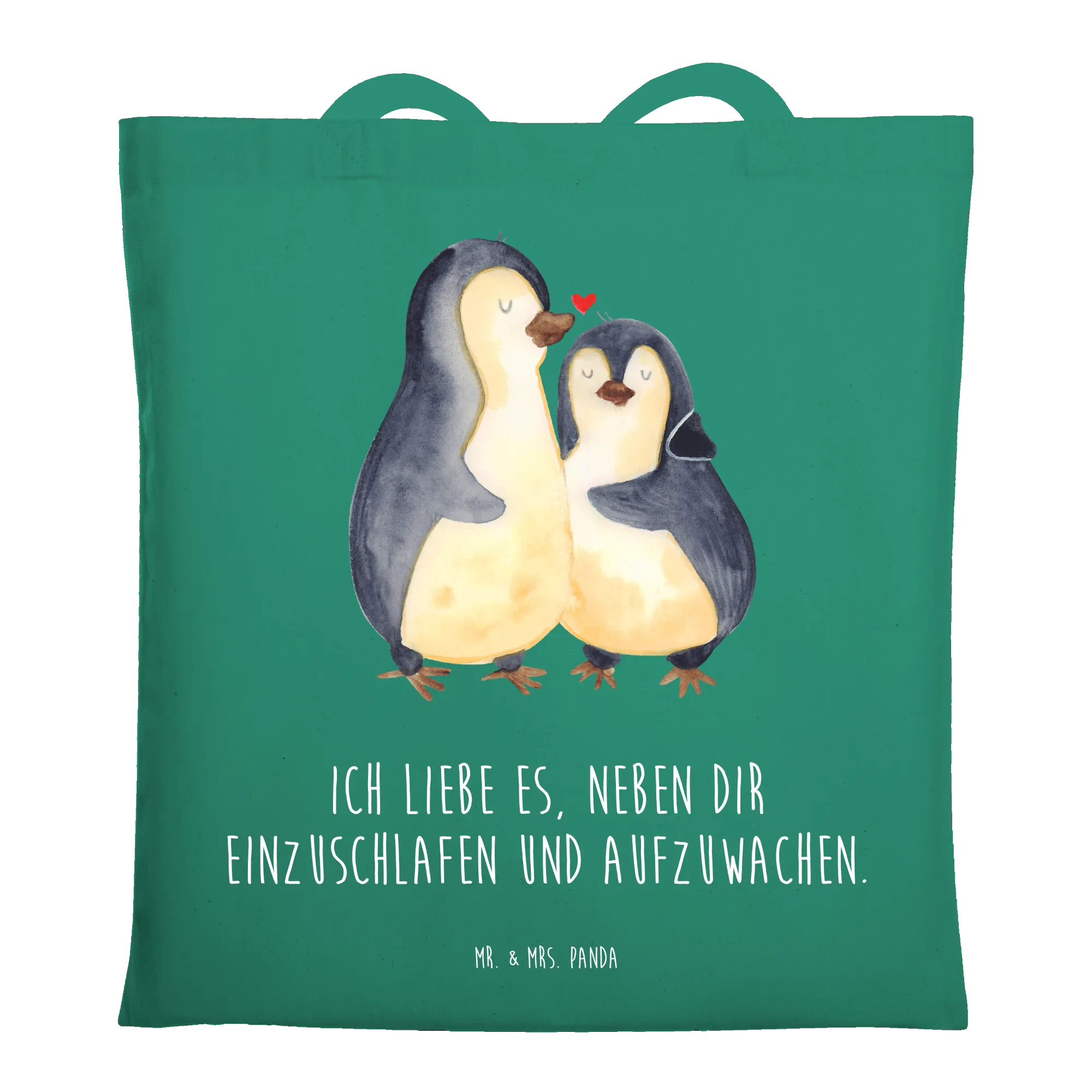 Eine Liebeserklärung zum Mitnehmen: Unsere Tragetasche „Pinguine Einschlafen“ aus der Liebe-Kollektion von Mr. & Mrs. Panda ist mehr als nur eine Einkaufstasche – sie ist ein kleines Geschenk für den Alltag, das Zuneigung zeigt. Auf dem sanften mintgrünen Hintergrund kuscheln zwei handgezeichnete Aquarell-Pinguine innig nebeneinander, darüber schwebt ein kleines rotes Herz. Der liebevolle Spruch „Ich liebe es, neben dir einzuschlafen und aufzuwachen.“ macht die Stofftasche zu einem perfekten Liebesgeschenk für Freundin, Freund, Ehefrau oder Ehemann.