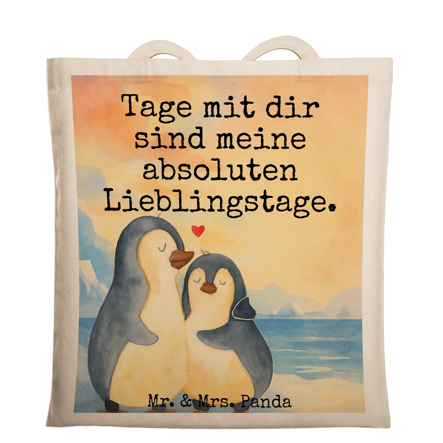 Eine wunderschöne Tragetasche von Mr. & Mrs. Panda – bezaubernd bedruckt mit dem Motiv „Pinguin umarmend“ aus der Pinguin - Kollektion. Zwei Pinguine, einer legt liebevoll seine Flosse um den anderen. Dieses Motiv strahlt Wärme, Nähe und Loyalität aus und wird durch den Spruch „Tage mit dir sind meine absoluten Lieblingstage.“ zu einem echten Liebesbeweis.