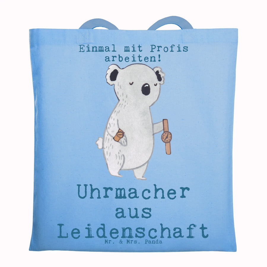 Uhrmacher aus Leidenschaft – die perfekte Tragetasche von Mr. & Mrs. Panda für alle, die das Uhrmacherhandwerk lieben. Auf hellblauem Hintergrund zeigt das Motiv einen süßen Koala mit einer goldenen Uhr am Handgelenk, stolz eine weitere Uhr präsentierend. Der Slogan "Uhrmacher aus Leidenschaft" macht die Tasche zum liebevollen Statement für Beruf, Hobby oder als Geschenk.