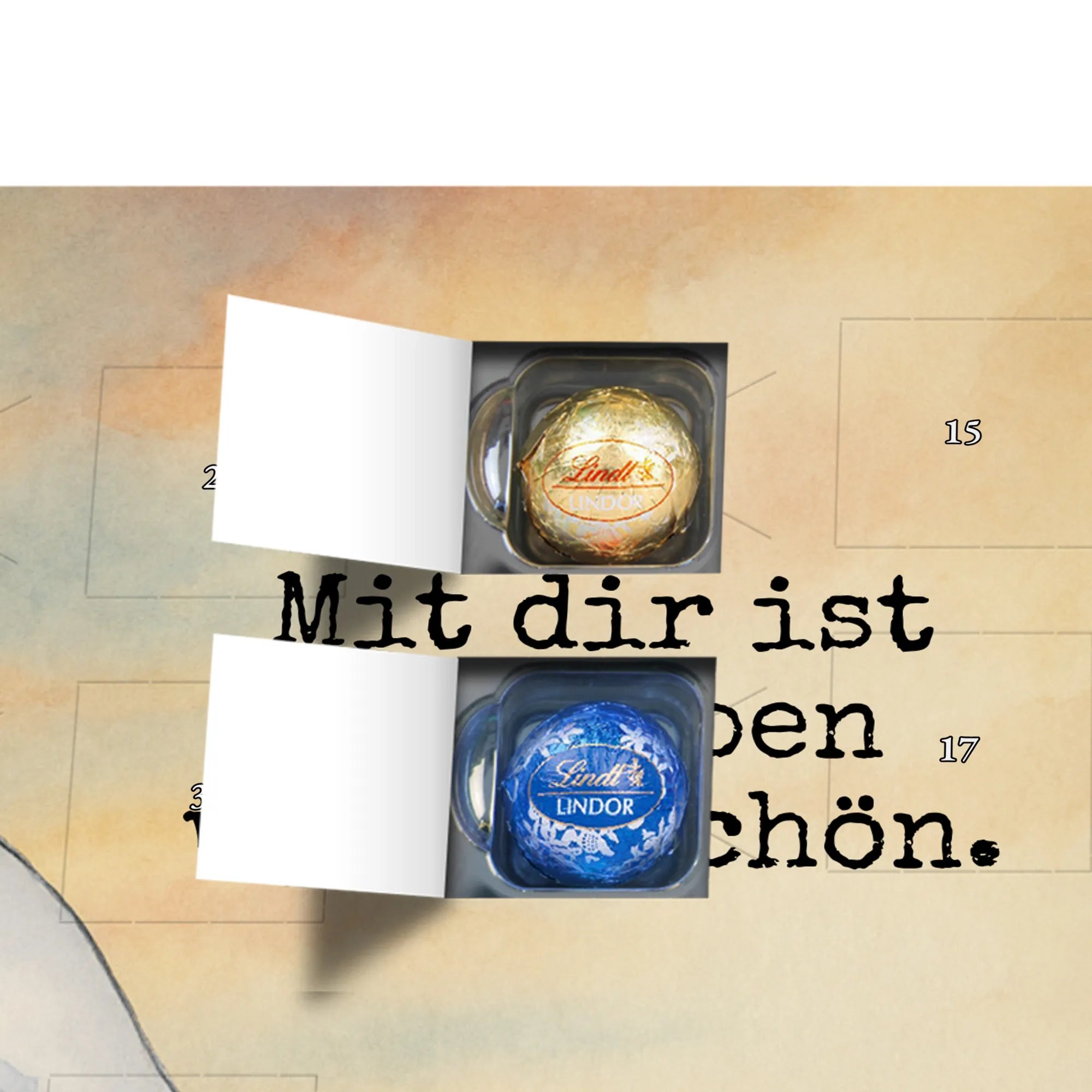 Gefüllt mit 24 einzeln verpackten Markenschokoladen-Kugeln von Lindt LINDOR in den Sorten Vollmilch, Feinherb und Weiße Schokolade. Jeder Tag im Advent wird so zu einem kleinen Geschmackserlebnis und zu einem gemeinsamen Moment der Zweisamkeit.