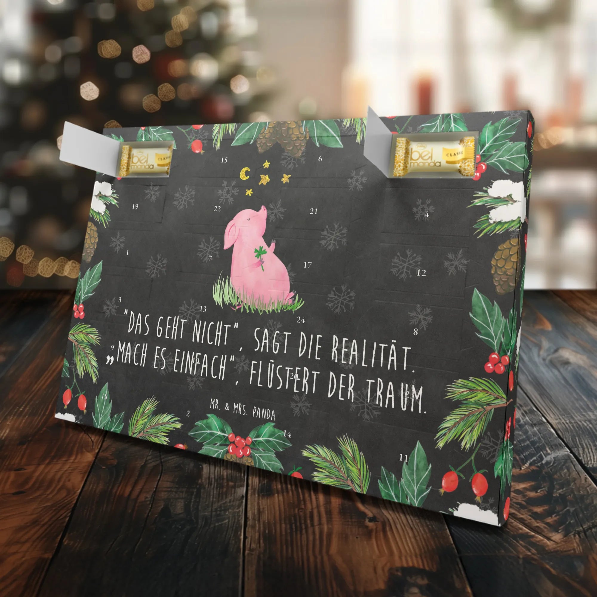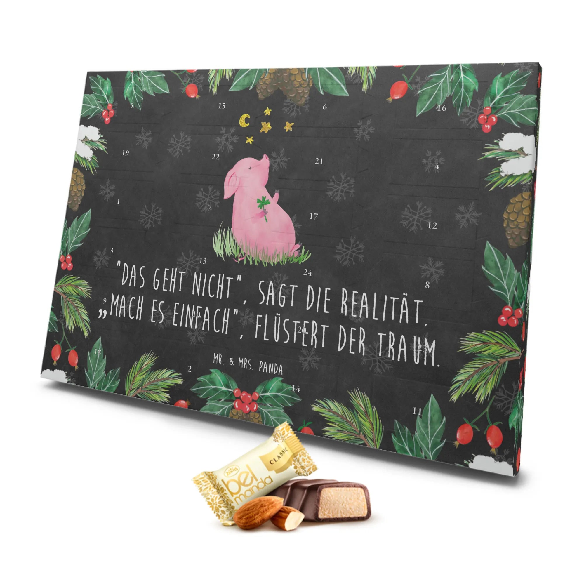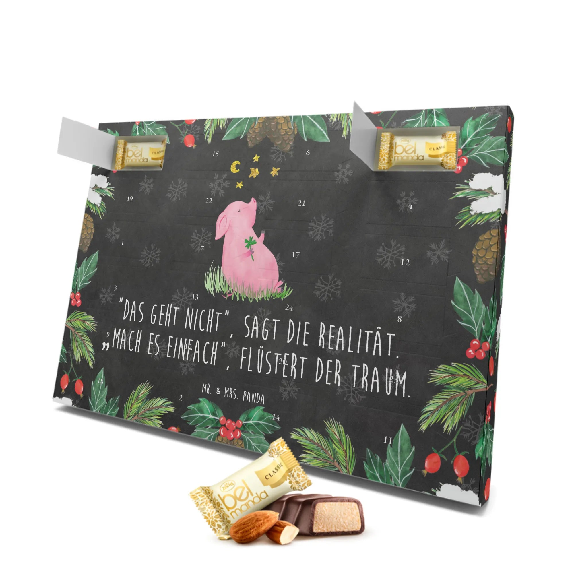 Der Marzipan Adventskalender von Mr. & Mrs. Panda mit dem süßen Motiv des Glücksschweins ist das perfekte Geschenk für alle, die sich während der Adventszeit eine Extraportion Freude und Glück wünschen. Dieser wunderschöne Adventskalender ist nicht nur ein kulinarisches Highlight, sondern auch ein richtiger Glücksbringer. Das Glücksschwein, das ein Kleeblatt in seiner Hand hält, symbolisiert positive Wünsche, Zufriedenheit und die Erfüllung von Träumen. Der Spruch "Das geht nicht“, sagt die Realität. „Mach es einfach“, flüstert der Traum. kann Dich jeden Tag daran erinnern, an Deine Ziele zu glauben und sie zu verfolgen.