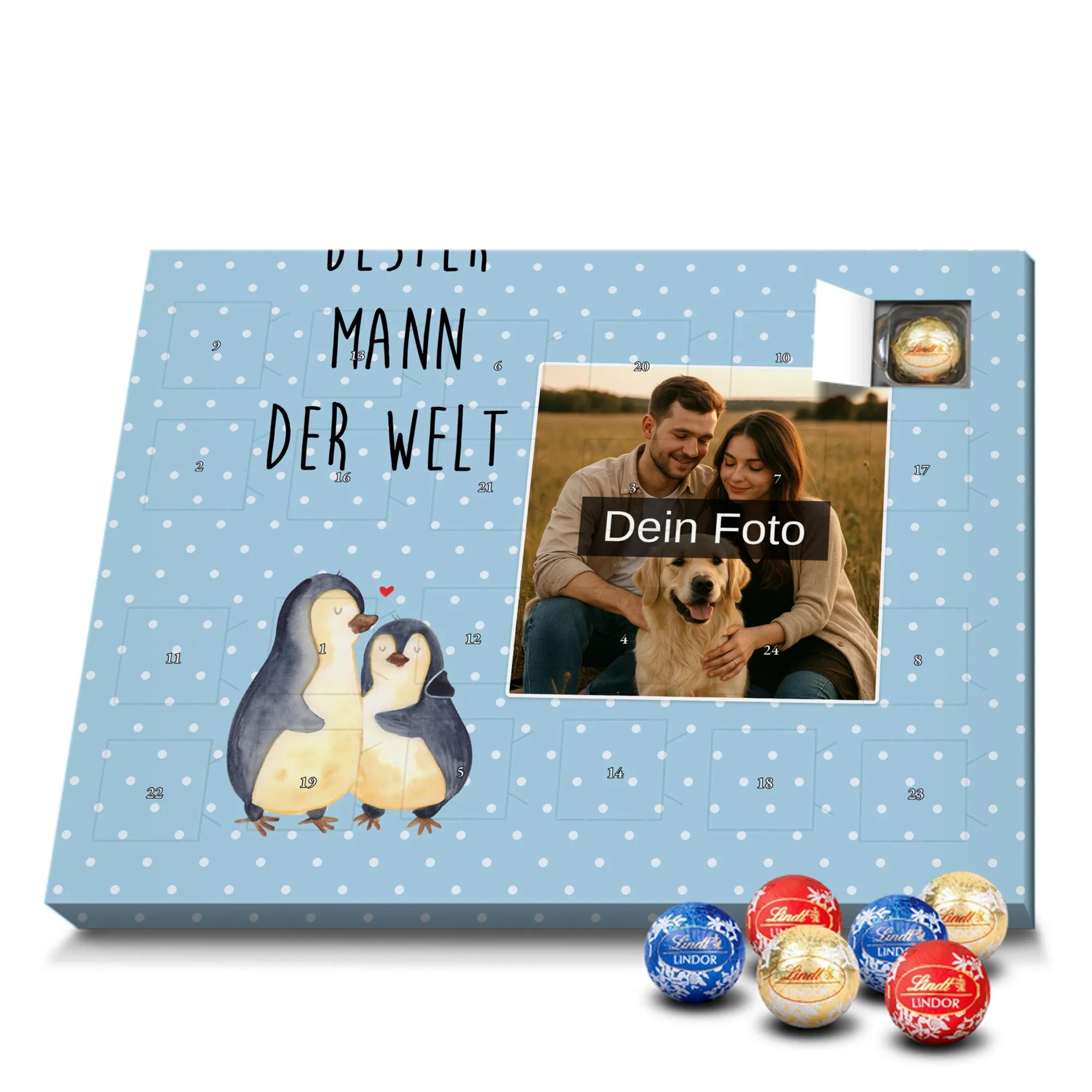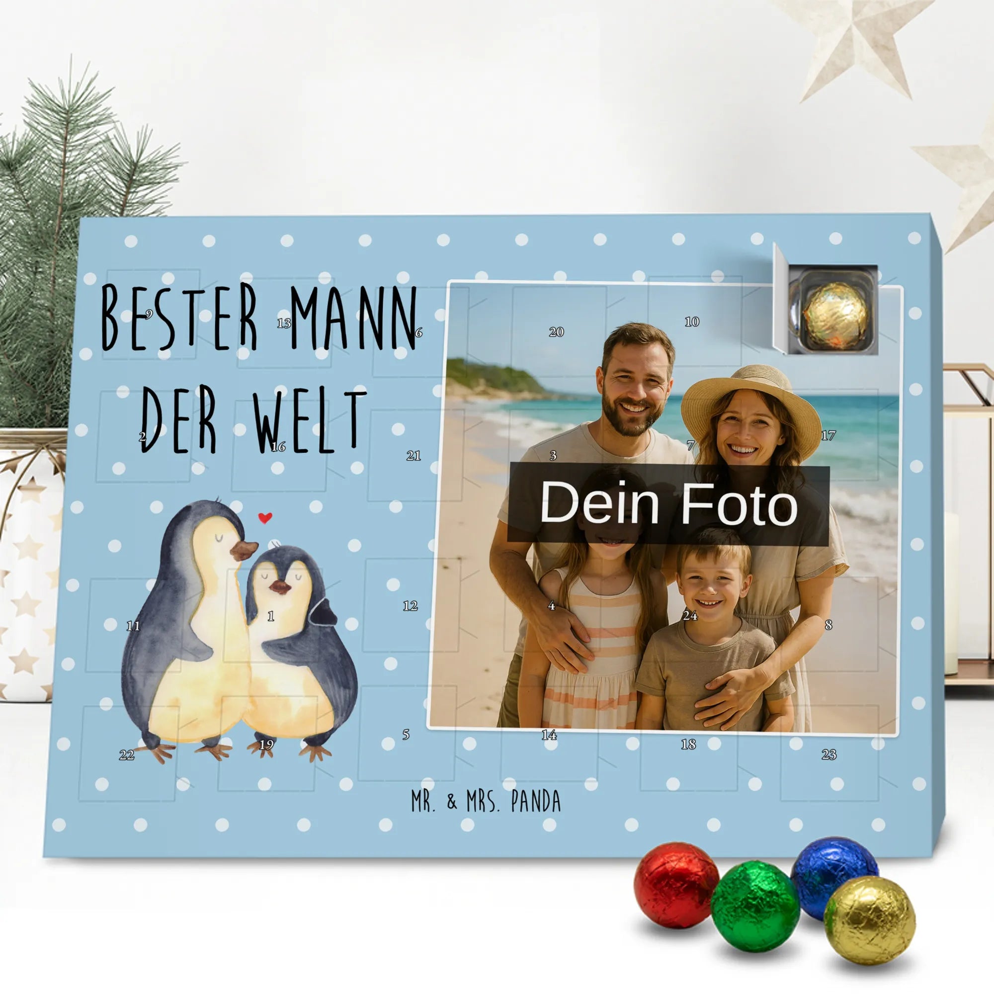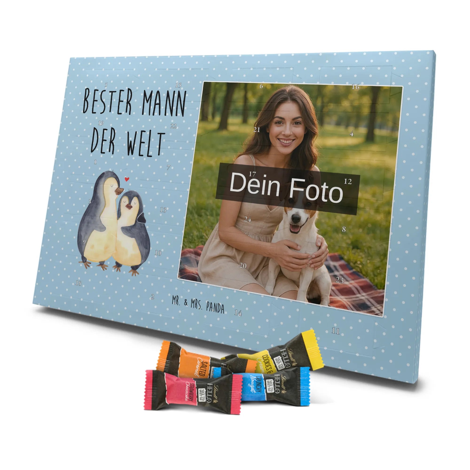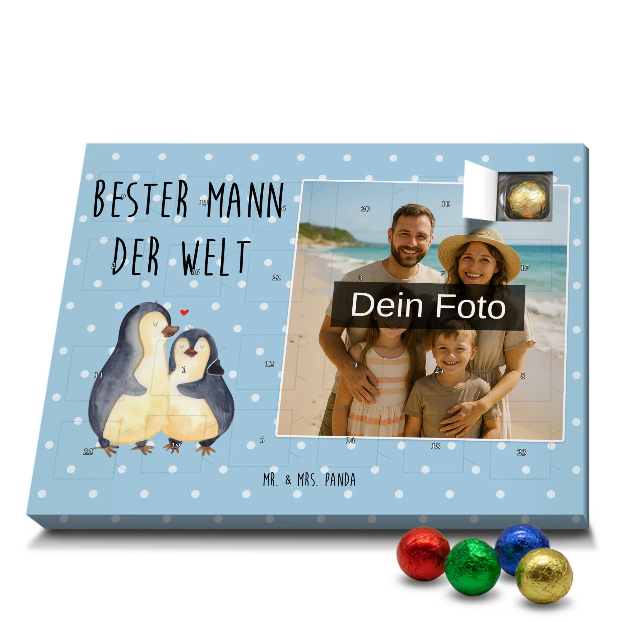 Mach die Adventszeit persönlich und süß: Mit dem personalisierten Schoko Foto Adventskalender Pinguin „Bester Mann der Welt“ schenkst du deinem Freund, Mann oder Ehemann 24 Tage voller kleiner Überraschungen und Zuneigung. Die zwei süßen Pinguine, handgezeichnet von Mrs. Panda, halten sich im Arm – das perfekte Motiv für eine liebevolle Adventsüberraschung.