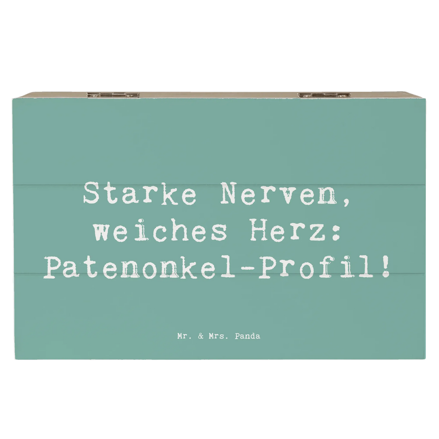 Eine wunderschöne Holzkiste von Mr. & Mrs. Panda ist das perfekte Geschenk für alle Patenonkels, die eine besondere Rolle im Leben ihres Patenkindes spielen. Mit einem charmanten Motiv, das den Spruch "Starke Nerven, weiches Herz: Patenonkel-Profil!" ziert, bietet diese Kiste nicht nur einen stilvollen Aufbewahrungsort für wertvolle Erinnerungen, sondern auch eine herzliche Botschaft.
