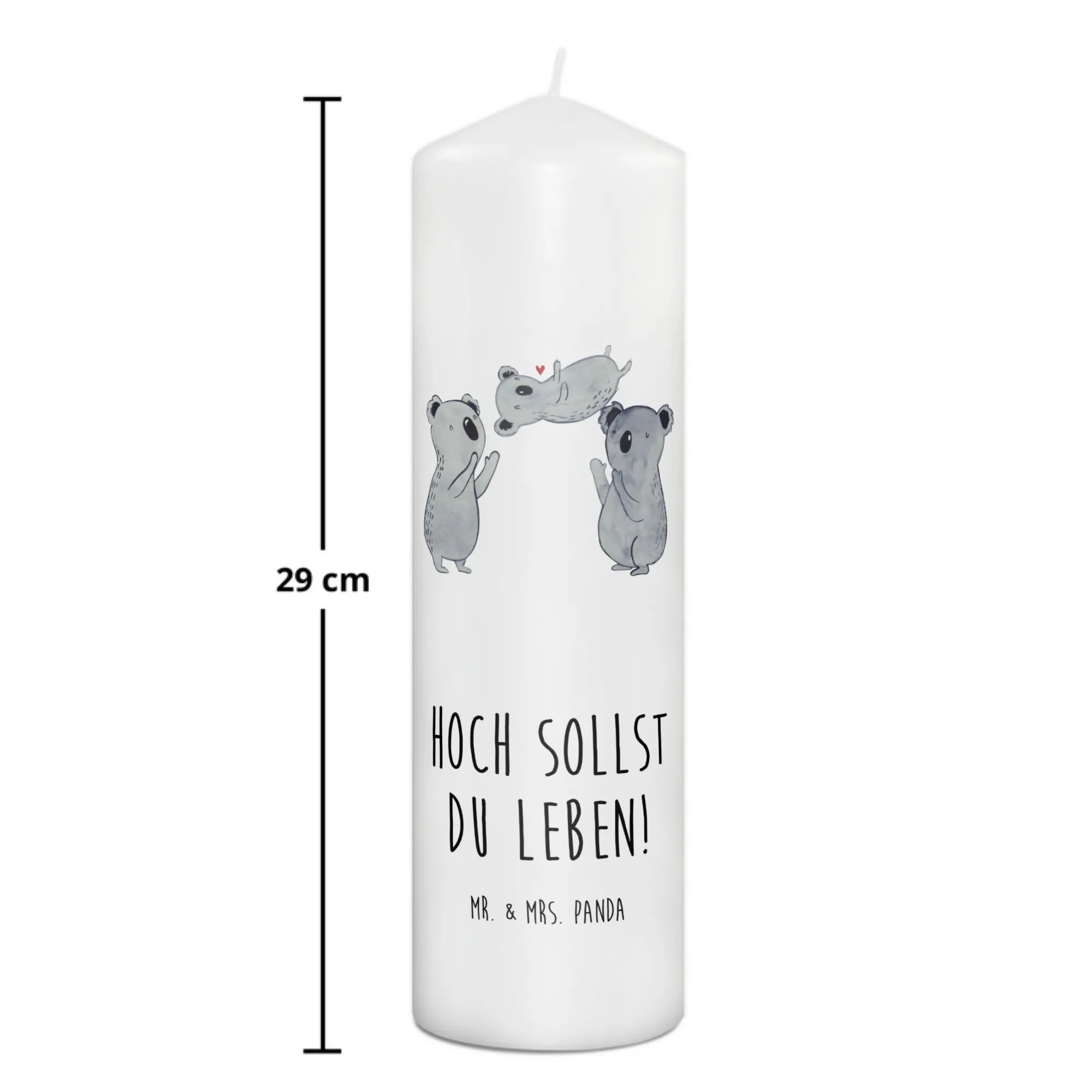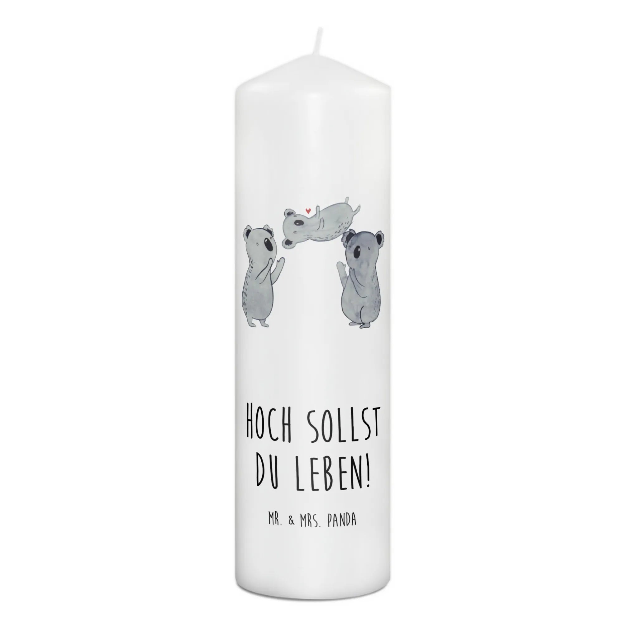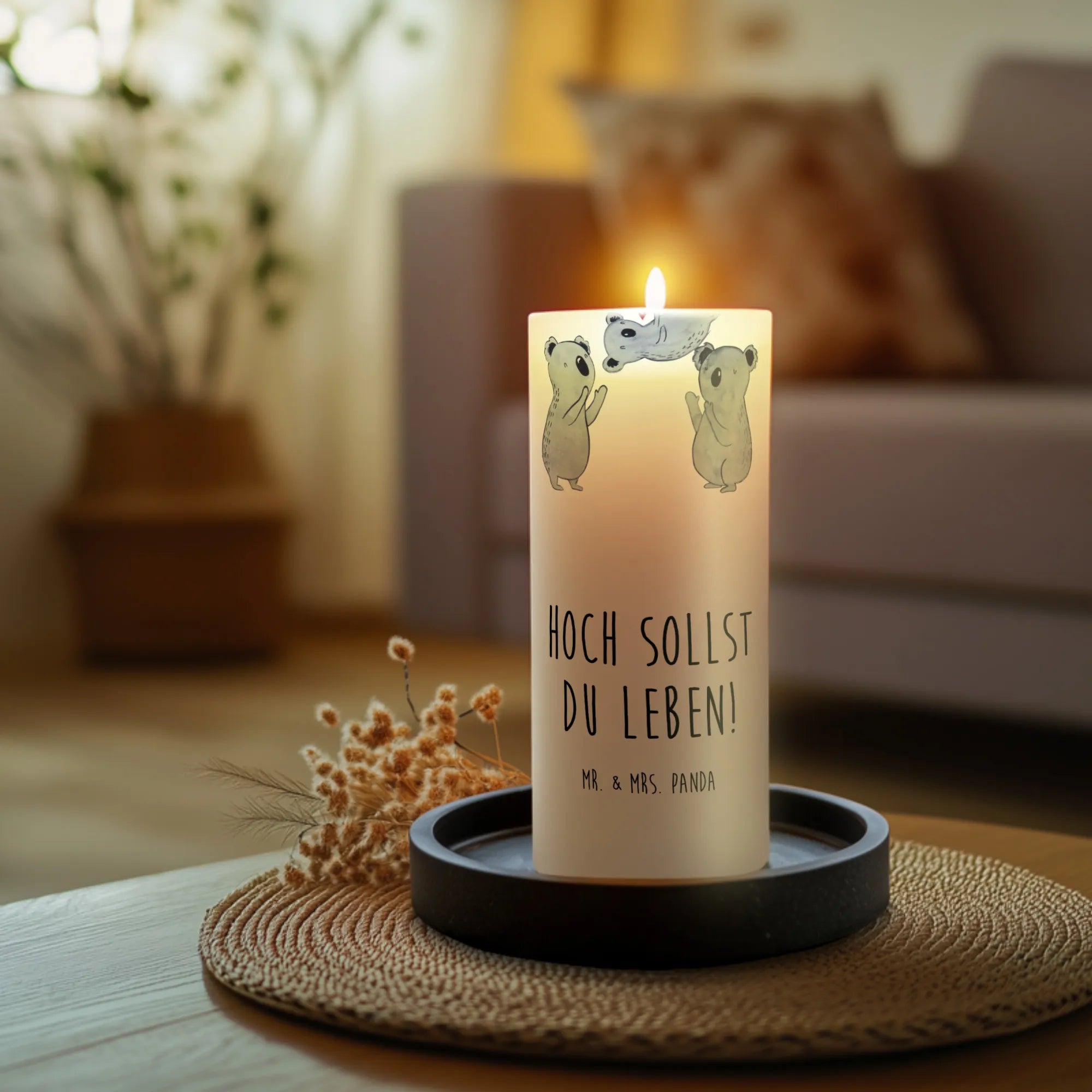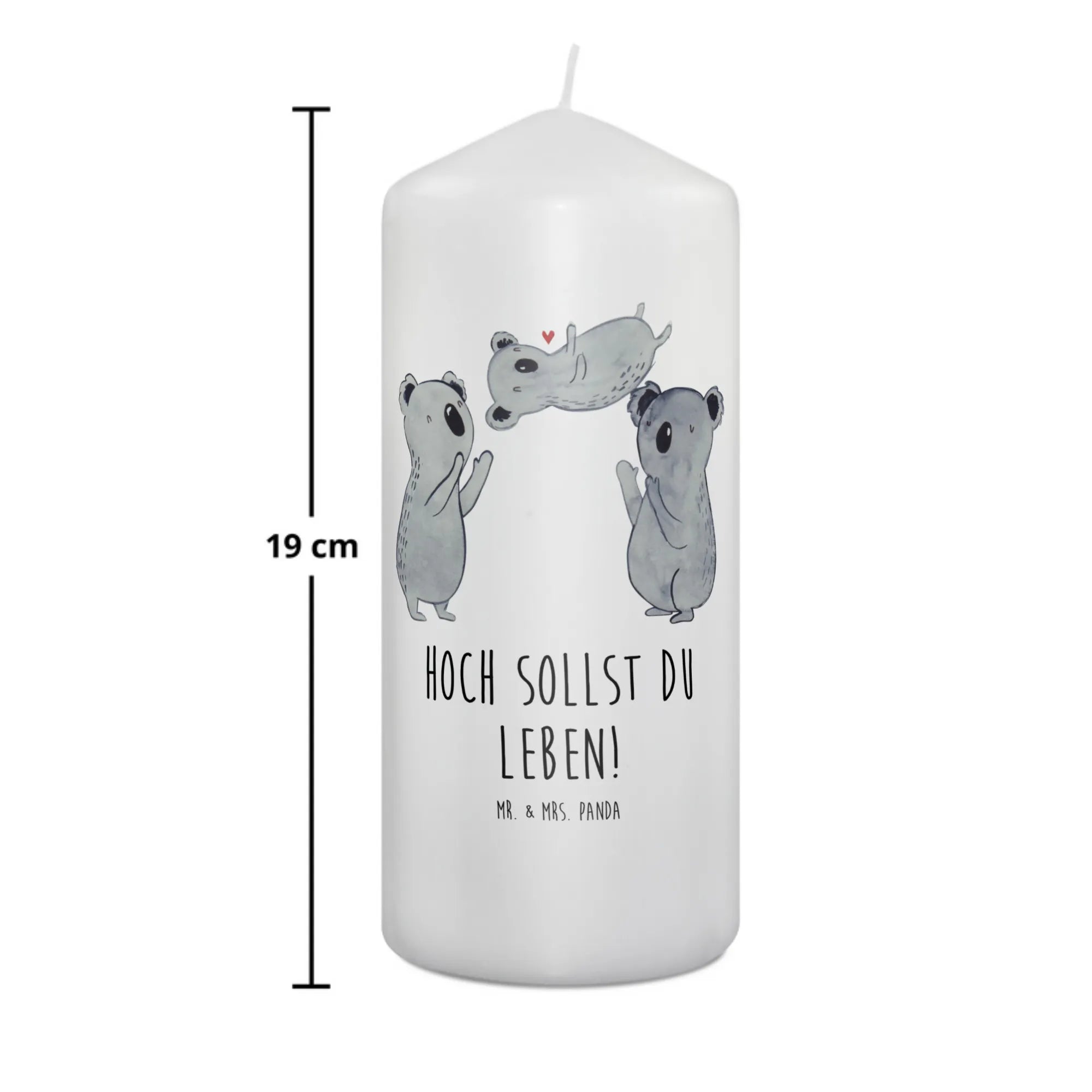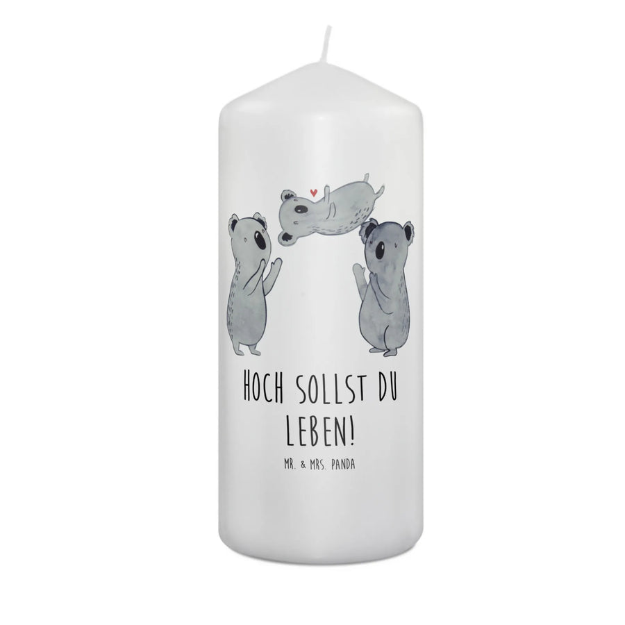 Entdecke die wunderbare Koala Feiern Sich Kerze von Mr. & Mrs. Panda! Diese besondere Kerze ist das perfekte Geschenk für jeden Geburtstag und bringt Freude in jede Feier. Mit dem bezaubernden Motiv von zwei süßen Koalas, die einen anderen Koala voller Glück in die Luft werfen, vermittelt sie eine herzliche Botschaft: 'Hoch sollst du leben!'.