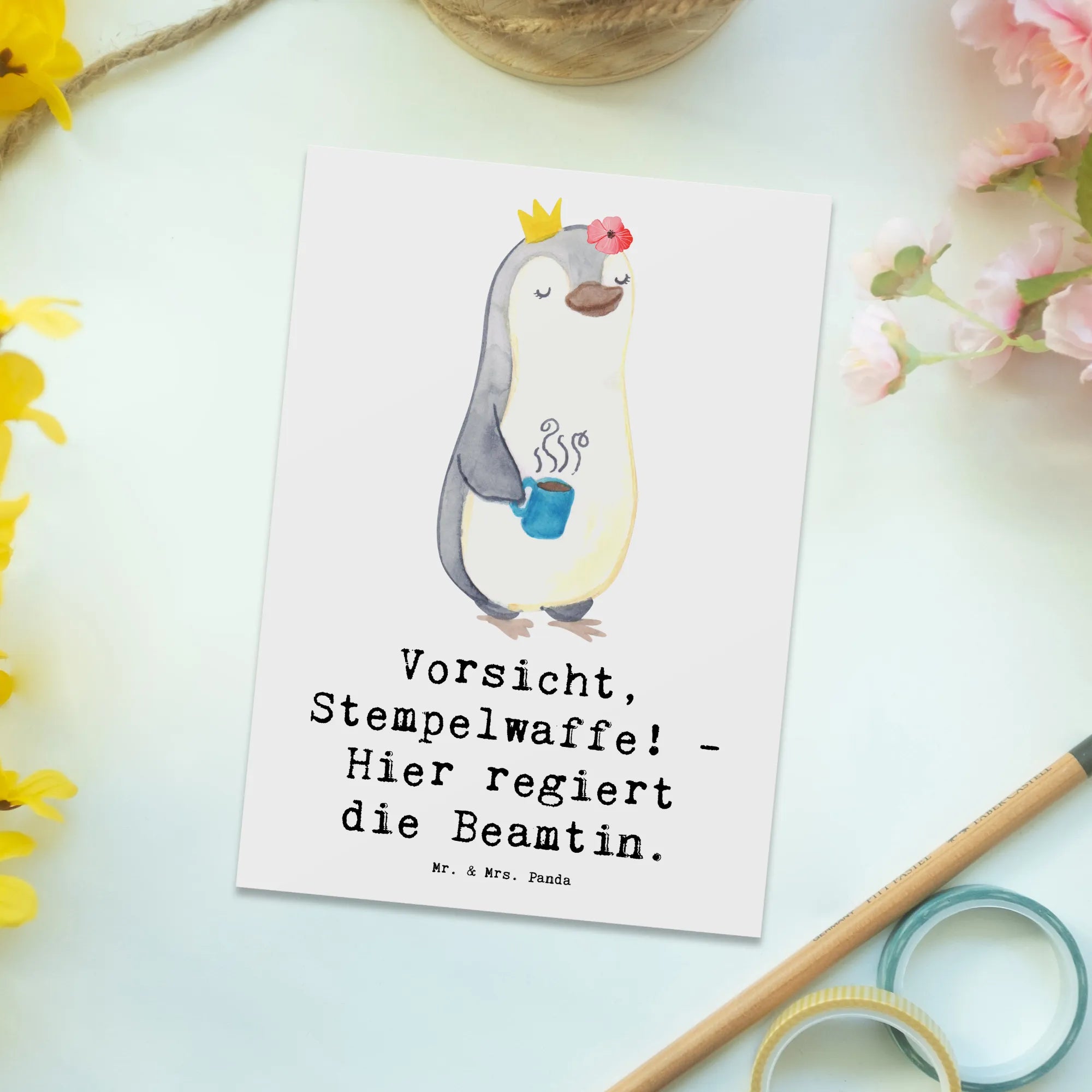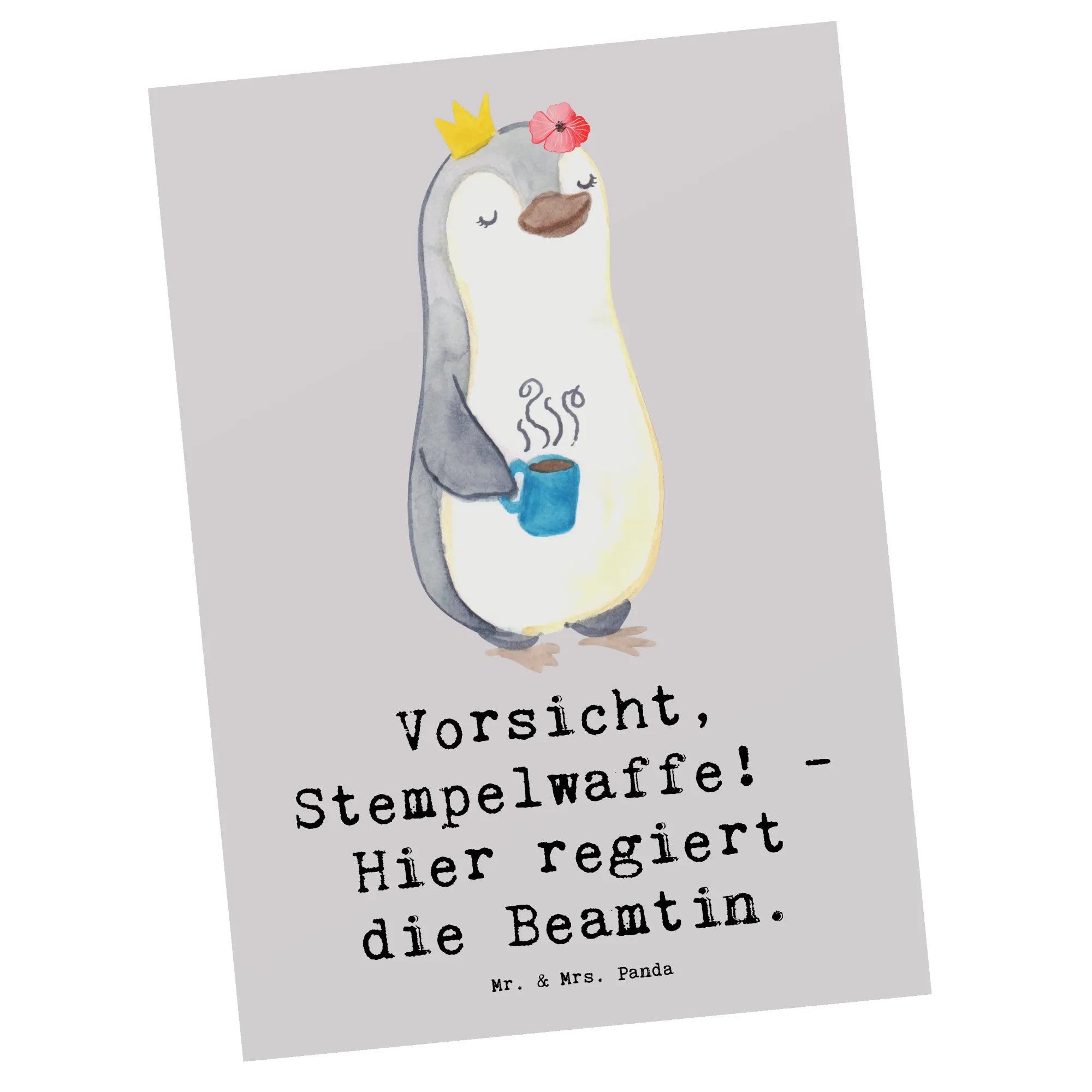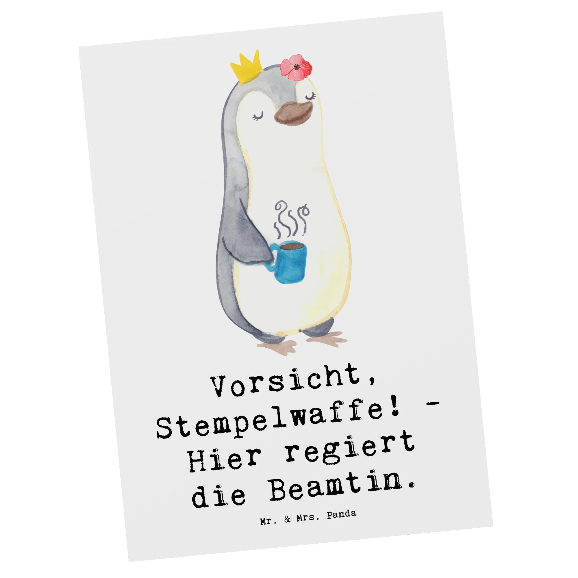 Suchst Du nach einer perfekten Geschenkidee für Deine Lieblingsbeamtin oder Beamten? Dann ist die Postkarte mit dem witzigen Motiv "Vorsicht, Stempelwaffe! - Hier regiert die Beamtin." aus der einzigartigen Berufe Kollektion von Mr. & Mrs. Panda genau das Richtige!