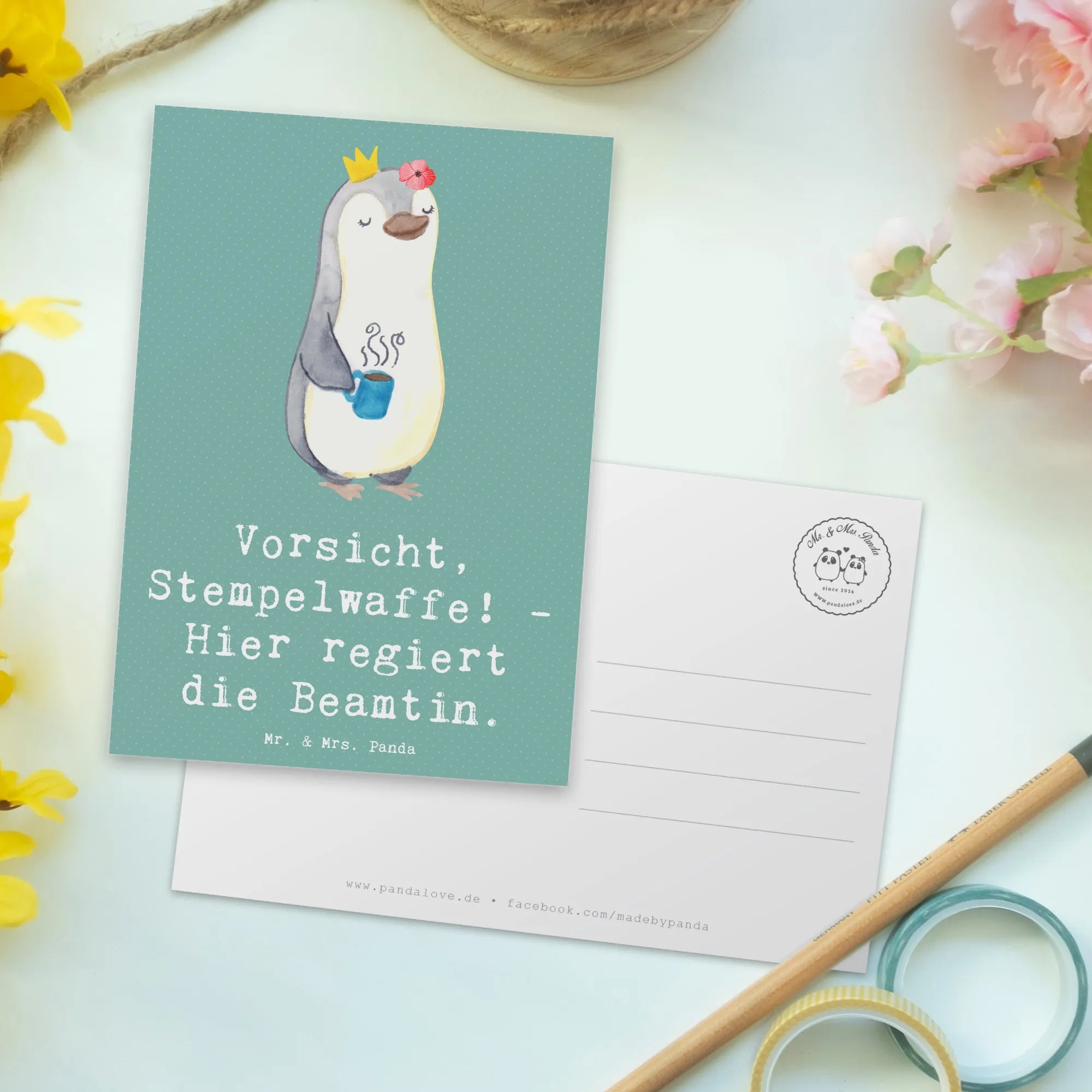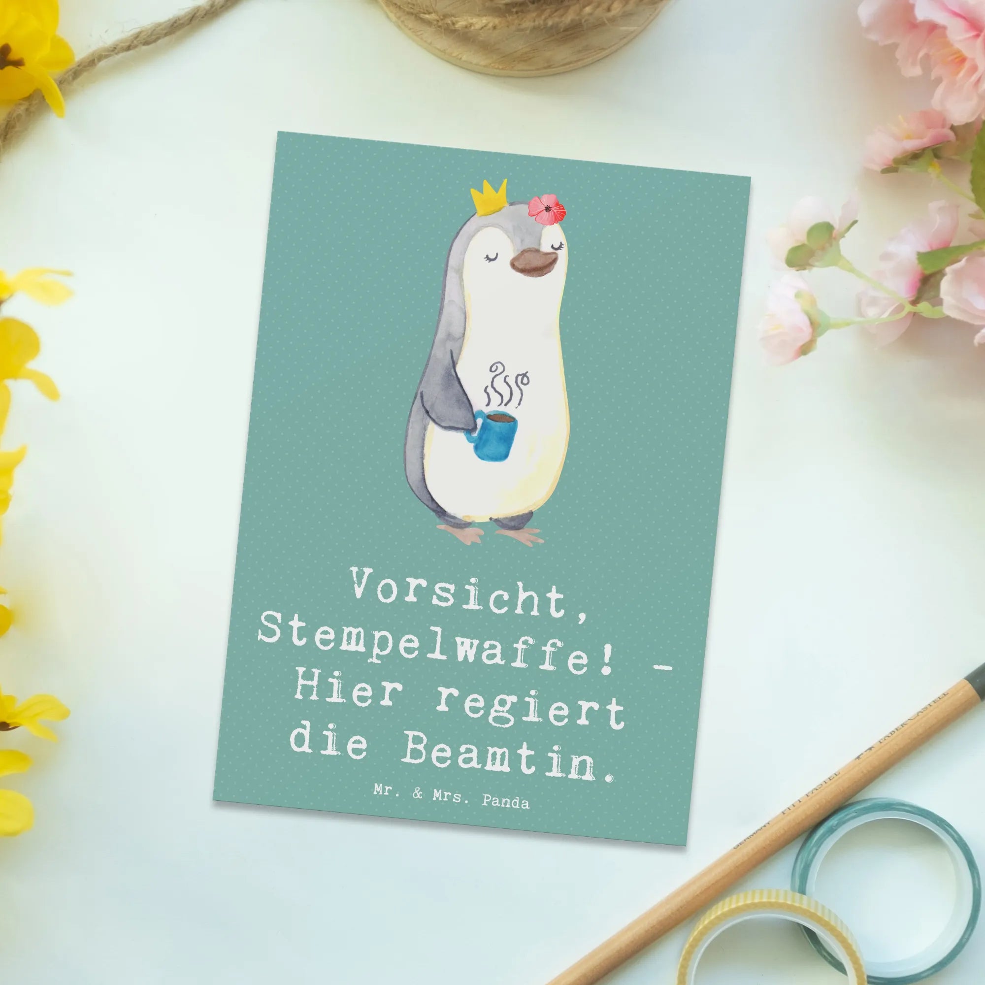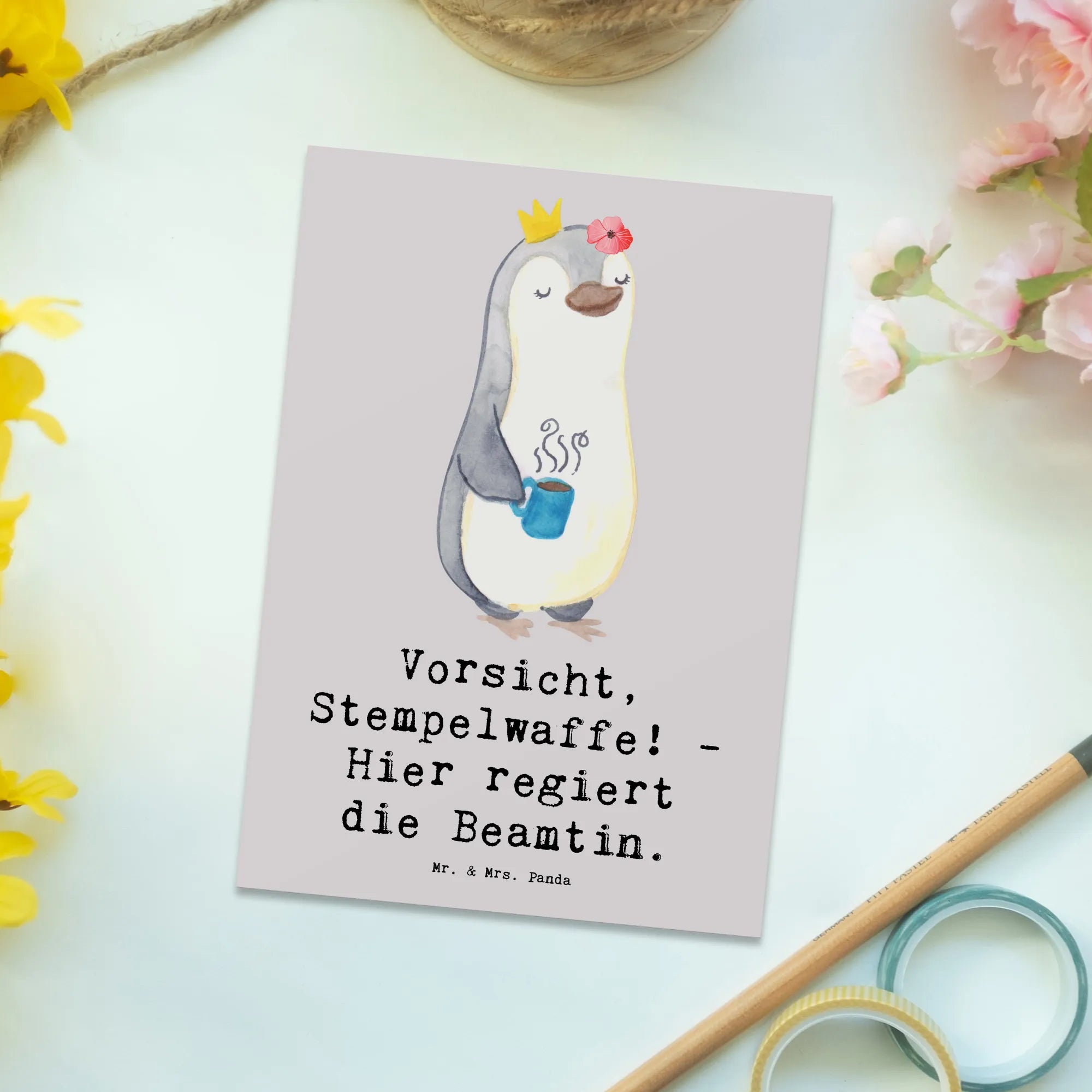 Suchst Du nach einer perfekten Geschenkidee für Deine Lieblingsbeamtin oder Beamten? Dann ist die Postkarte mit dem witzigen Motiv "Vorsicht, Stempelwaffe! - Hier regiert die Beamtin." aus der einzigartigen Berufe Kollektion von Mr. & Mrs. Panda genau das Richtige!
