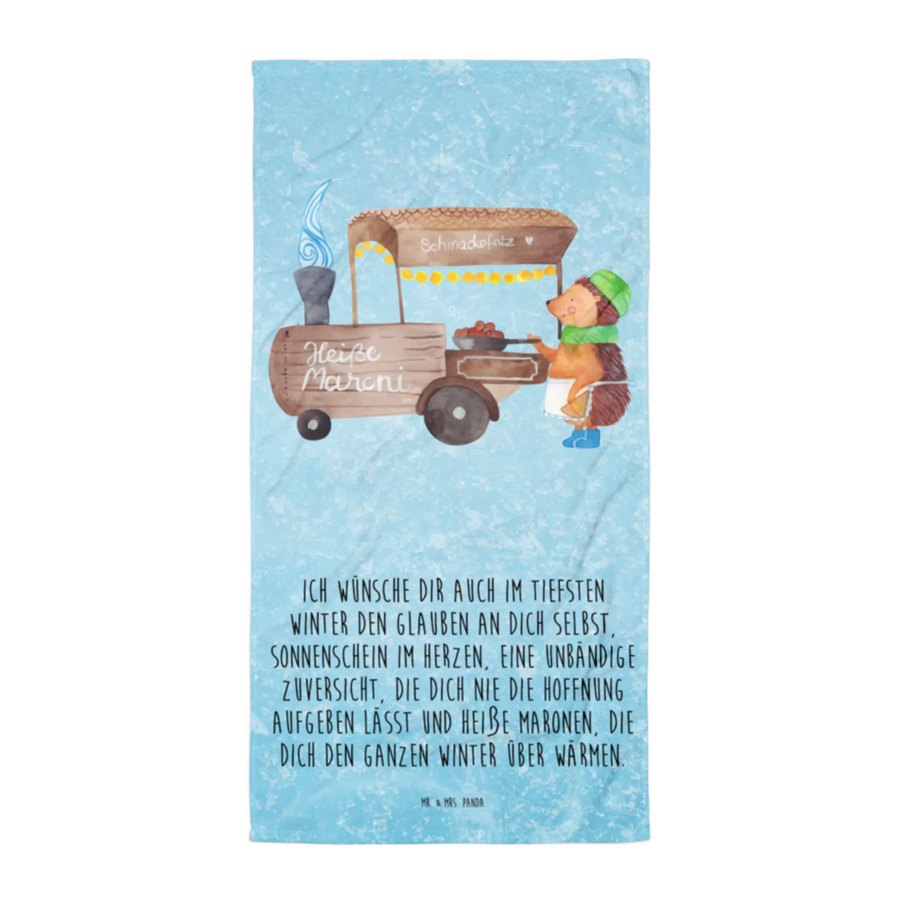 Das XL Badehandtuch 'Igel Maronen' aus der zauberhaften Winter Kollektion von Mr. & Mrs. Panda ist der perfekte Begleiter für die kalte Jahreszeit. Mit seinem originellen Motiv eines kleinen Igels in schimmernden blauen Stiefeln und einem grünen Schal, der schmackhafte heiße Maronen verkauft, zaubert es ein Lächeln auf dein Gesicht und bringt den Winterzauber direkt zu dir nach Hause.