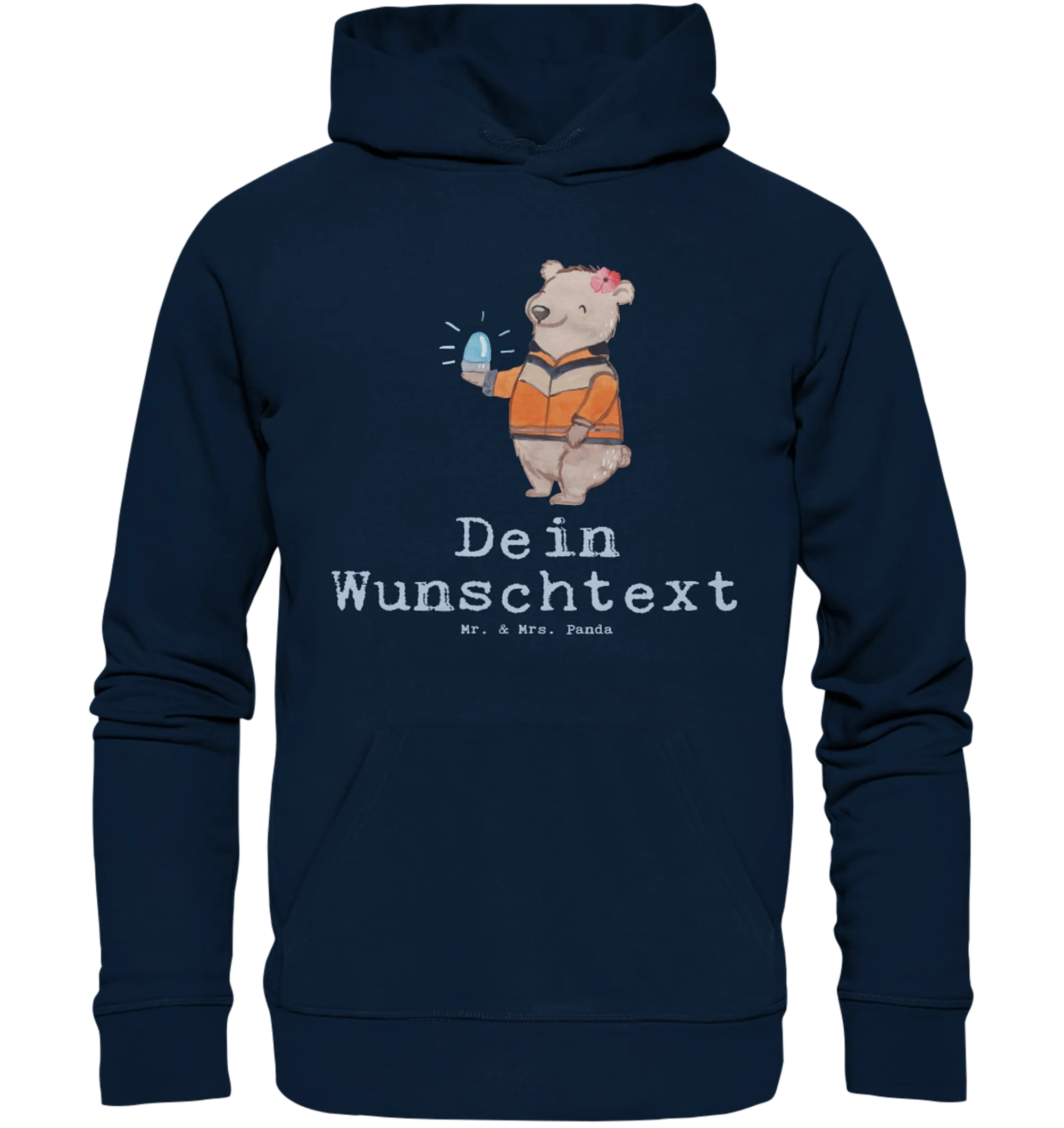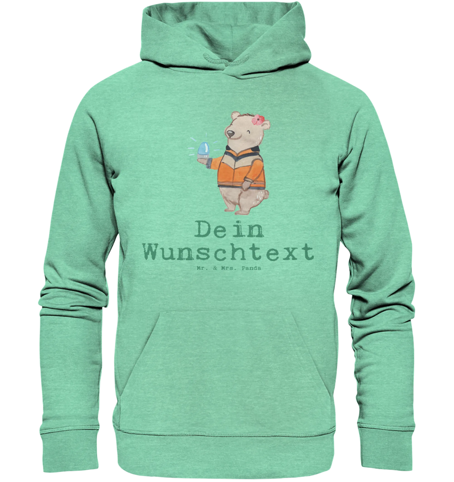 Der Hoodie ist aus 85 % Bio-Baumwolle und 15 % recyceltem Polyester gefertigt, was ihn nicht nur extrem weich und gemütlich macht, sondern auch umweltfreundlich. Ob zur Beförderung, zum Jubiläum oder einfach als herzlichen Dank für die tolle Arbeit – dieser Hoodie wird mit einem süßen, weiblichen Bären bedruckt, der wie eine Rettungssanitäterin aussieht und ein Blaulicht in der Hand hält.