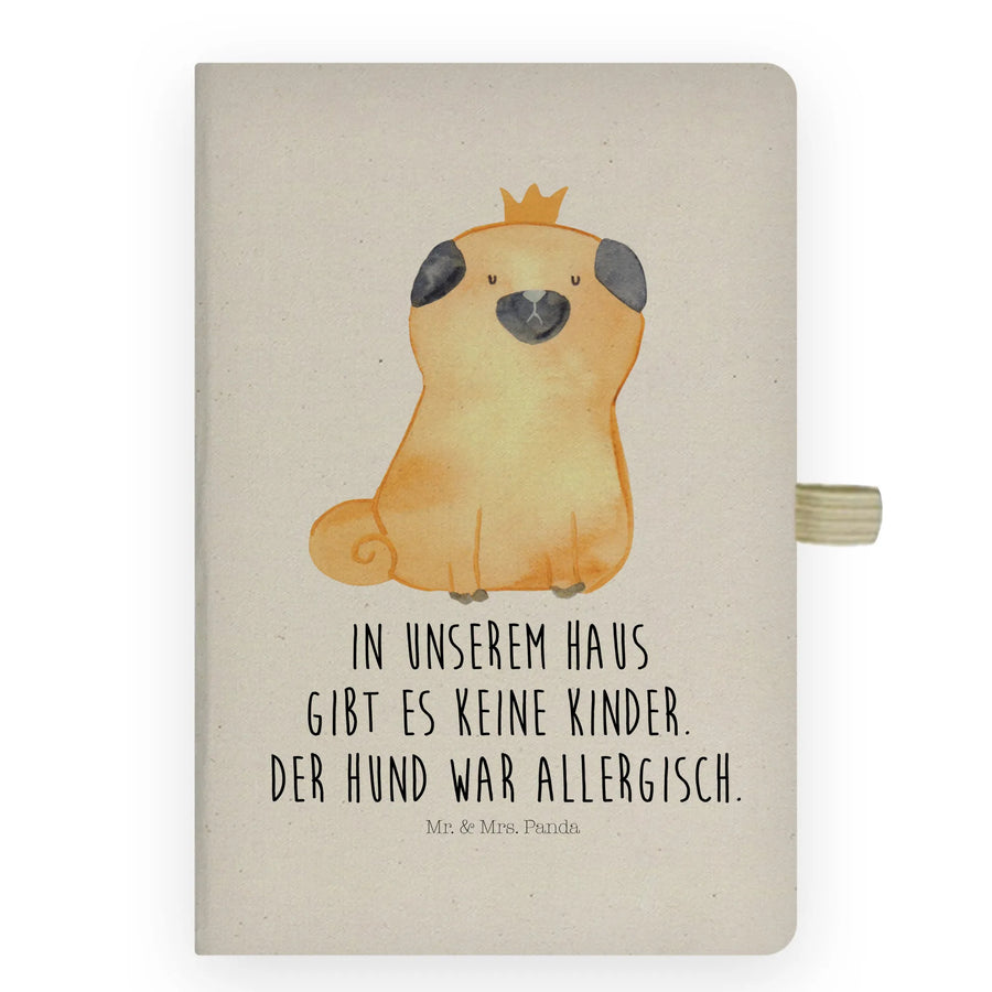Für alle Mops-Liebhaber und Hundebesitzer: Das DIN A5 Baumwoll Notizbuch „Mops Krone" aus der Hunde Kollektion von Mr. & Mrs. Panda vereint Humor, Stil und Alltagstauglichkeit. Auf dem Cover sitzt ein stolzer Mops mit Krone und dem frechen Spruch "In unserem Haus gibt es keine Kinder. Der Hund war allergisch." – ein Design, das sofort ins Herz und ins Auge fällt.