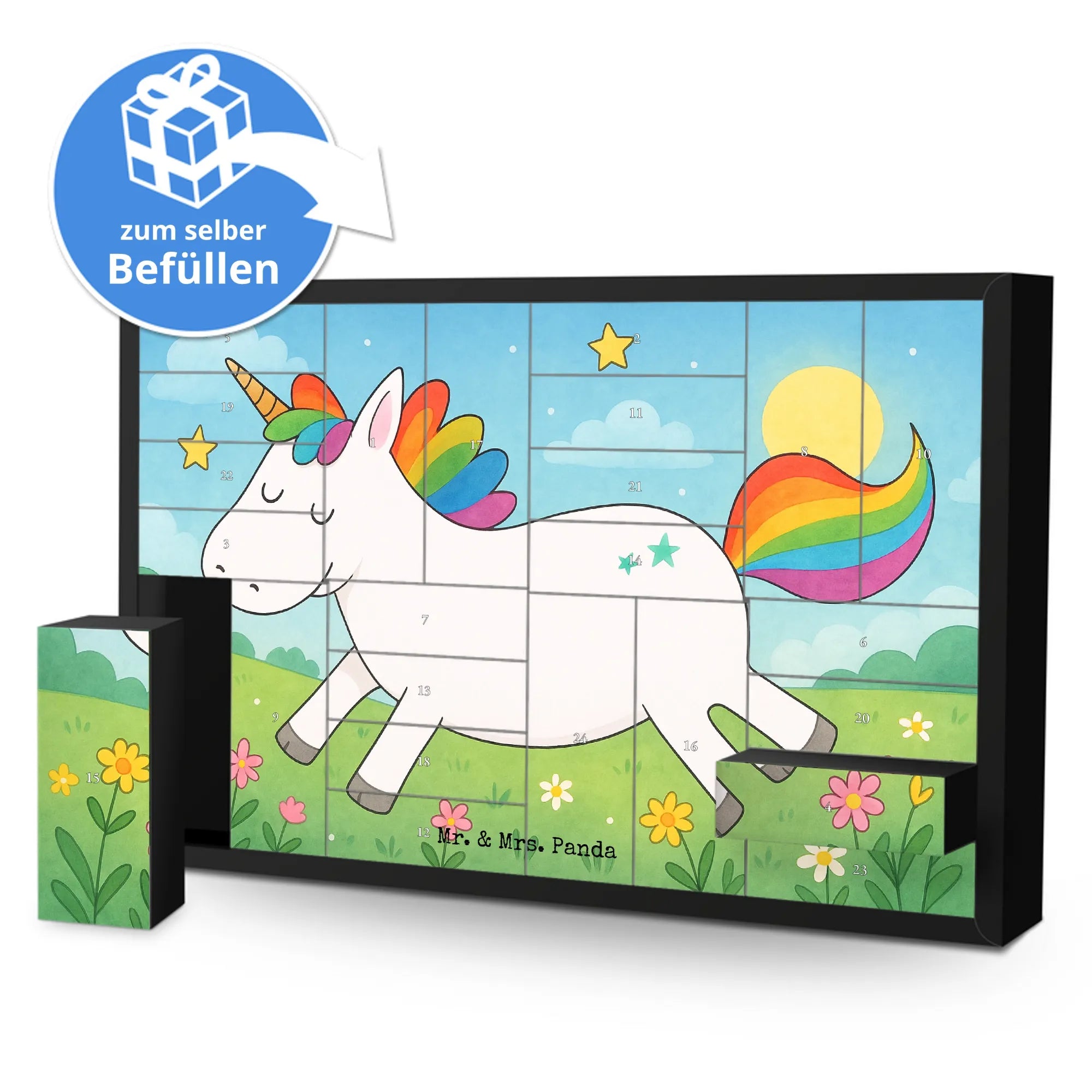 Schenke Lebensfreude, Spaß und ein bisschen Unicorn-Magie – mit dem befüllbaren Adventskalender Einhorn Happy aus der Einhorn - Kollektion von Mr. & Mrs. Panda.