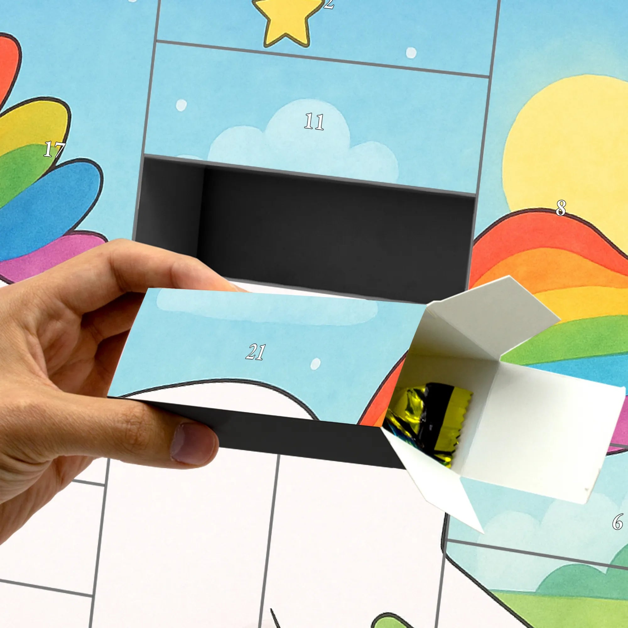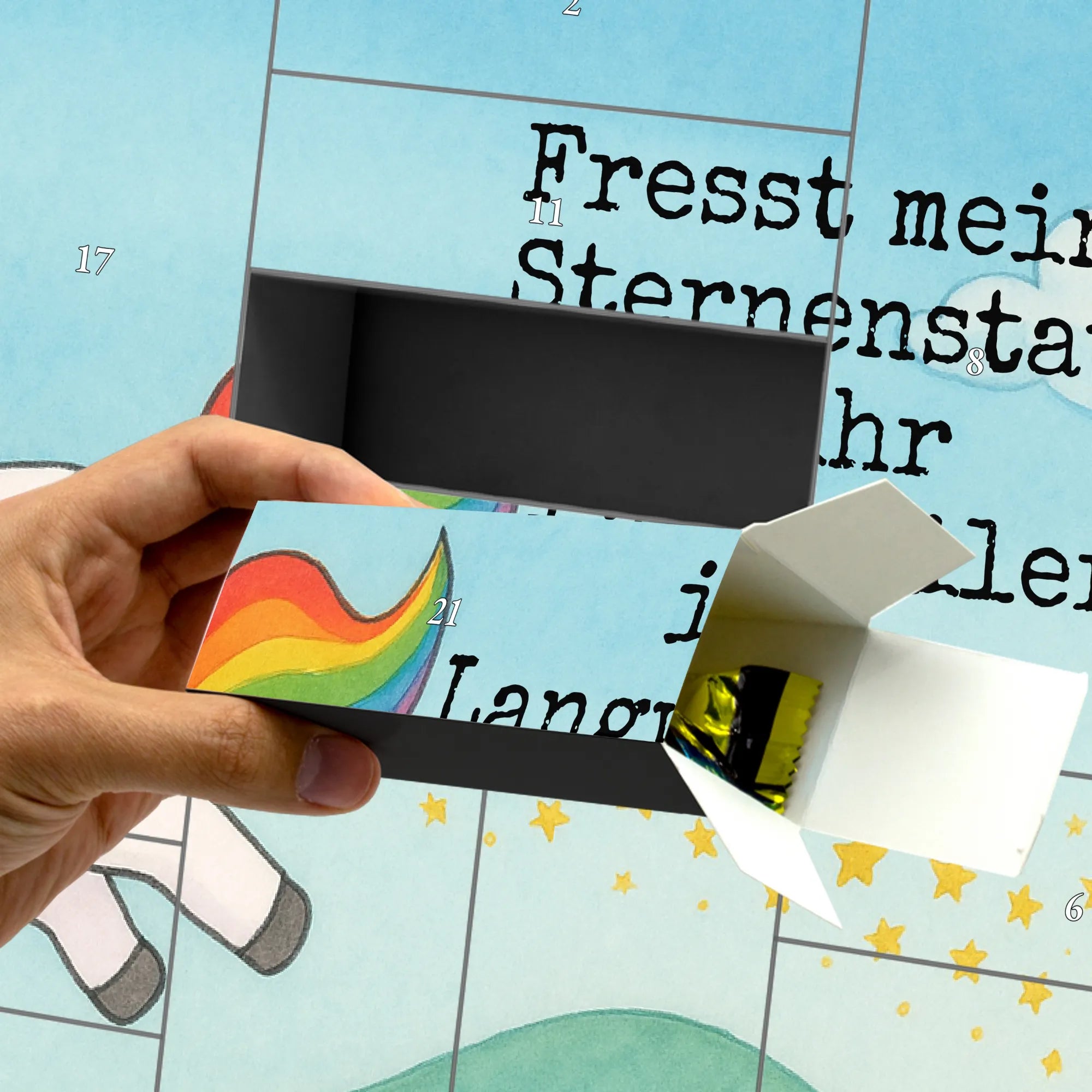 Mit 24 Schachteln zum Selbstbefüllen gestaltest du jeden Adventstag individuell: Schokolade, kleine Botschaften oder persönliche Überraschungen – alles ist möglich. Die brillante Druckqualität und die seidenmatte Oberfläche lassen die Farben der Einhorn-Mähne leuchten und machen den Kalender zu einem echten Hingucker in jedem Wohnzimmer oder Kinderzimmer.