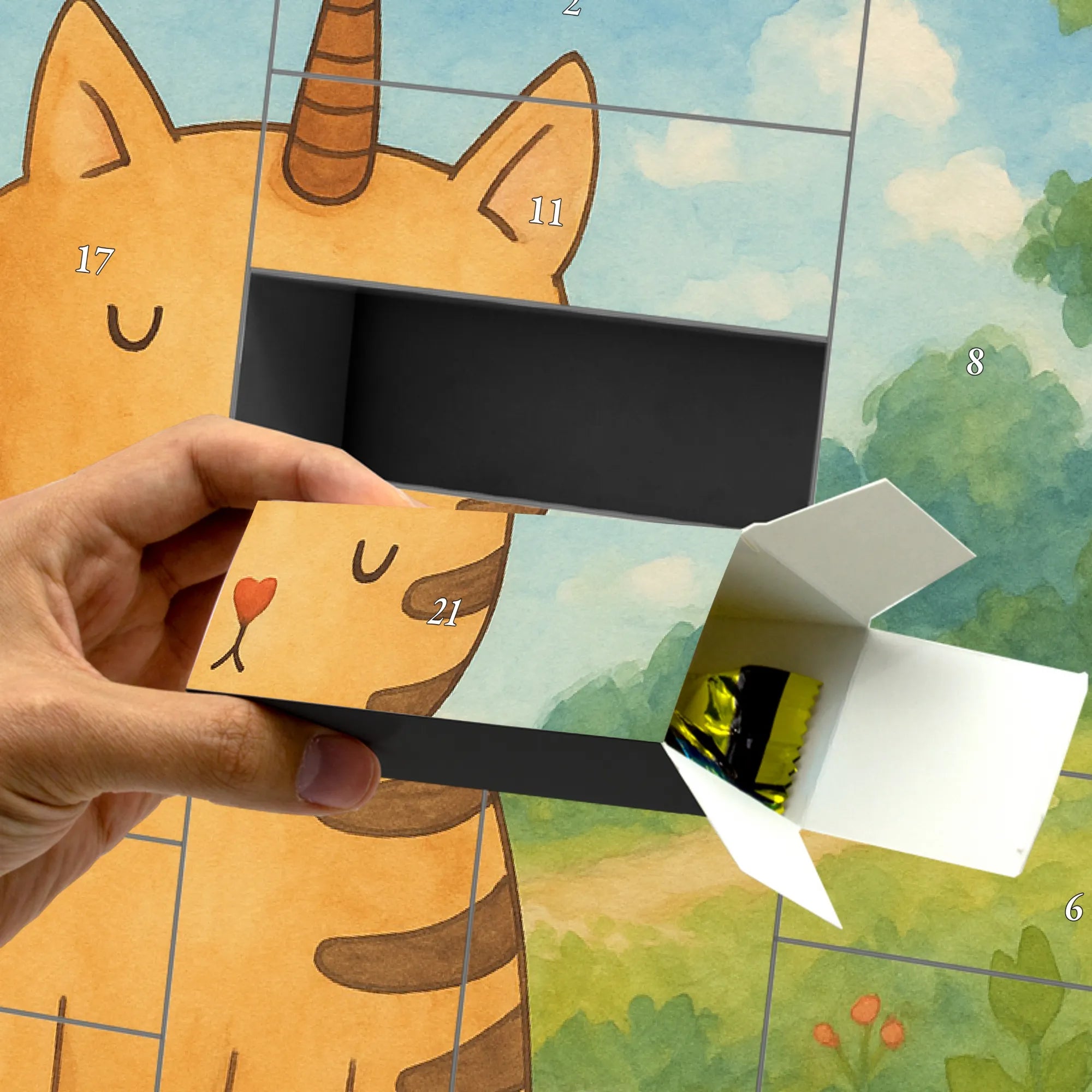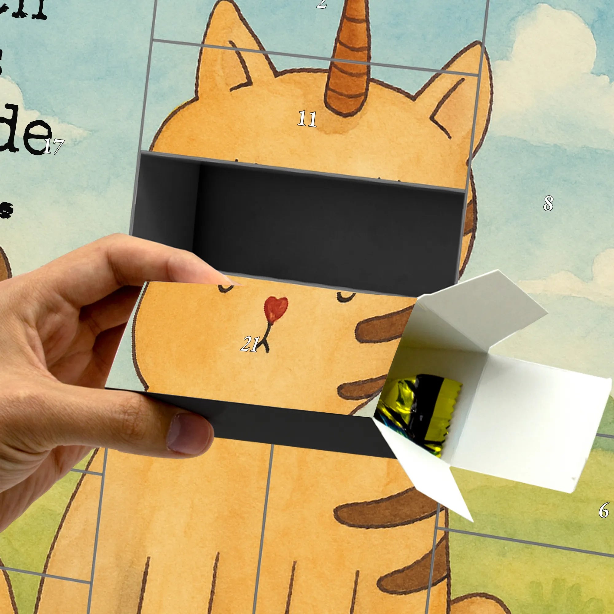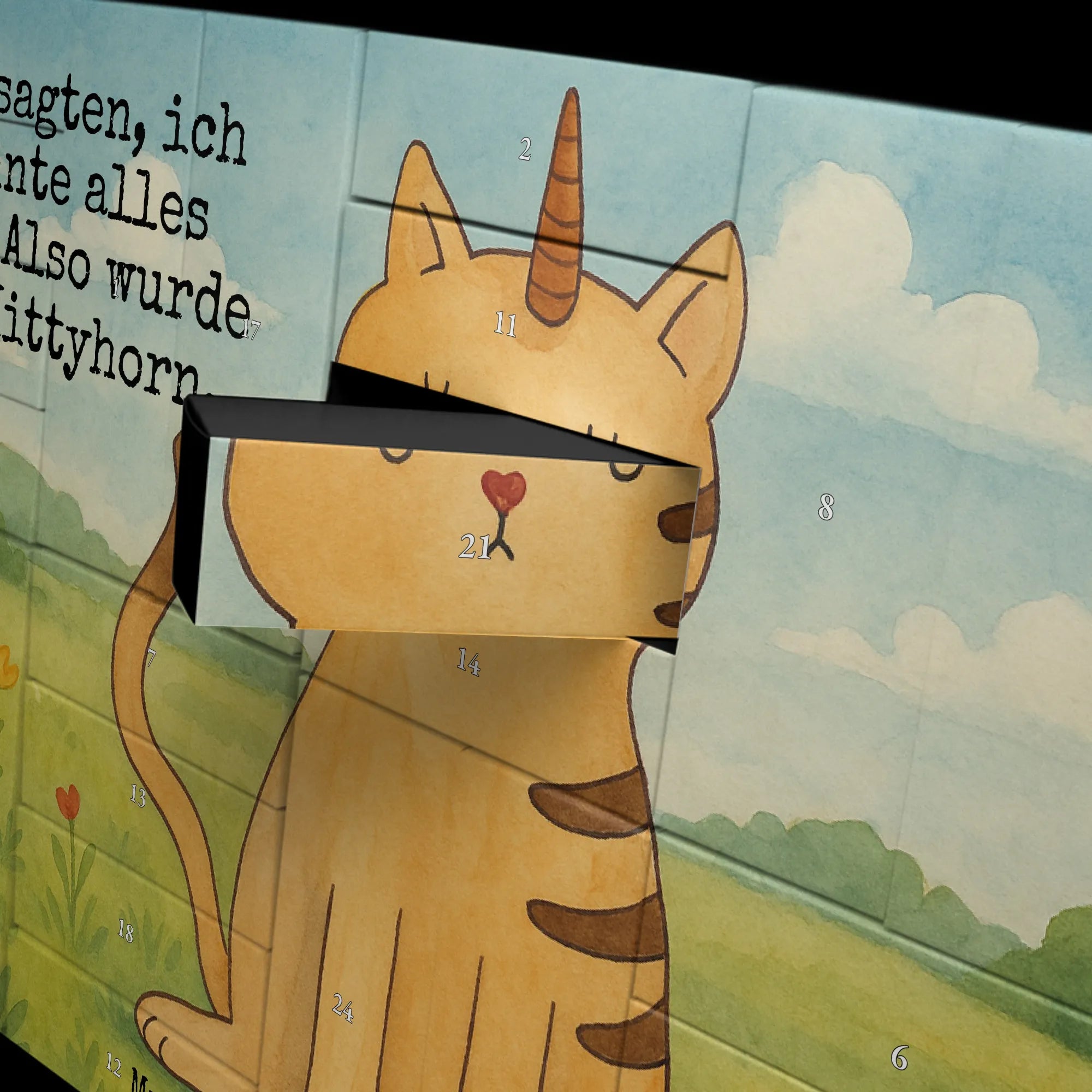 Ein zauberhafter Start in den Dezember: Unser befüllbarer Adventskalender Einhorn Katze von Mr. & Mrs. Panda vereint die Magie der Einhörner mit der verspielten Niedlichkeit von Katzen. Die liebevoll von Mrs. Panda handgezeichnete Illustration zeigt ein entzückendes Kittyhorn und bringt mit pastelligen Farben und brillanter Druckqualität jeden Raum zum Strahlen.