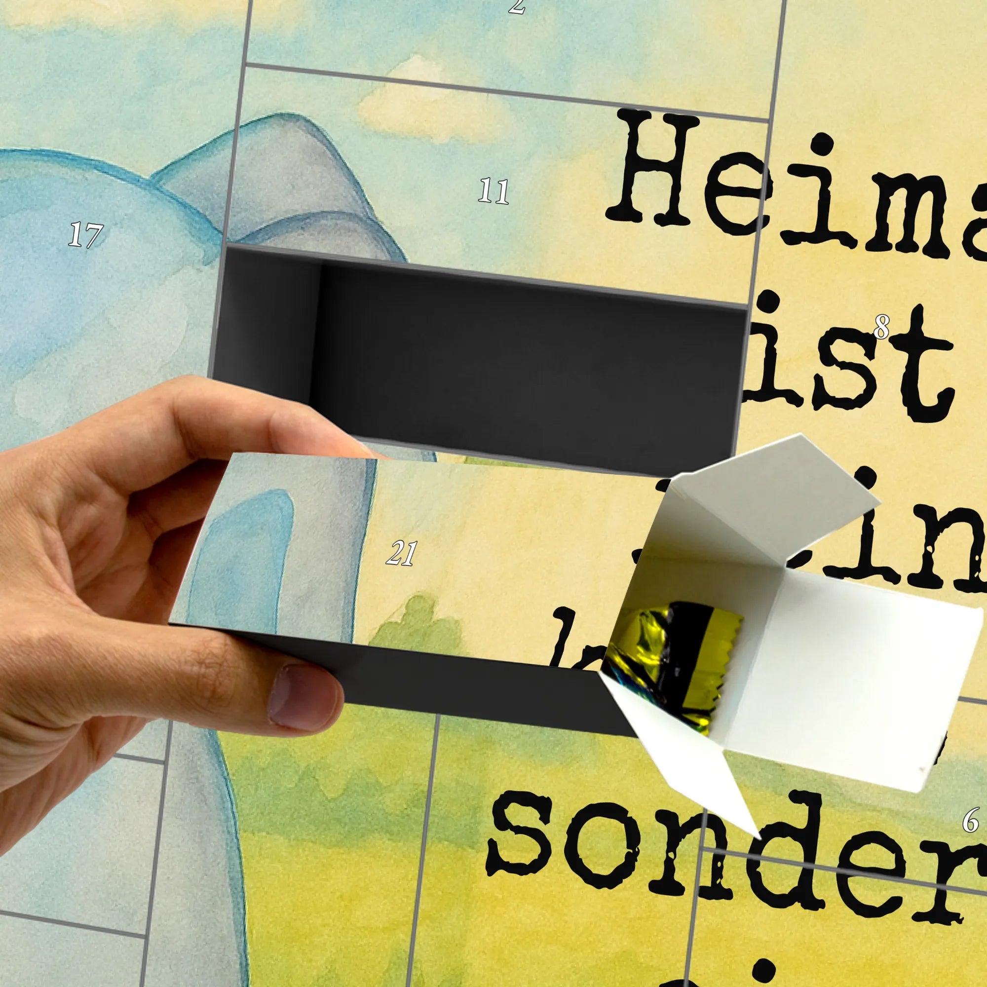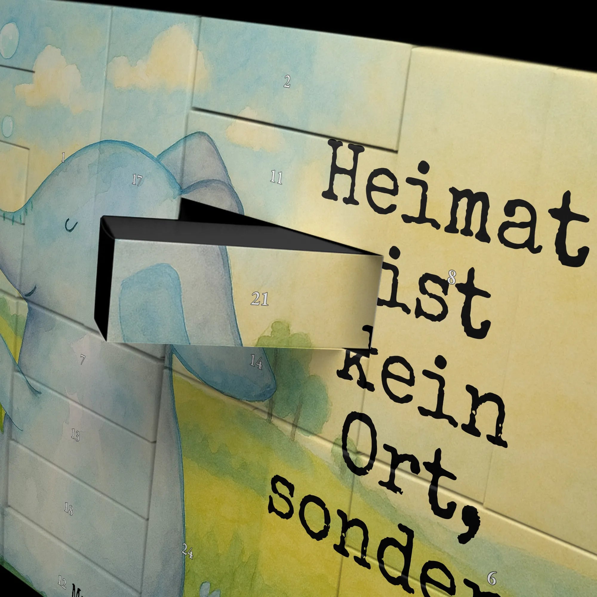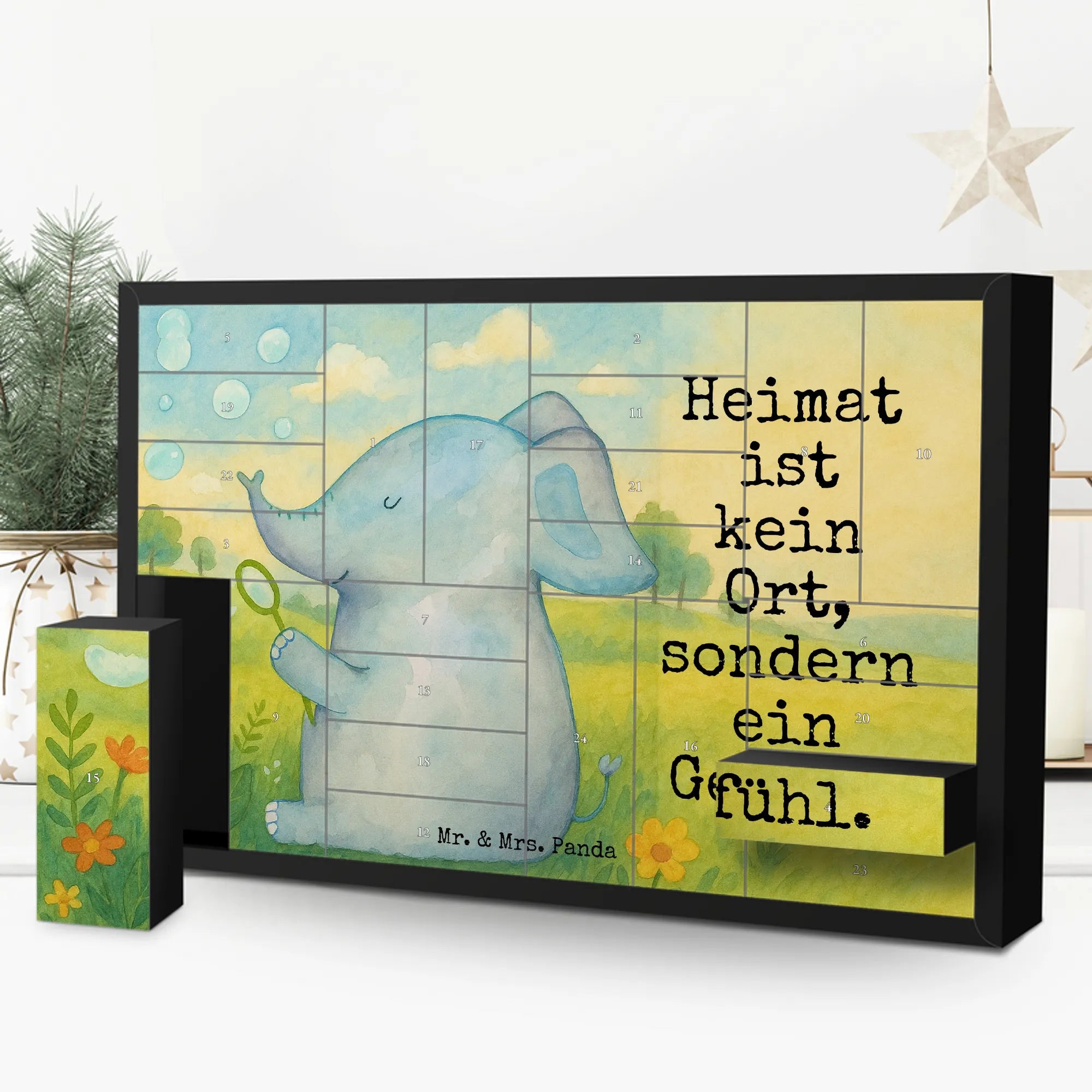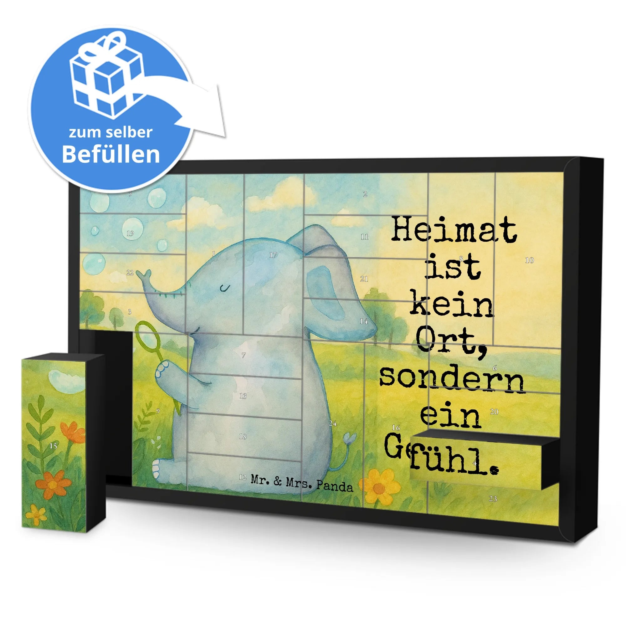 Mach die Adventszeit persönlich und voller Gefühl. Unser befüllbarer Adventskalender „Elefant Seifenblasen“ aus der Small World Kollektion von Mr. & Mrs. Panda bringt zauberhafte Vorfreude ins Zuhause. Die liebevolle Aquarellzeichnung von Mrs. Panda zeigt einen niedlichen Elefanten, der bunte Seifenblasen pustet – ein Motiv, das Leichtigkeit, Heimat und Liebe ausstrahlt. Der vollflächig aufgedruckte Slogan „Heimat ist kein Ort, sondern ein Gefühl.“ macht den Kalender zum perfekten Liebesbeweis oder zur liebevollen Geste für Freunde und Familie.