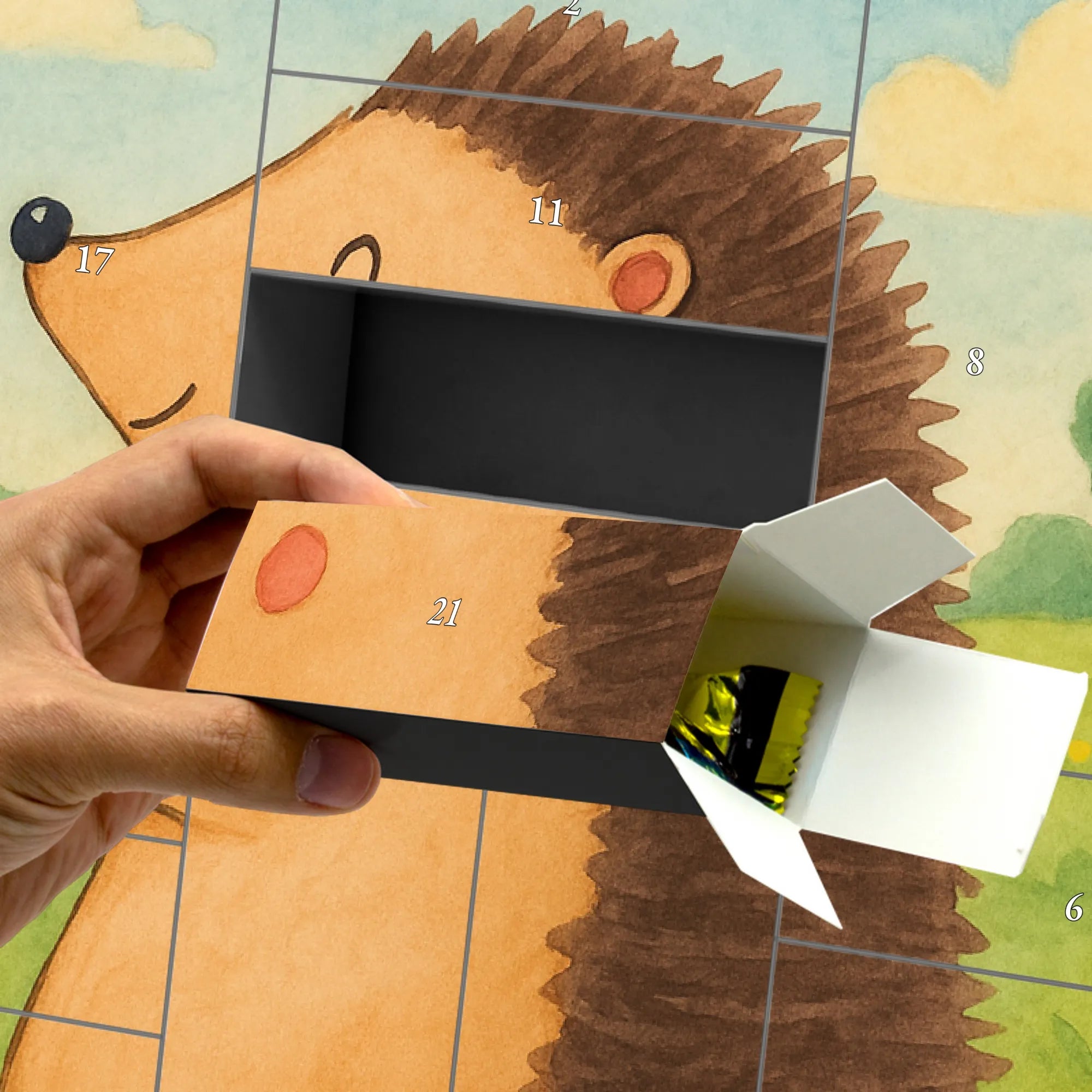 Unser fröhlicher Adventskalender zum Selbstbefüllen vereint liebevolle Illustration und praktische Funktionalität. Der putzige Igel mit roter Blume wurde von Mrs. Panda handgezeichnet und bringt sofort gute Laune in die Adventszeit. Ob als Adventskalender für Kinder, als Geschenk für Tierliebhaber oder als kleine Aufmerksamkeit bei Krankheit und Krankenhausbesuch – dieses Motiv tröstet und zaubert ein Lächeln.
