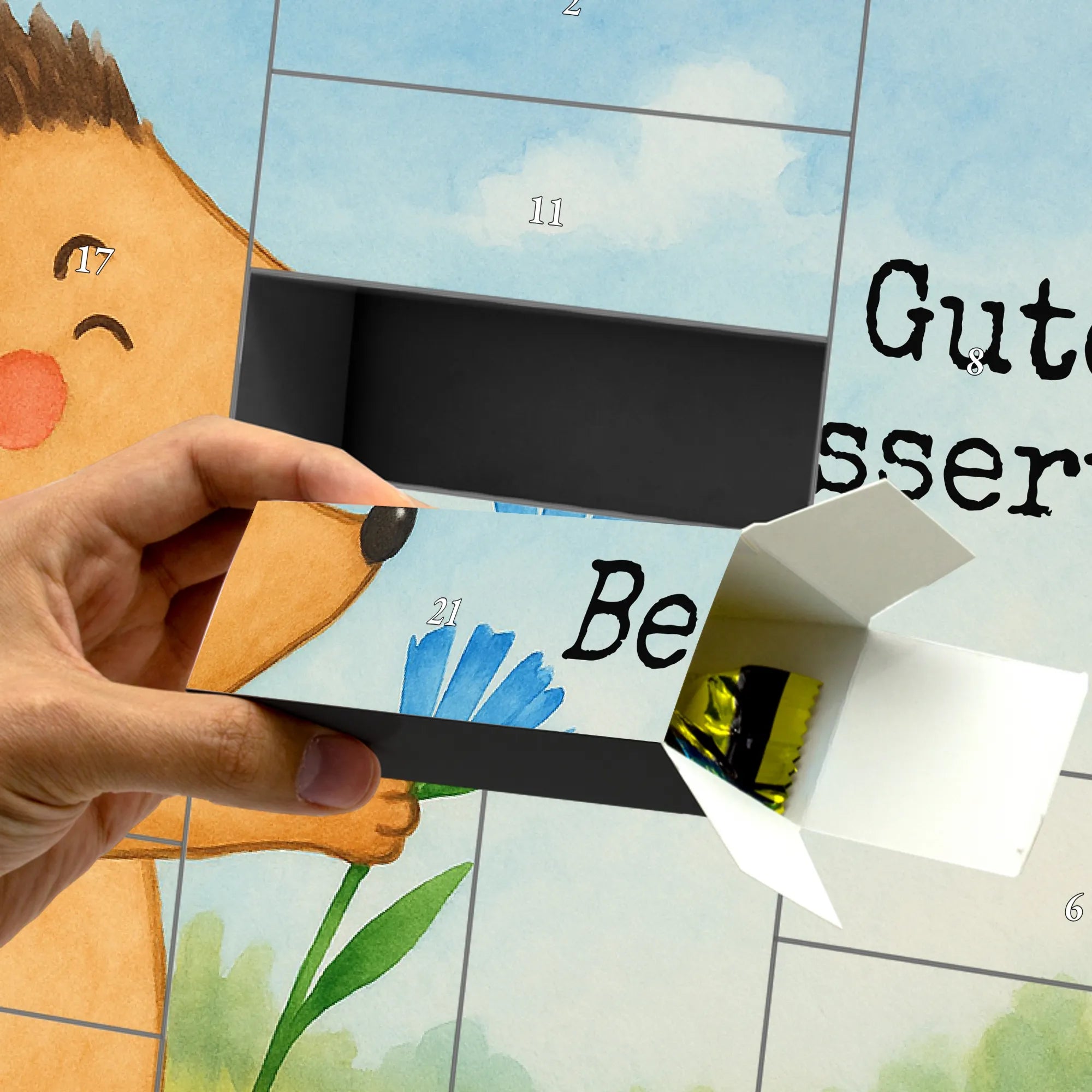 Der Kalender bietet 24 kleine Schachteln, die du individuell befüllen kannst – Schokolade, kleine Botschaften, Pflegeproben oder liebe Genesungswünsche finden hier Platz. Die seidenmatte Druckqualität macht das Motiv besonders edel und langlebig. Dank der beiliegenden Aufstellvorrichtung ist der Kalender schnell dekoriert und überall präsent: Wohnzimmer, Fensterbank oder neben dem Krankenhausbett.