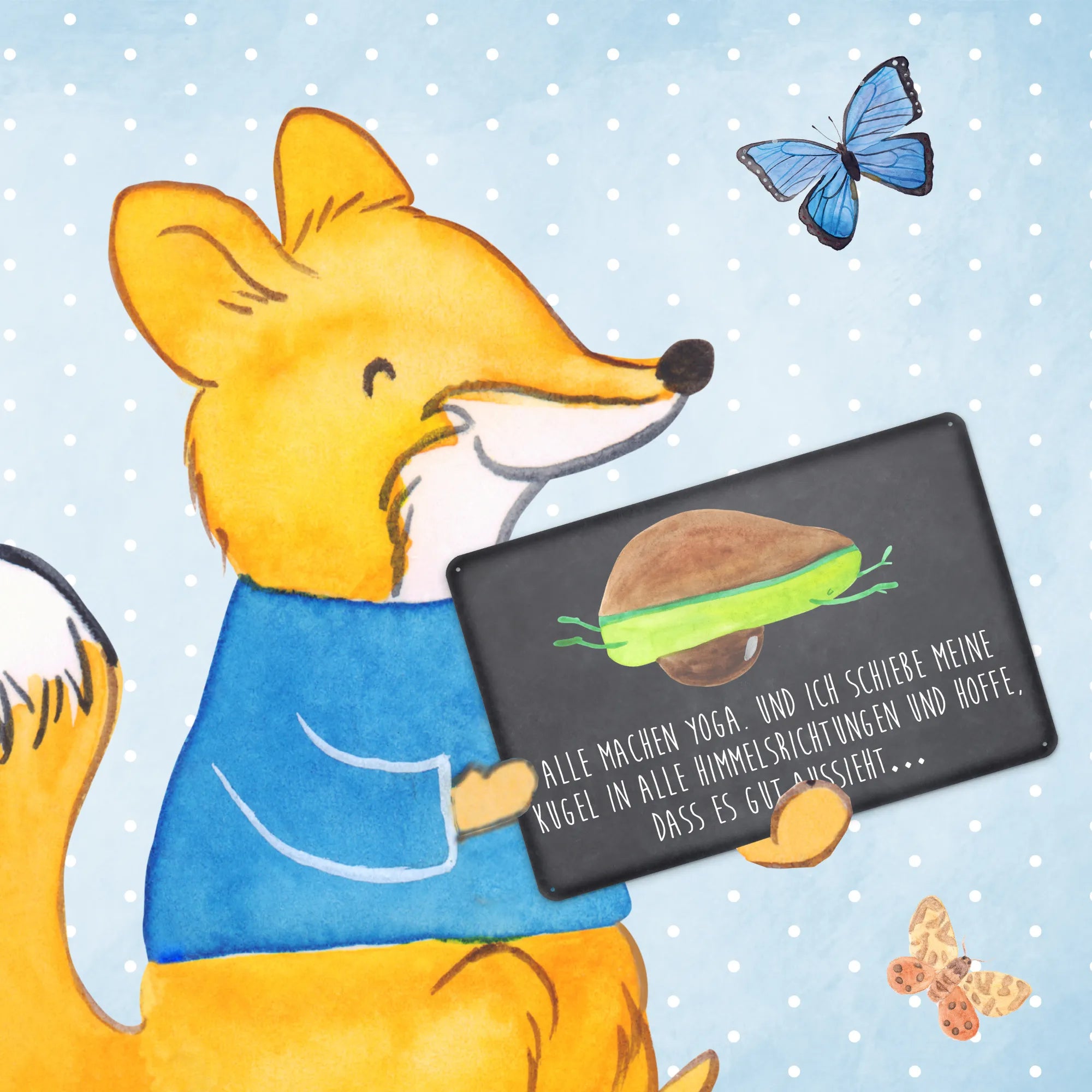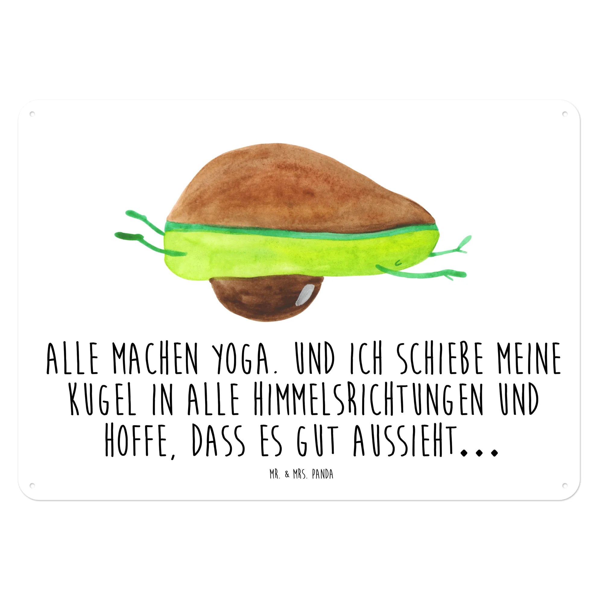Entdecke das charmante Blechschild Avocado Yoga von Mr. & Mrs. Panda! Dieses edle Schild aus hochwertigem Stahlblech verzaubert mit seinem süßen Motiv – einer kleinen, tollpatschigen Avocado, die versucht, Yoga zu machen. Auf dem Schild steht der humorvolle Spruch: 'Alle machen Yoga. Und ich schiebe meine Kugel in alle Himmelsrichtungen und hoffe, dass es gut aussieht…'.