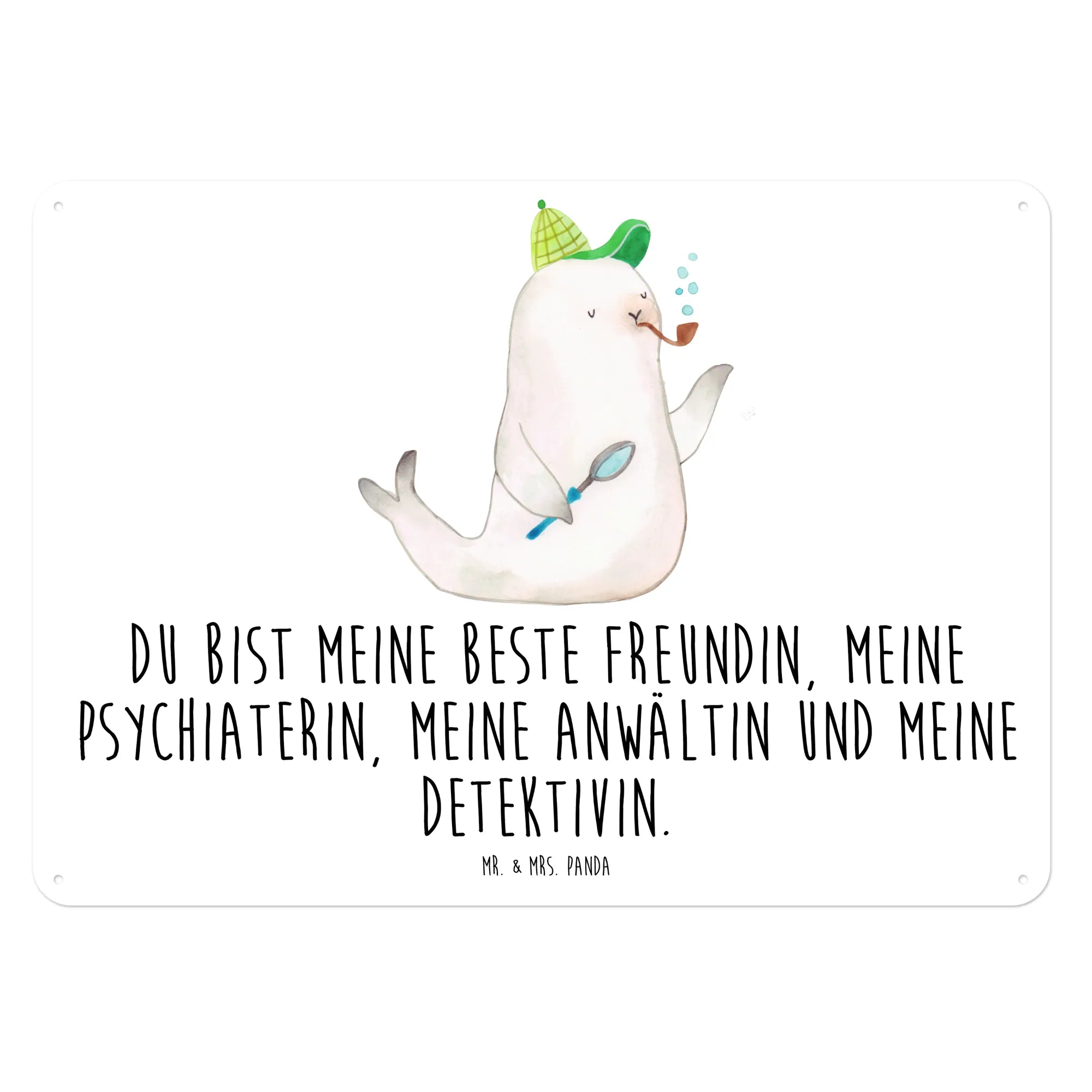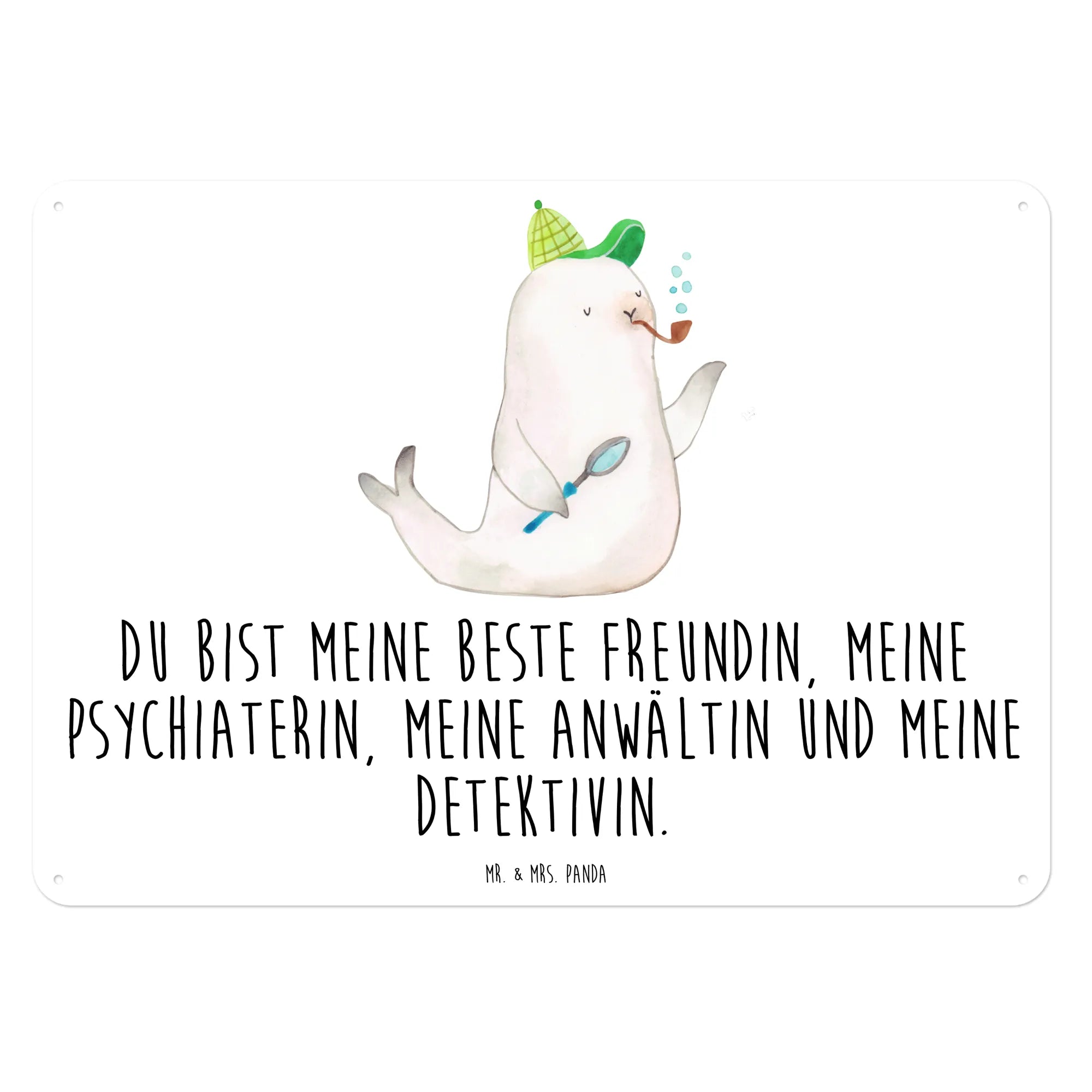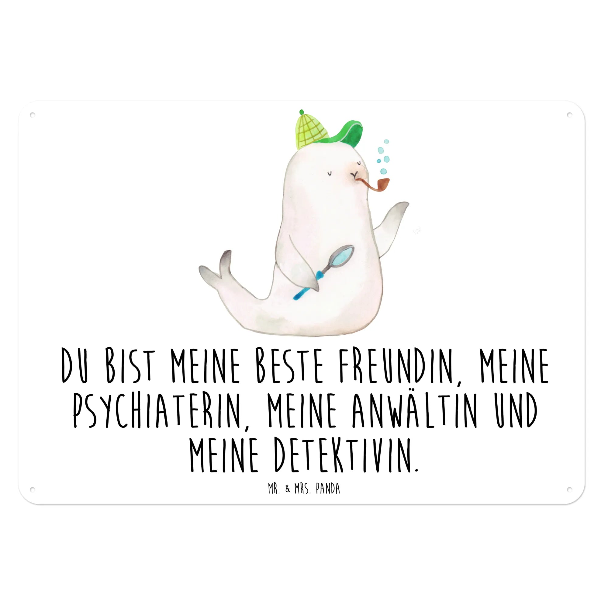 Entdecke das bezaubernde Blechschild mit dem süßen Motiv der Robbe Sherlock aus der Kollektion Small World von Mr. & Mrs. Panda! Mit dem Spruch "Du bist meine beste Freundin, meine Psychiaterin, meine Anwältin und meine Detektivin" bringt dieses Schild ein Lächeln auf jedes Gesicht. Das hochwertige Stahlblech wird durch einen edlen, langlebigen Druck veredelt, der die Farben strahlen lässt und die Details scharf zur Geltung bringt.