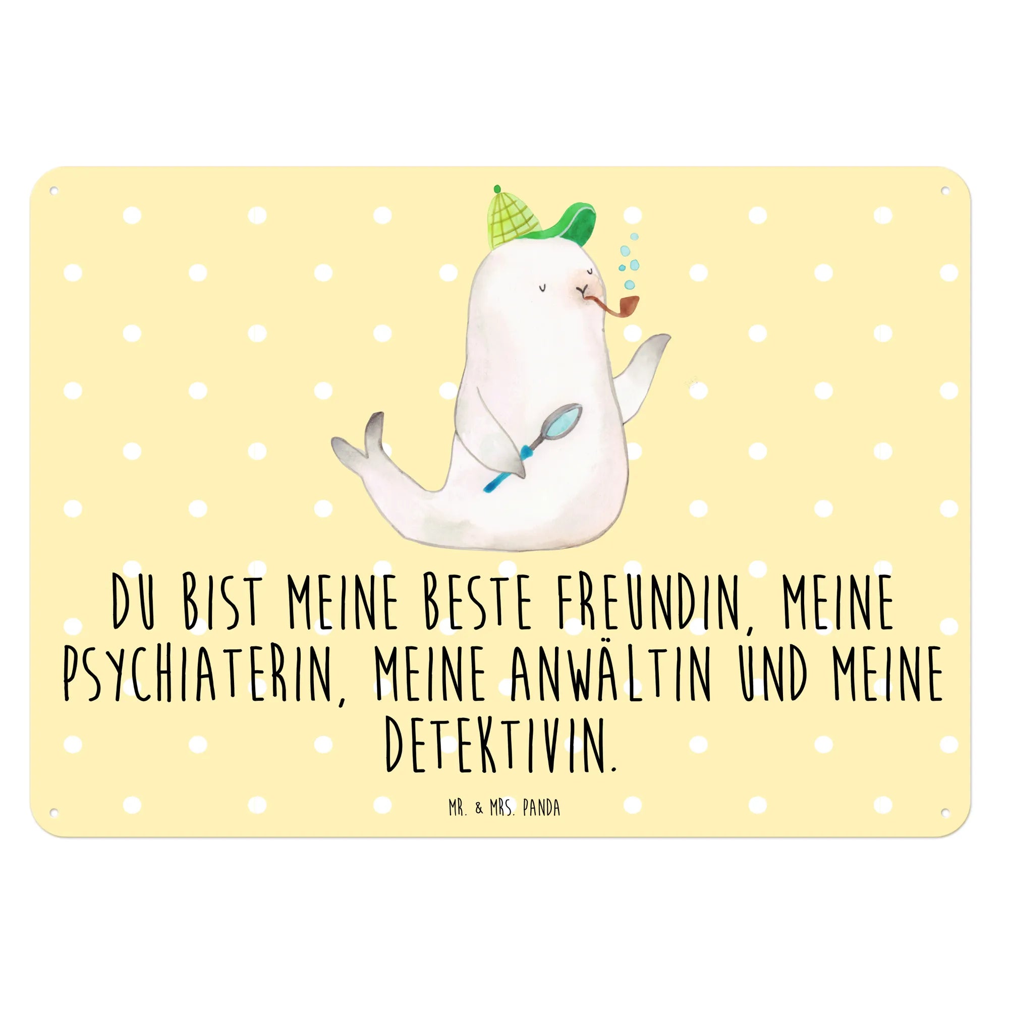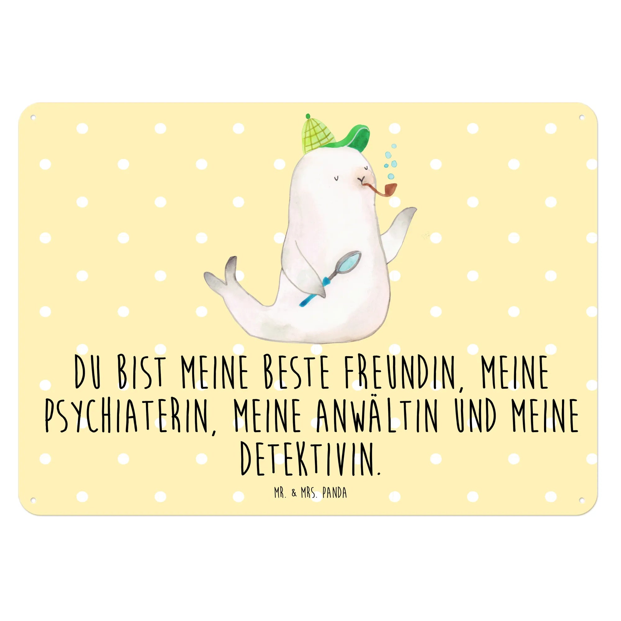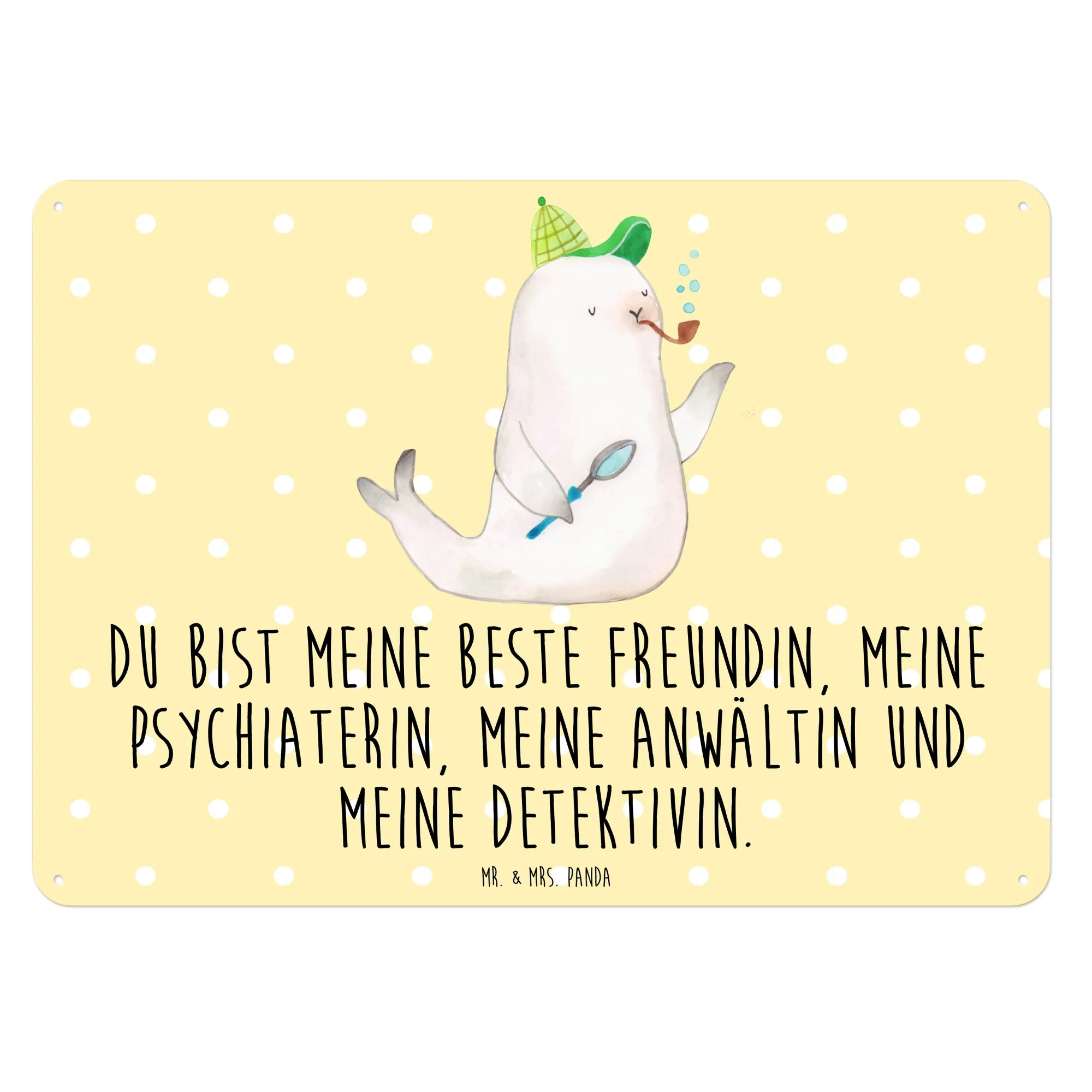 Entdecke das bezaubernde Blechschild mit dem süßen Motiv der Robbe Sherlock aus der Kollektion Small World von Mr. & Mrs. Panda! Mit dem Spruch "Du bist meine beste Freundin, meine Psychiaterin, meine Anwältin und meine Detektivin" bringt dieses Schild ein Lächeln auf jedes Gesicht. Das hochwertige Stahlblech wird durch einen edlen, langlebigen Druck veredelt, der die Farben strahlen lässt und die Details scharf zur Geltung bringt.