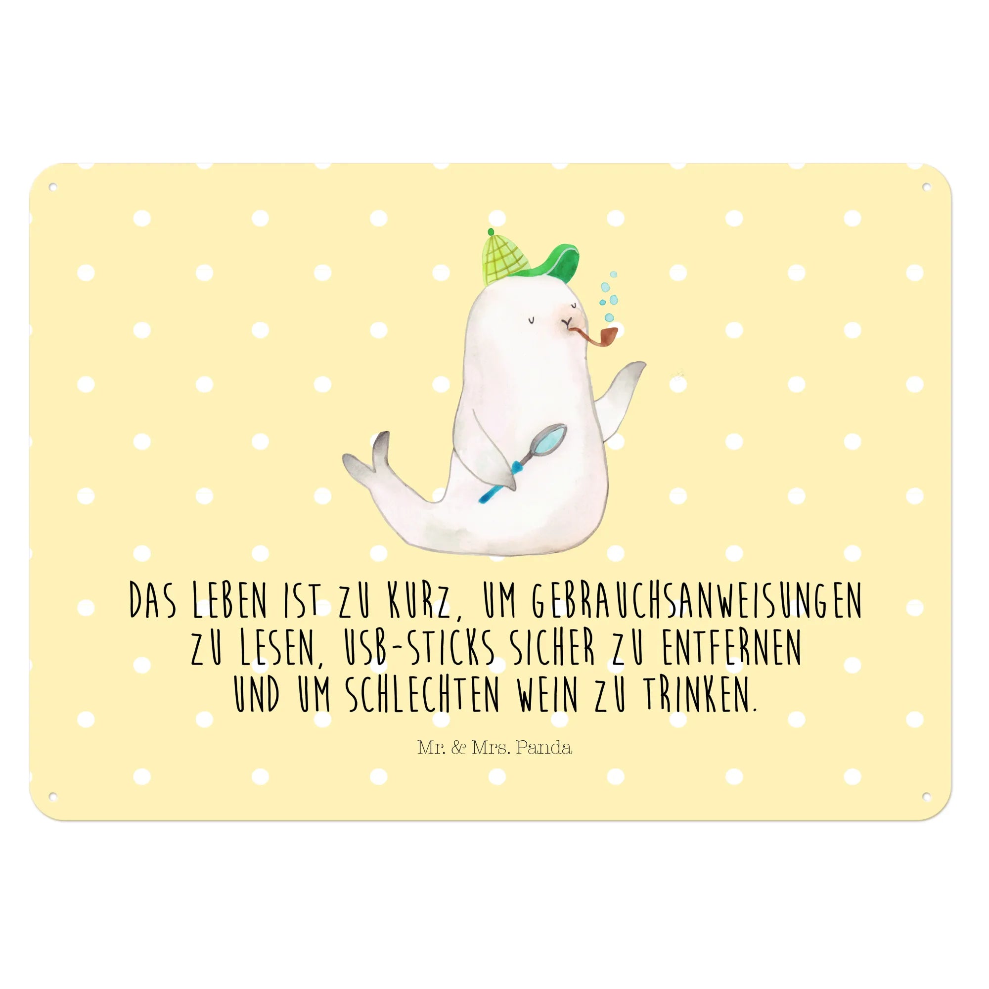 Das Blechschild "Robbe Sherlock" aus der Kollektion Small World von Mr. & Mrs. Panda ist das perfekte Geschenk für all diejenigen, die einen Hauch von Humor und niedlichen Tieren in ihrem Zuhause schätzen.