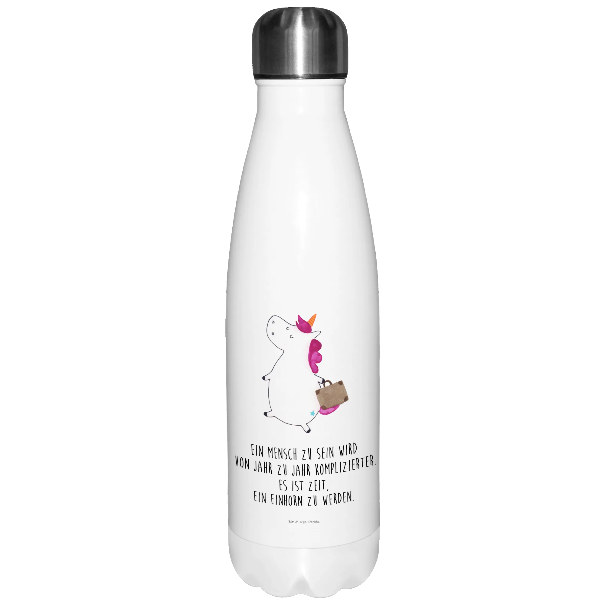 Diese liebevoll gestaltete Isolierflasche aus der Einhorn - Kollektion vereint praktischen Nutzen mit zauberhaftem Design. Das handgezeichnete Einhorn mit Koffer und der freche Spruch „Ein Mensch zu sein wird von Jahr zu Jahr komplizierter. Es ist Zeit, ein Einhorn zu werden.“ schenken dir jeden Tag ein Lächeln.