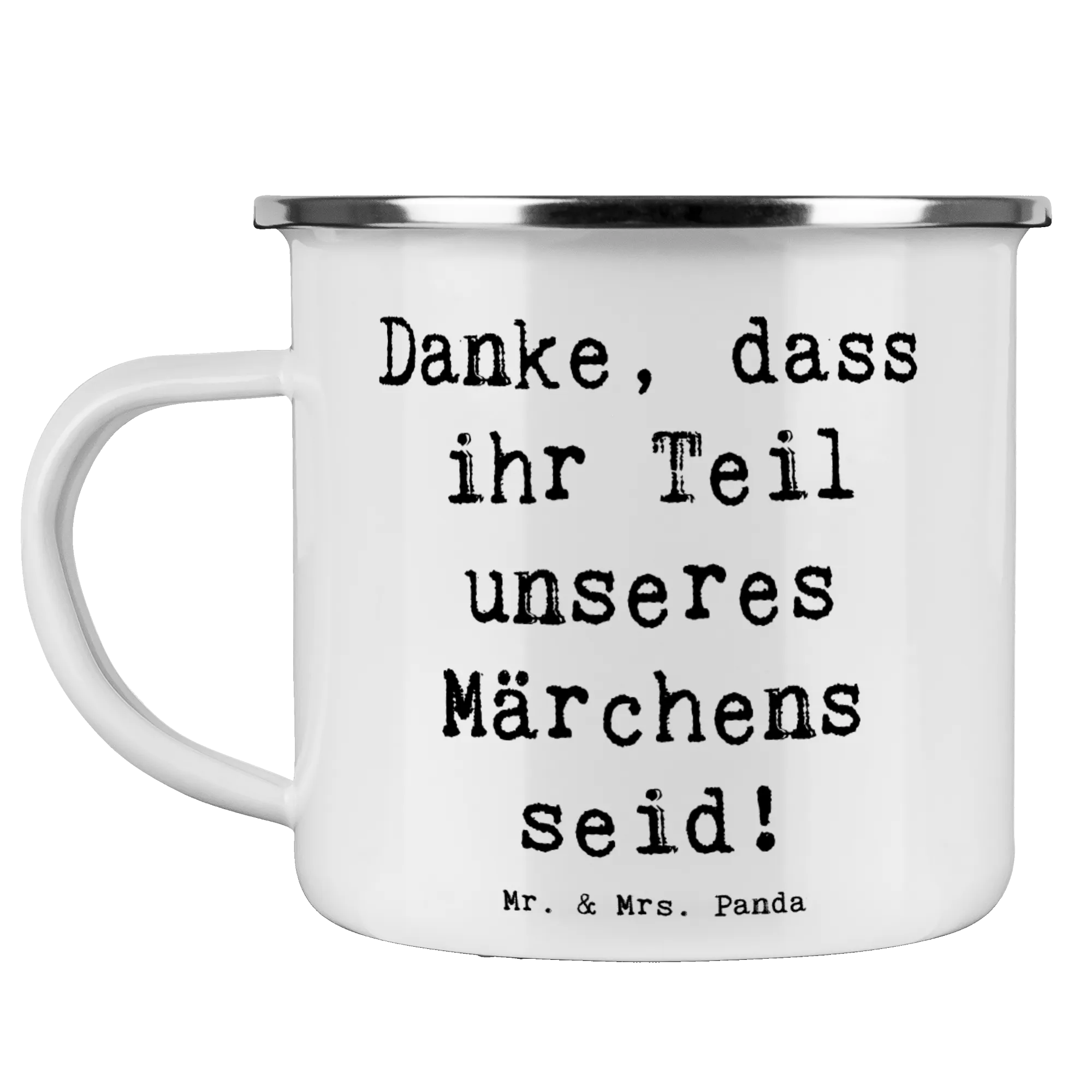 Die Camping Emaille Tasse von Mr. & Mrs. Panda ist das perfekte Geschenk für Hochzeiten und unvergessliche Momente im Freien! Mit dem liebevollen Spruch "Danke, dass ihr Teil unseres Märchens seid!" ist diese Tasse ein wunderbarer Begleiter für jeden Outdoor-Fan.