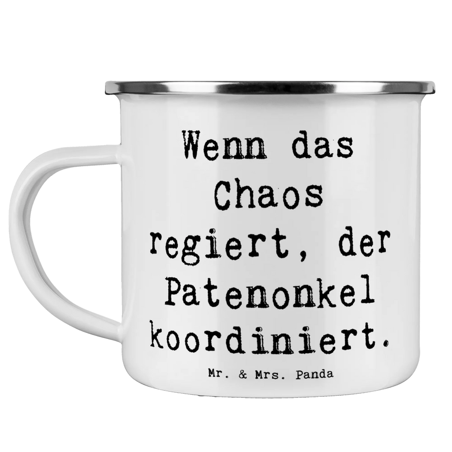 Die Camping Emaille Tasse 'Patenonkel' von Mr. & Mrs. Panda ist ein wahrhaft zauberhaftes Geschenk für jeden Patenonkel, der in seinem Alltag oft als Vertrauter und moralischer Führer agiert. Mit dem liebevollen Spruch 'Wenn das Chaos regiert, der Patenonkel koordiniert', kommt diese Tasse nicht nur in praktischer Form, sondern auch mit einer humorvollen Botschaft, die die besondere Rolle des Patenonkels würdigt.