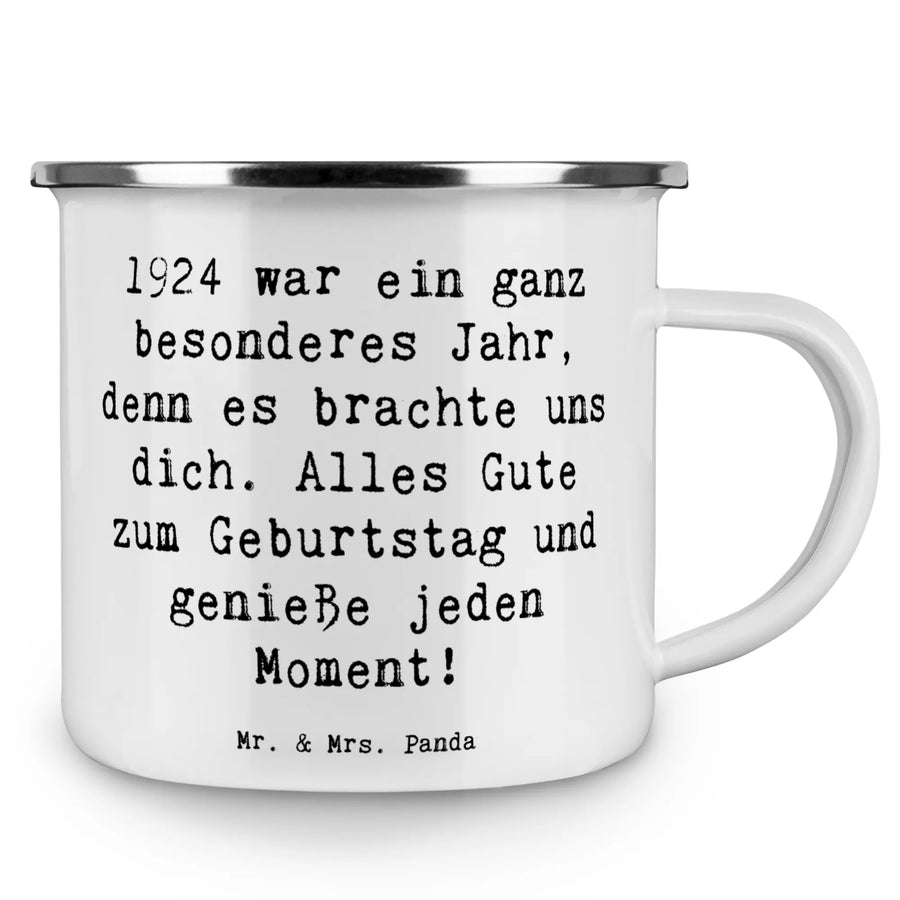 Die Camping Emaille Tasse mit dem besonderen Motiv '1924 Geburtstag' von Mr. & Mrs. Panda ist das perfekte Geschenk für alle, die in diesem Jahr das Licht der Welt erblickt haben. Ob beim Camping, Wandern oder einfach nur im Garten, diese Tasse ist ein treuer Begleiter. Mit einer Füllmenge von 300 ml bietet sie genug Platz für deinen Lieblingstee oder Kaffee. Ihr kratzfestes und korrosionsbeständiges Emaille-Material sorgt dafür, dass sie auch bei Outdoor-Abenteuern stets toll aussieht.