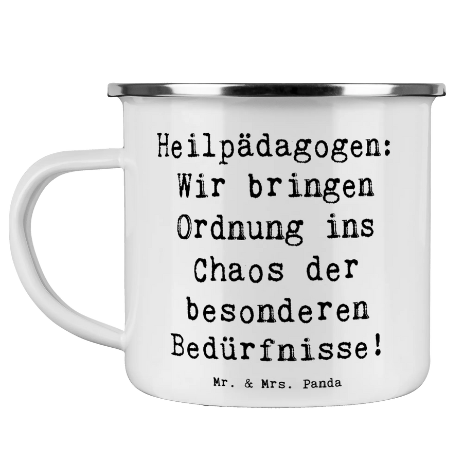 Die wunderschöne Camping Emaille Tasse der Heilpädagogin von Mr. & Mrs. Panda ist das perfekte Geschenk für alle, die im Bereich Heilpädagogik tätig sind oder sich dafür begeistern. Diese Tasse bringt nicht nur Freude, sondern auch eine liebevolle Botschaft mit sich. Bedruckt mit dem Spruch „Heilpädagogen: Wir bringen Ordnung ins Chaos der besonderen Bedürfnisse!“ ist diese Tasse ein kleiner Reminder, wie wichtig die Arbeit in der Heilpädagogik ist.