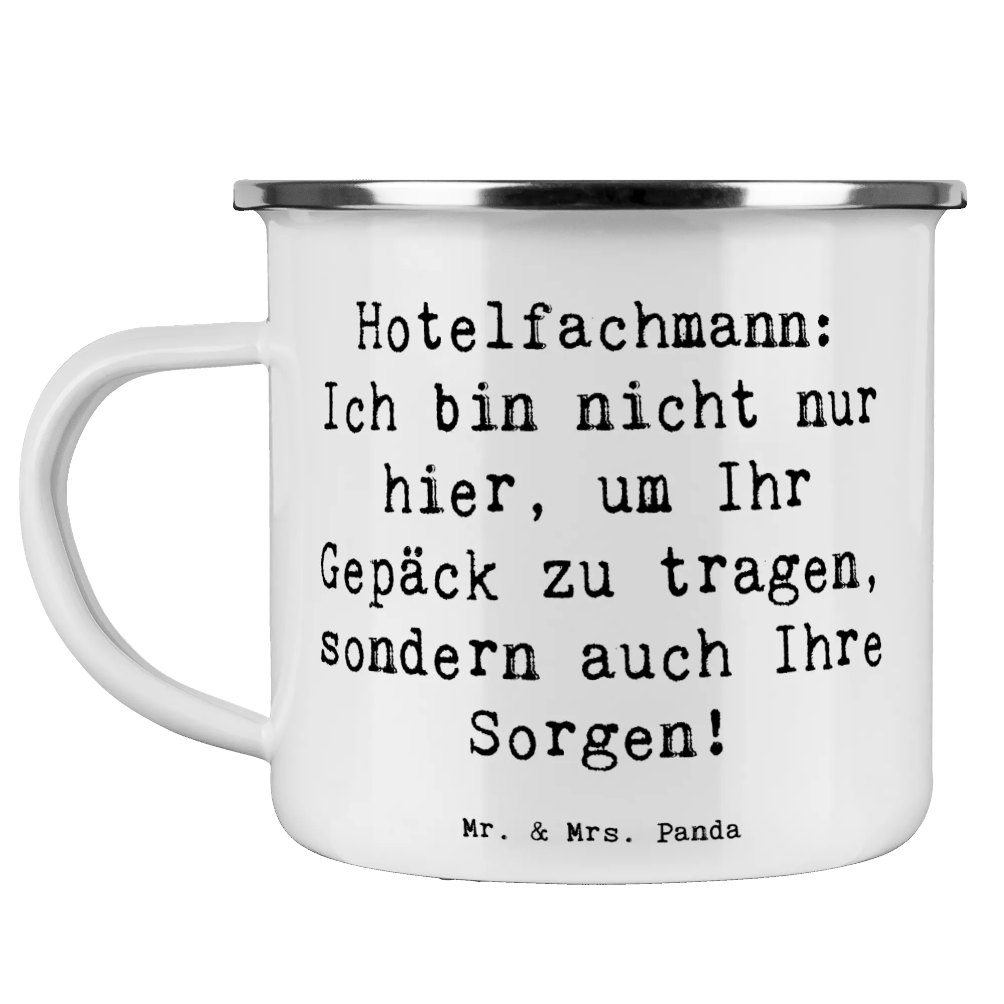 Camping Emaille Tasse Spruch Hotelfachmann: Ich bin nicht nur hier, um Ihr Gepäck zu tragen, sondern auch Ihre Sorgen!