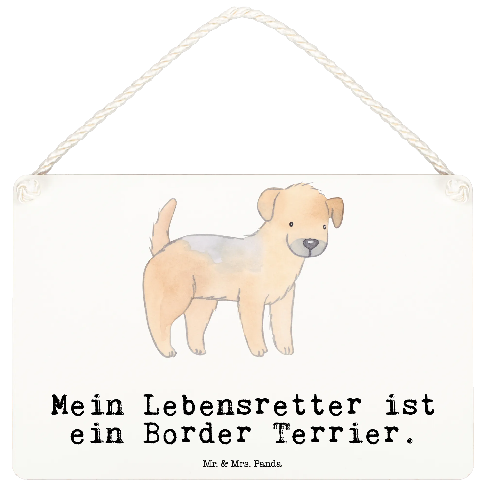 Das Deko Schild "Mein Lebensretter ist ein Border Terrier" von Mr. & Mrs. Panda ist die perfekte Dekoration für jeden Hundeliebhaber! Mit einem liebevoll illustrierten Border Terrier, der in sanften, aquarellierten Gelb- und Brauntönen strahlt, verkörpert dieses Schild nicht nur einen tollen Blickfang, sondern hält auch eine wunderschöne Botschaft bereit.