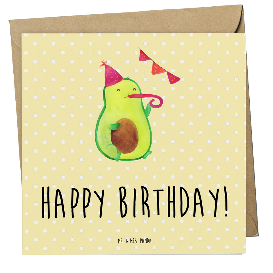 Deine Suche nach dem perfekten Geschenk endet hier! Die Deluxe Karte "Avocado Birthday" aus der zauberhaften Avocado-Kollektion von Mr. & Mrs. Panda bietet alles, was das Herz begehrt. Diese hochwertige quadratische Karte ist nicht nur mit einem süßen Motiv bedruckt, das eine fröhliche Avocado mit Partyhut und Partypfeife zeigt, sondern auch mit dem liebevollen Spruch "Happy Birthday!". Egal, ob Du einem Freund, einem Familienmitglied oder einem Kollegen eine Freude machen möchtest, diese Karte bringt garantiert ein Lächeln ins Gesicht.