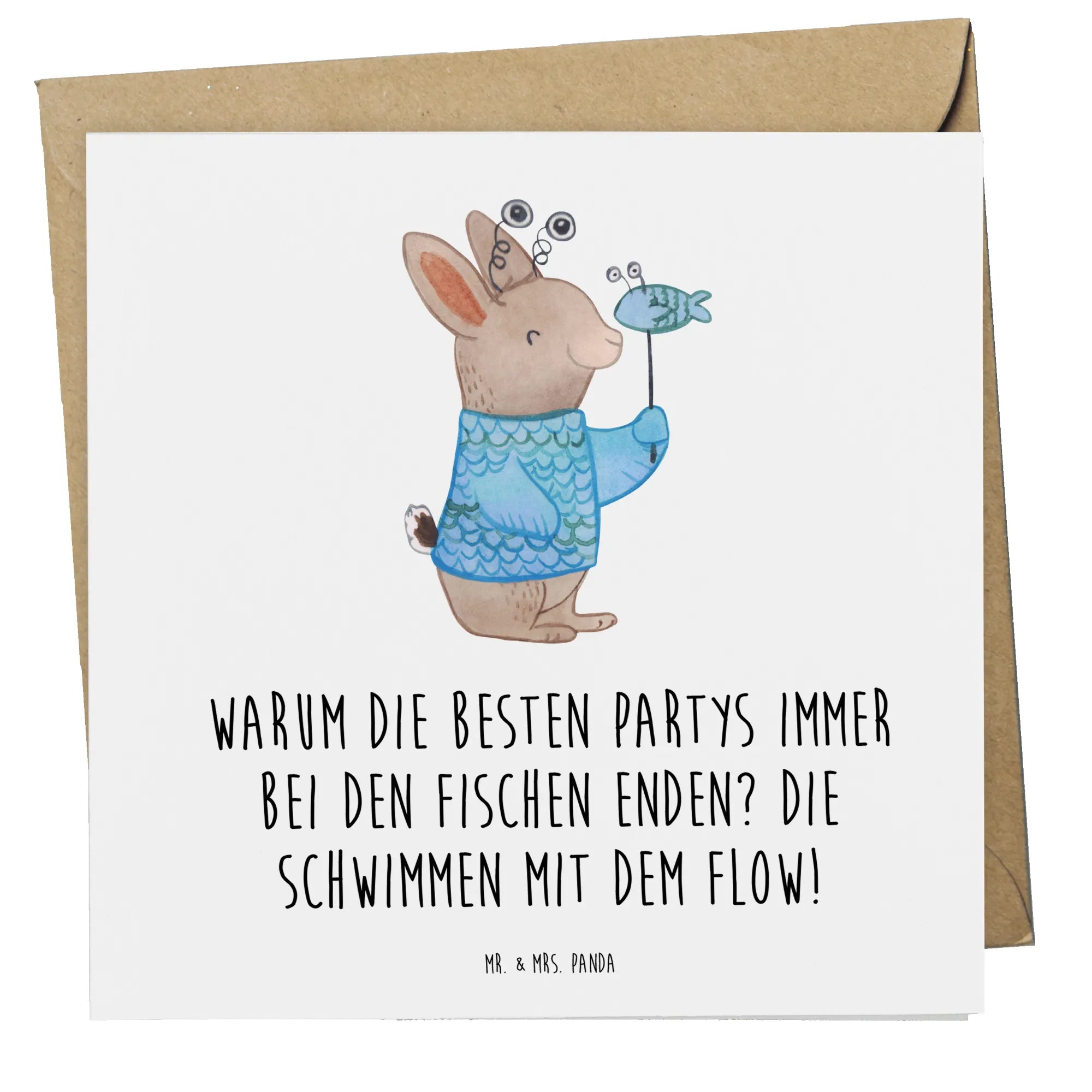 Diese besonders hochwertige, quadratische Karte misst 140 mm x 140 mm und besteht aus edlem, 300 Gramm schwerem Karton, der eine matte, glänzende Optik kombiniert. Die Vorderseite ist mit dem süßen Fische-Motiv und dem witzigen Spruch "Warum die besten Partys immer bei den Fischen enden? Die schwimmen mit dem Flow!" bedruckt.