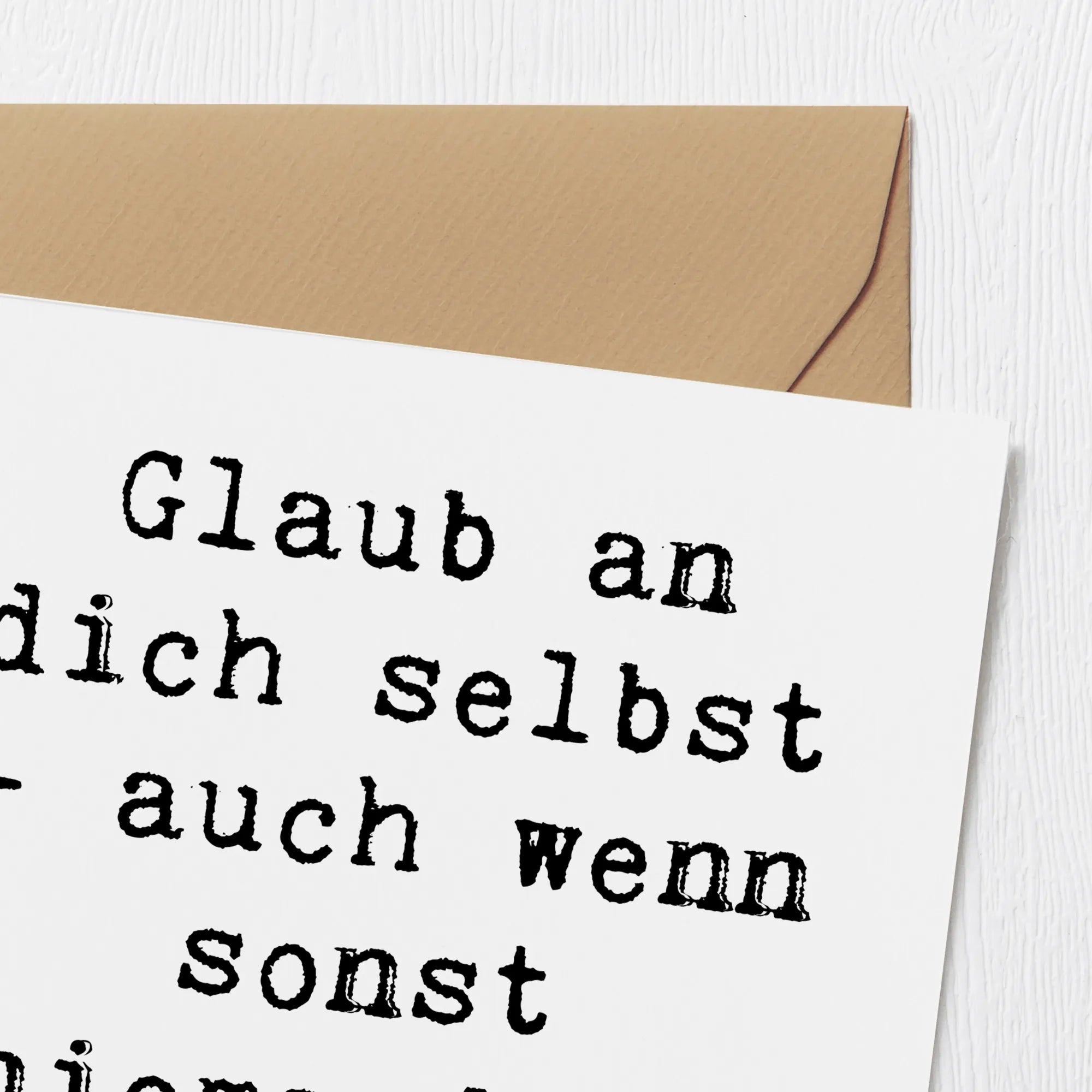 Der Spruch 'Glaub an dich selbst - auch wenn sonst niemand an dich glaubt.' ist nicht nur motivierend, sondern wirkt auch aufmunternd und wertschätzend. Diese Karte eignet sich hervorragend als Glückwunschkarte, Einladungskarte oder als persönliche Nachricht an einen Freund oder eine Freundin, die vielleicht gerade eine schwere Phase durchlebt. Mit ihrer hochglänzend veredelten Vorderseite und der matten Innenseite zur einfachen Beschriftung, lässt sich diese Karte ganz individuell gestalten.