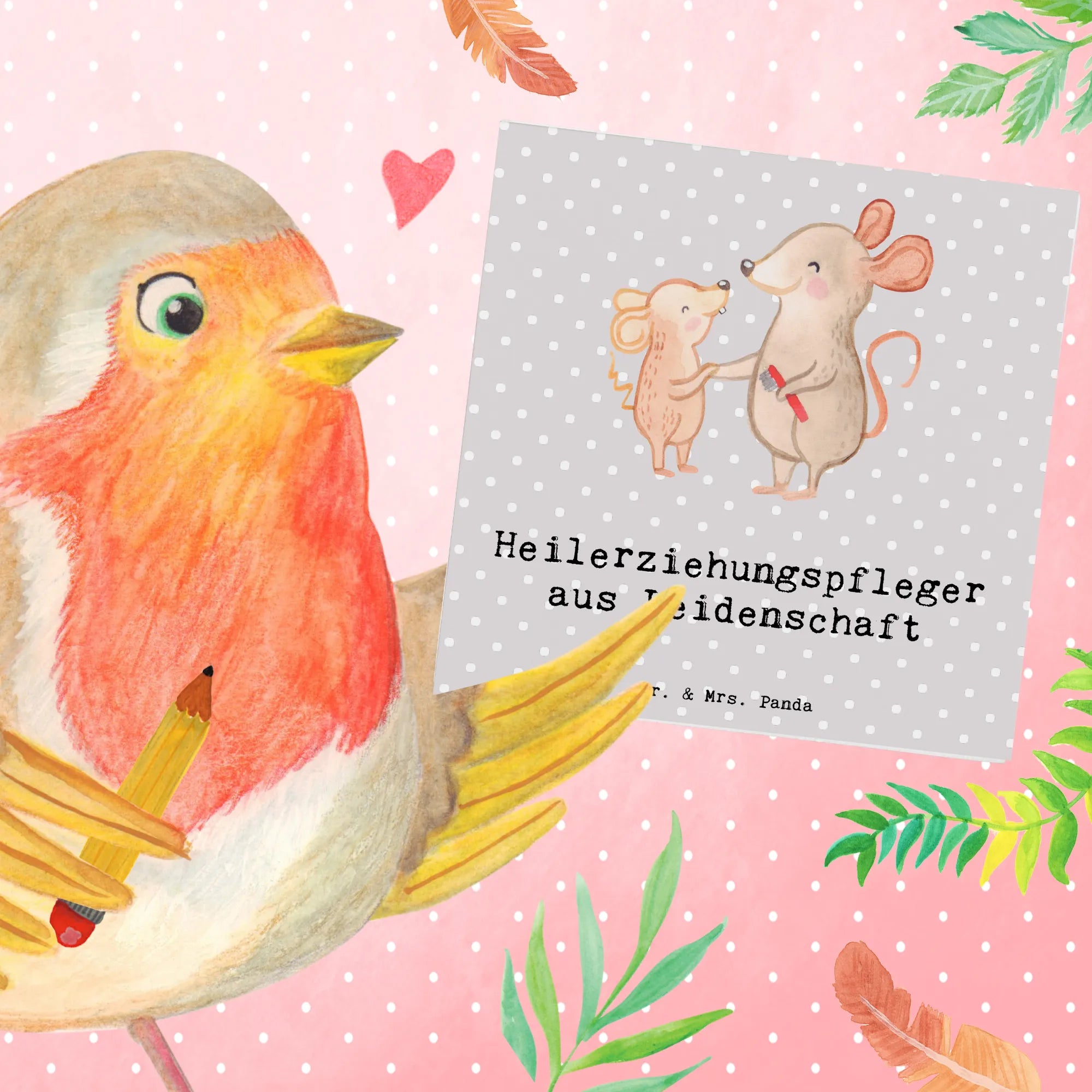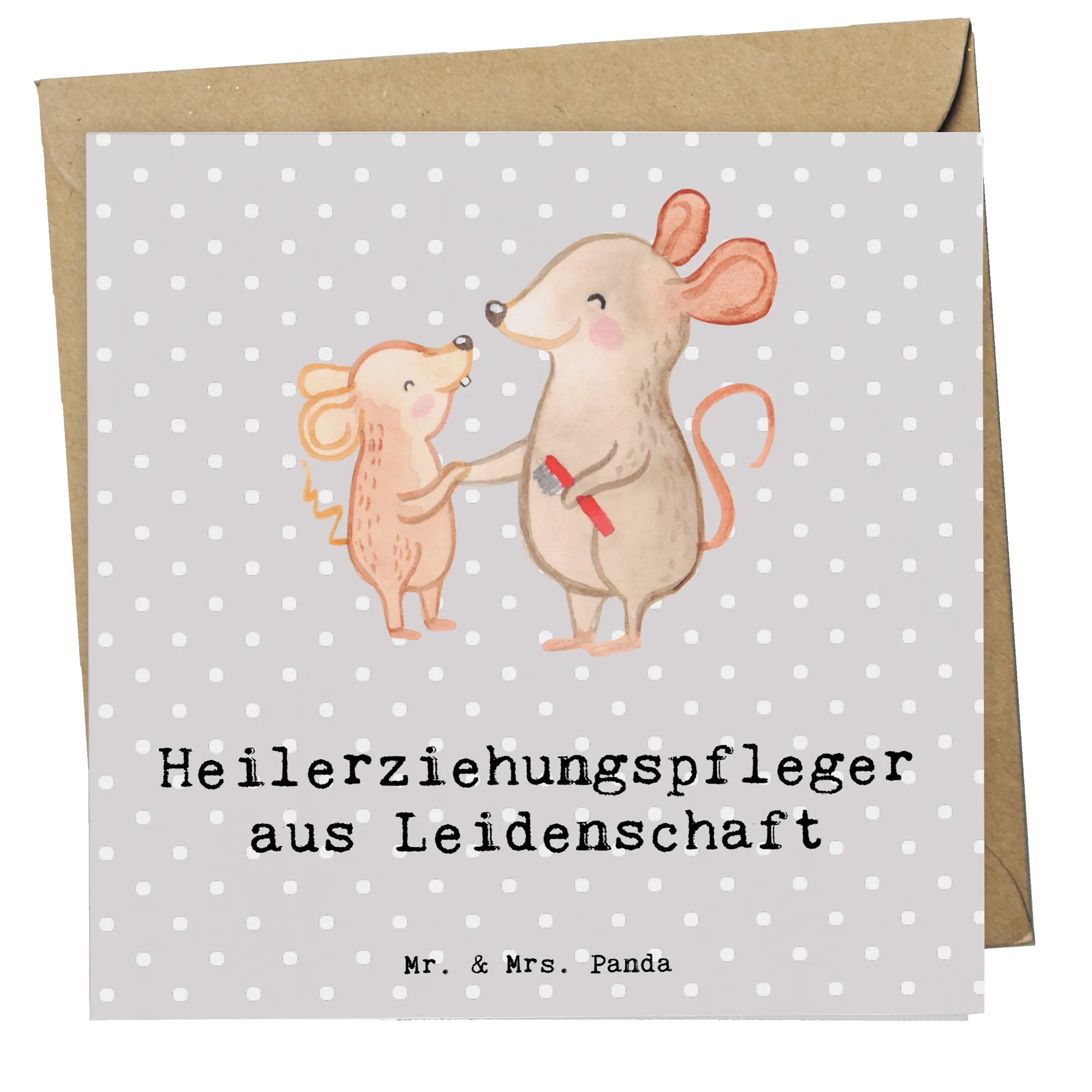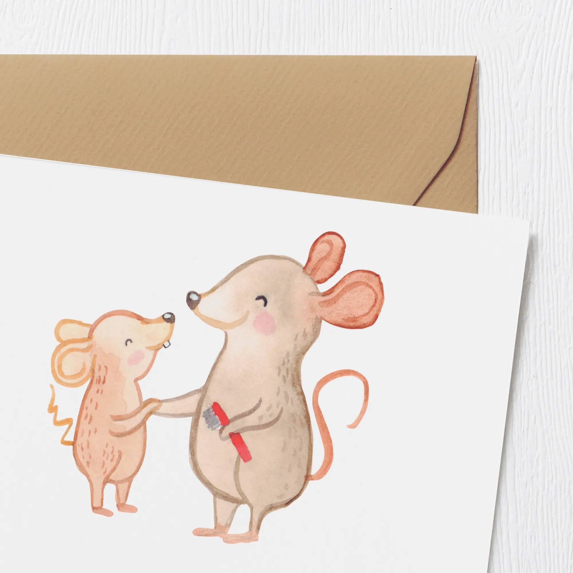 Die besondere Illustration auf der Karte zeigt eine süße Maus mit einer Zahnbürste in der Hand, die einer anderen Maus die Zähne putzt. Diese harmlose und niedliche Darstellung symbolisiert die fürsorgliche und unterstützende Rolle eines Heilerziehungspflegers, der Menschen mit geistiger, körperlicher oder seelischer Behinderung unterstützt. "Heilerziehungspfleger aus Leidenschaft" ist der Slogan, der die Botschaft des Motivs perfekt ergänzt und die Hingabe zur Arbeit jedes einzelnen Heilpädagogen unterstreicht.
