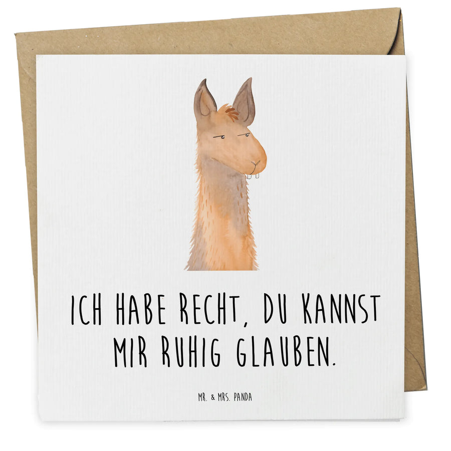Die Deluxe Karte mit dem Motiv "Lamakopf genervt" aus der Lama-Kollektion von Mr. & Mrs. Panda ist ein absolutes Must-Have für alle Lamas-Fans! Wenn Dir das Verhalten Deiner besten Freundin, Deines Partners oder sogar Deines Chefs mal wieder zu schaffen macht, dann ist diese Karte genau die richtige witzige Begleitung für deine Grüße. Der originelle Spruch "Ich habe Recht, du kannst mir ruhig glauben." bringt nicht nur ein Lächeln hervor, sondern zeigt auch, dass Du etwas zu sagen hast!