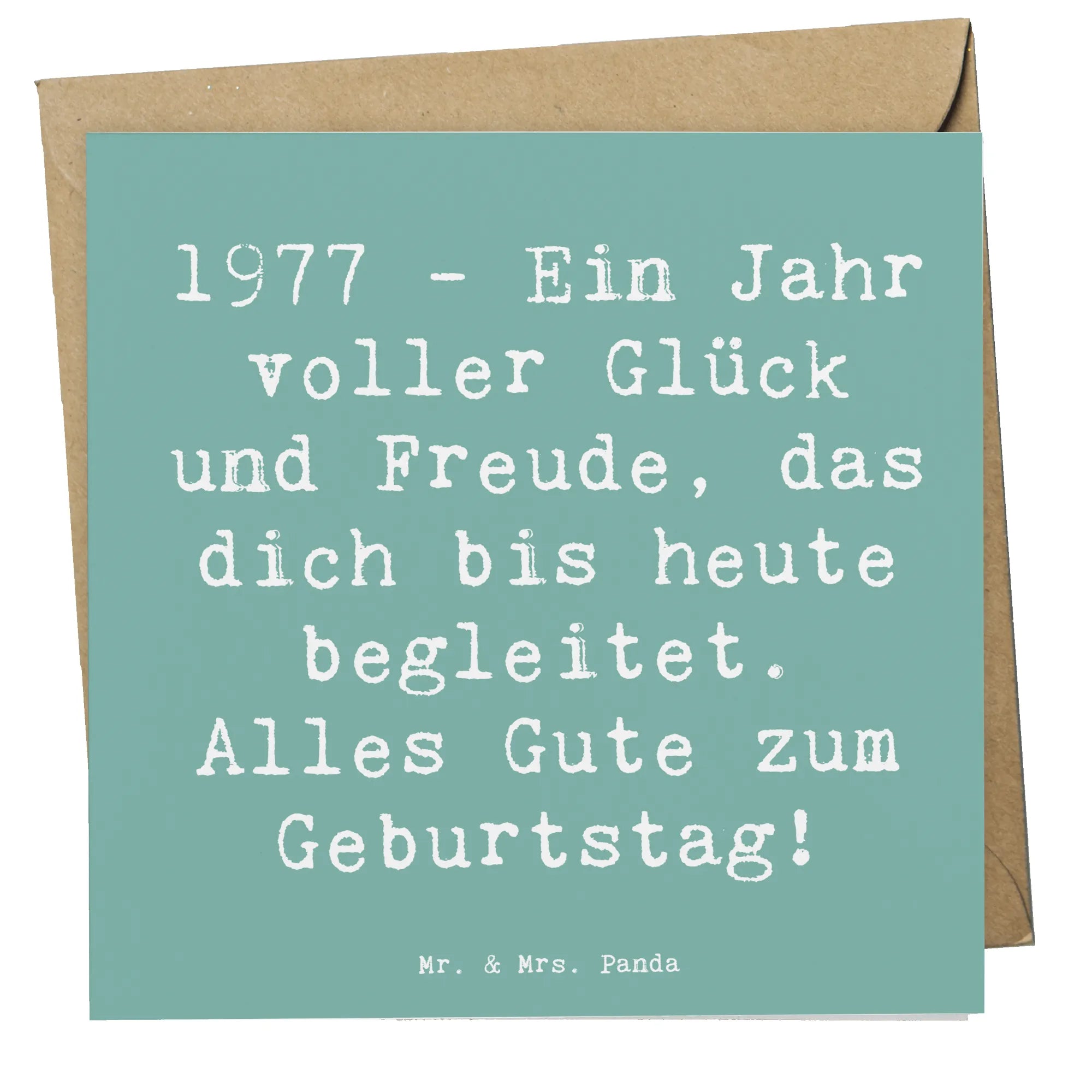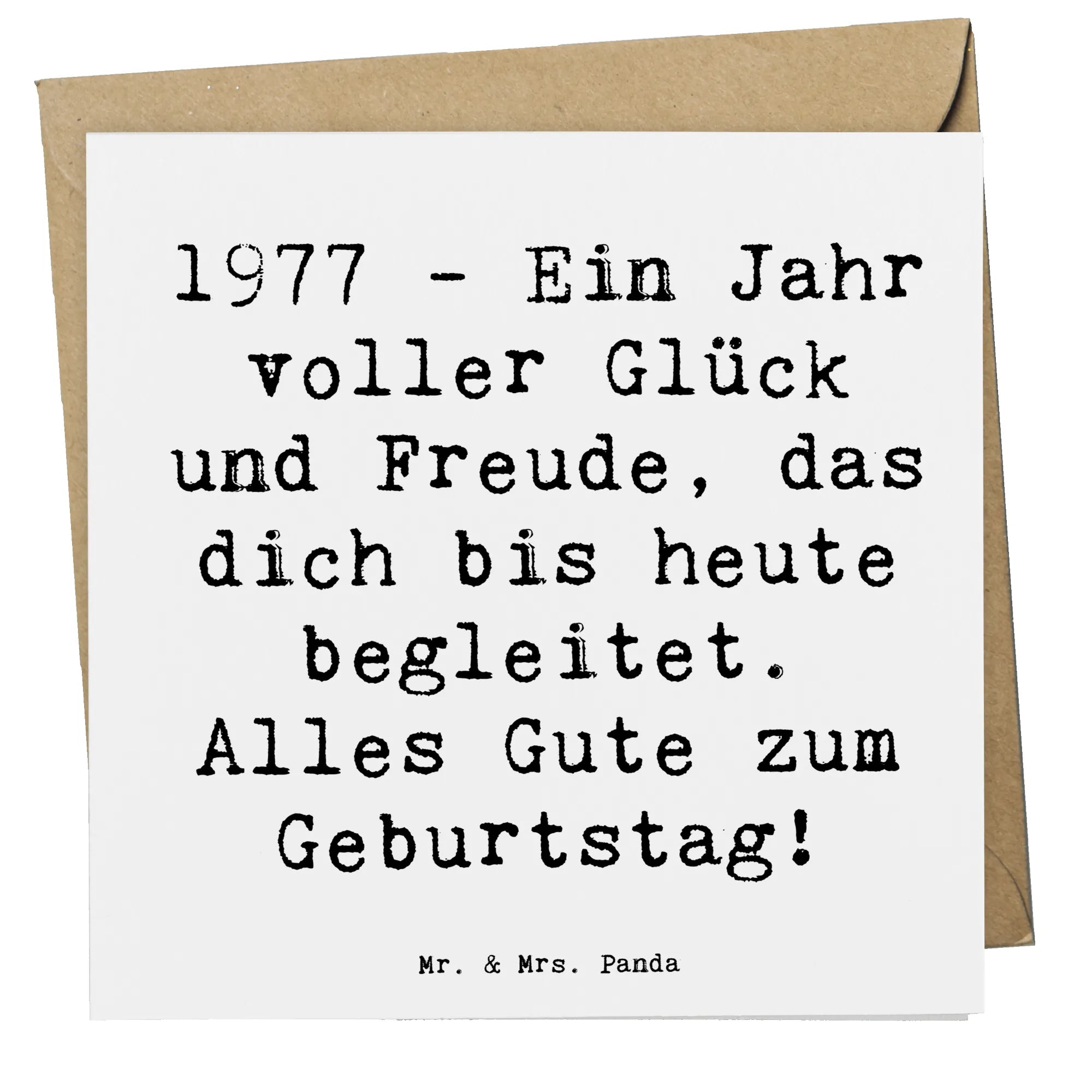 Suchst Du eine elegante und herzliche Geburtstagskarte für das Jahr 1977? Unsere Deluxe Karte 1977 Geburtstag aus der Geburtstags-Geburtsjahr-Kollektion von Mr. & Mrs. Panda verbindet liebevolle Worte mit feiner Optik. Der Spruch „1977 - Ein Jahr voller Glück und Freude, das dich bis heute begleitet. Alles Gute zum Geburtstag!“ steht im Mittelpunkt und trifft genau ins Herz.