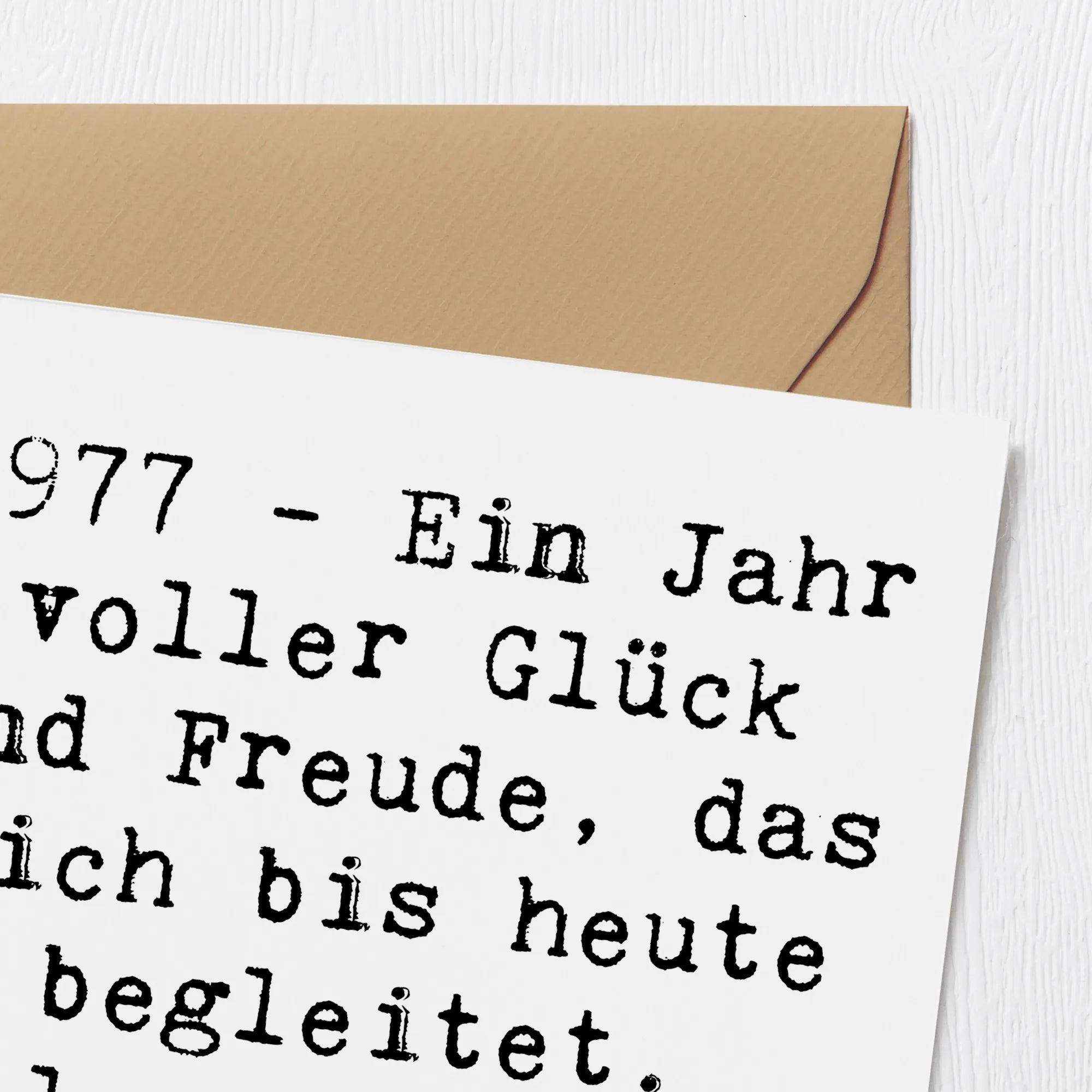 Der Spruch "1977 - Ein Jahr voller Glück und Freude, das dich bis heute begleitet. Alles Gute zum Geburtstag!" weckt Erinnerungen und zaubert ein Lächeln ins Gesicht. Die matte Innenseite der Karte lässt dir genügend Platz für deine persönlichen Wünsche und Botschaften. Du kannst die Karte ganz individuell gestalten und so deine Zuneigung auf eine kreative Art und Weise ausdrücken.