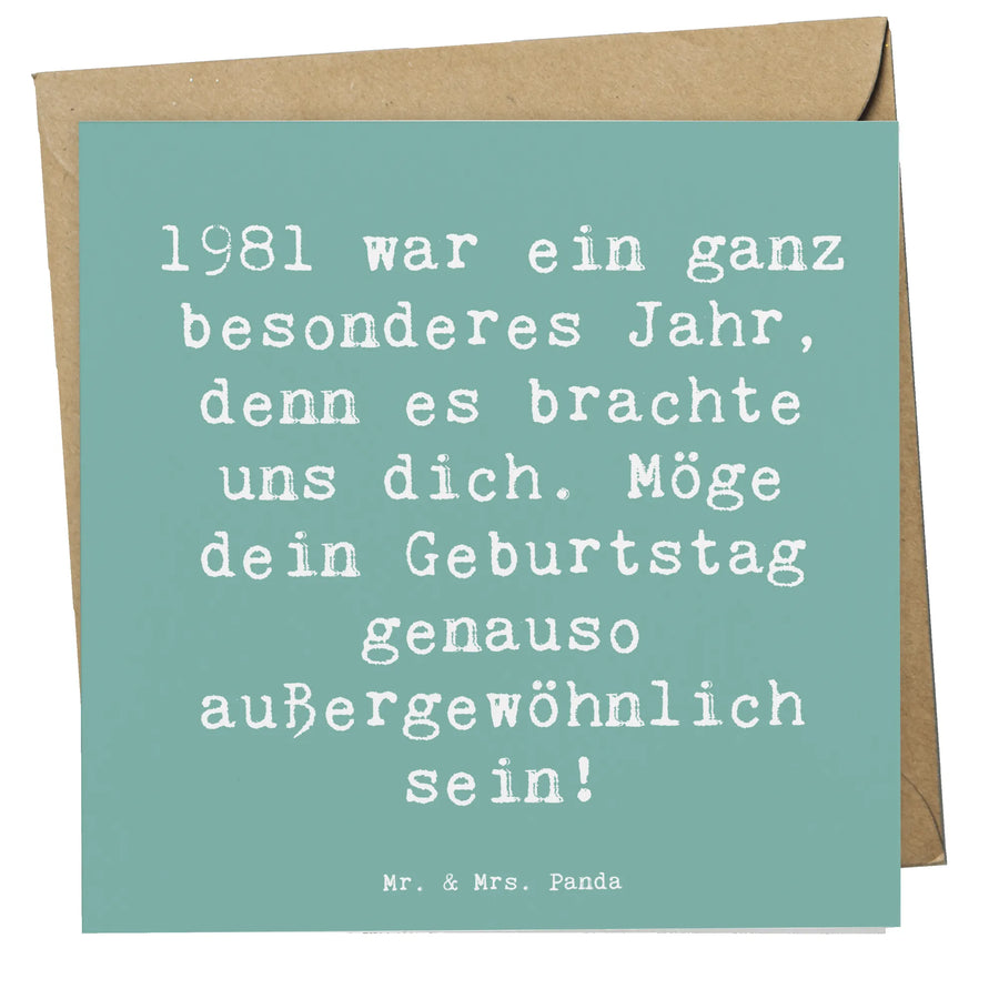 Die Deluxe Karte zum 1981. Geburtstag von Mr. & Mrs. Panda ist das perfekte Geschenk für dein Geburtstagskind, das in diesem besonderen Jahr das Licht der Welt erblickte. Diese wunderschöne und besonders hochwertige quadratische Karte ist aus 300 Gramm starkem Karton gefertigt, der sowohl matte als auch hochglänzende Oberflächen bietet. Die Vorderseite ist mit dem liebevollen Spruch "1981 war ein ganz besonderes Jahr, denn es brachte uns dich. Möge dein Geburtstag genauso außergewöhnlich sein!" versehen, um ein Lächeln auf die Lippen des Jubilars zu zaubern.