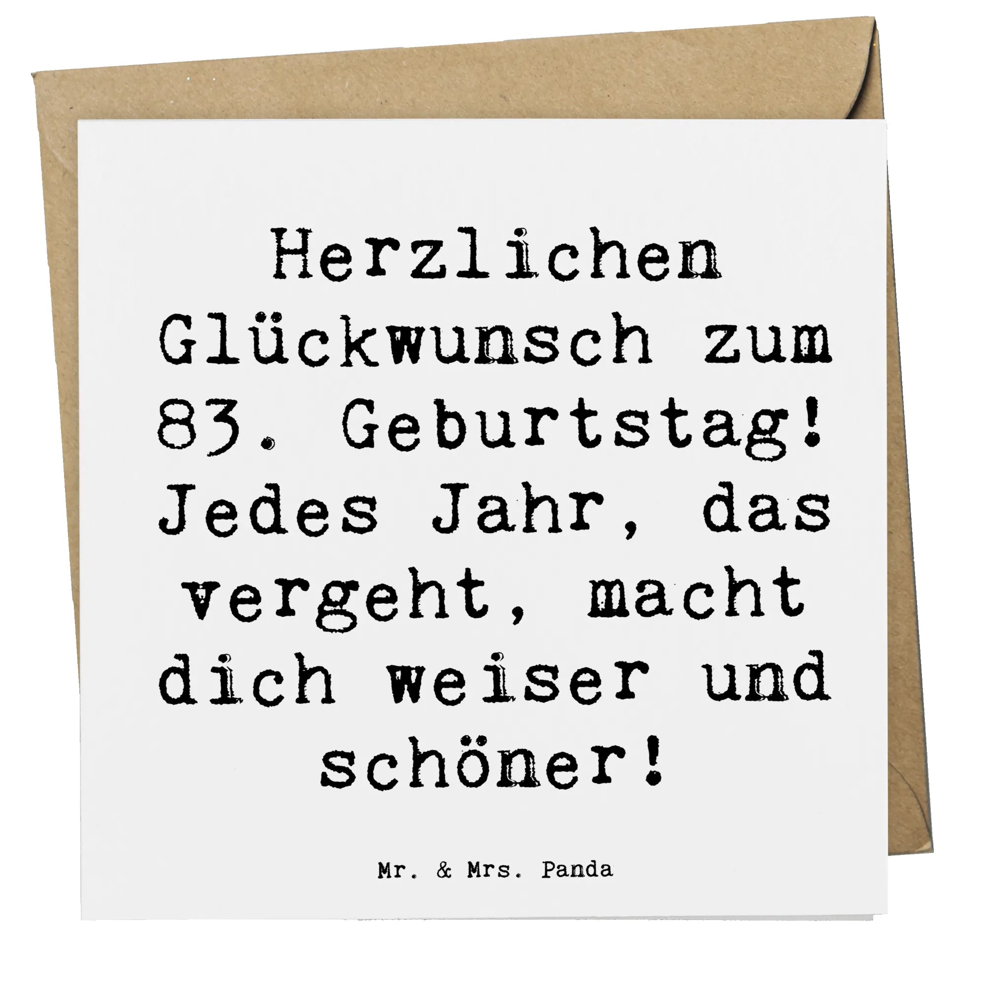Eine wunderschöne und besonders hochwertige quadratische Karte von Mr. & Mrs. Panda für den 83. Geburtstag. Diese Deluxe Karte ist nicht nur ein schicker Blickfang, sondern auch eine liebevolle Art, seinem besten Freund oder Familienmitglied zum Ehrentag zu gratulieren. Auf der Vorderseite findest Du den fröhlichen Spruch: 'Herzlichen Glückwunsch zum 83. Geburtstag! Jedes Jahr, das vergeht, macht dich weiser und schöner!' Diese Grußkarte gehört zur exklusiven Geburtstagskollektion 'Alter' und wurde mit viel Liebe zum Detail von Mrs. Panda entworfen.