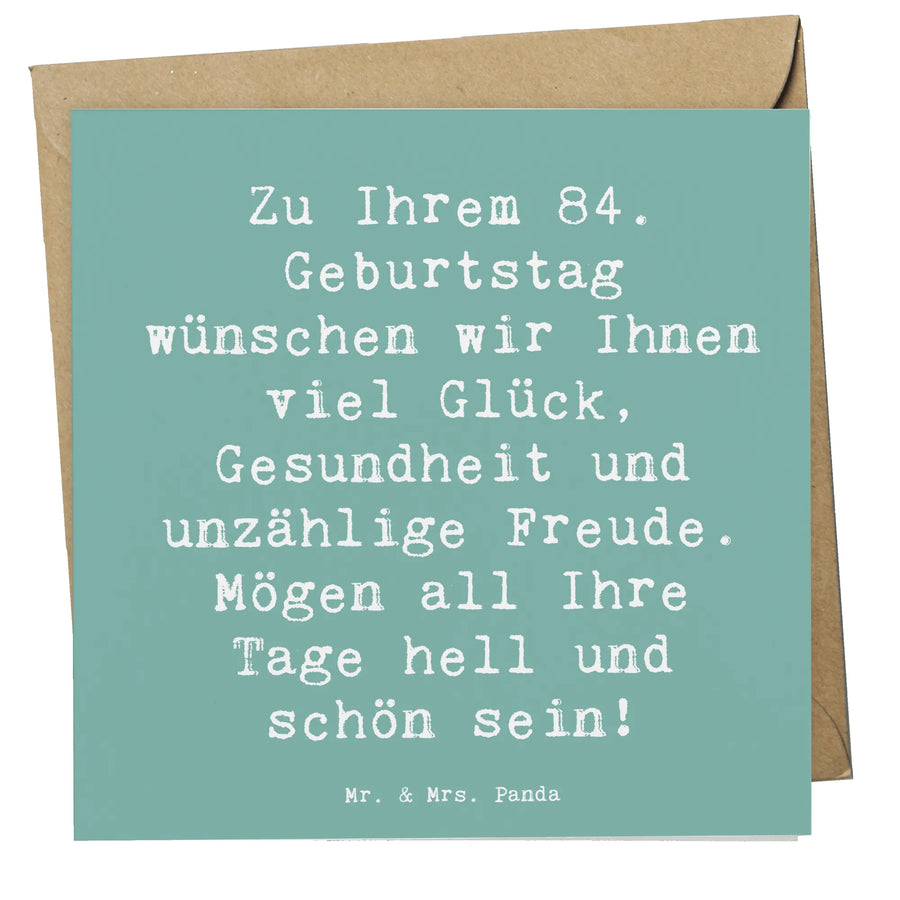 Die Deluxe Karte zum 84. Geburtstag von Mr. & Mrs. Panda ist das perfekte Geschenk für all jene, die einen besonderen Menschen an diesem besonderen Tag gratulieren möchten. Mit einem liebevollen Design und einem herzlichen Slogan: "Zu Ihrem 84. Geburtstag wünschen wir Ihnen viel Glück, Gesundheit und unzählige Freude. Mögen all Ihre Tage hell und schön sein!" passt diese Karte ideal für Freunde, Verwandte und Bekannte. Egal, ob Du den besten Freund oder die liebste Tante beschenkst – diese Karte bringt Freude und Wärme in jedes Herz.