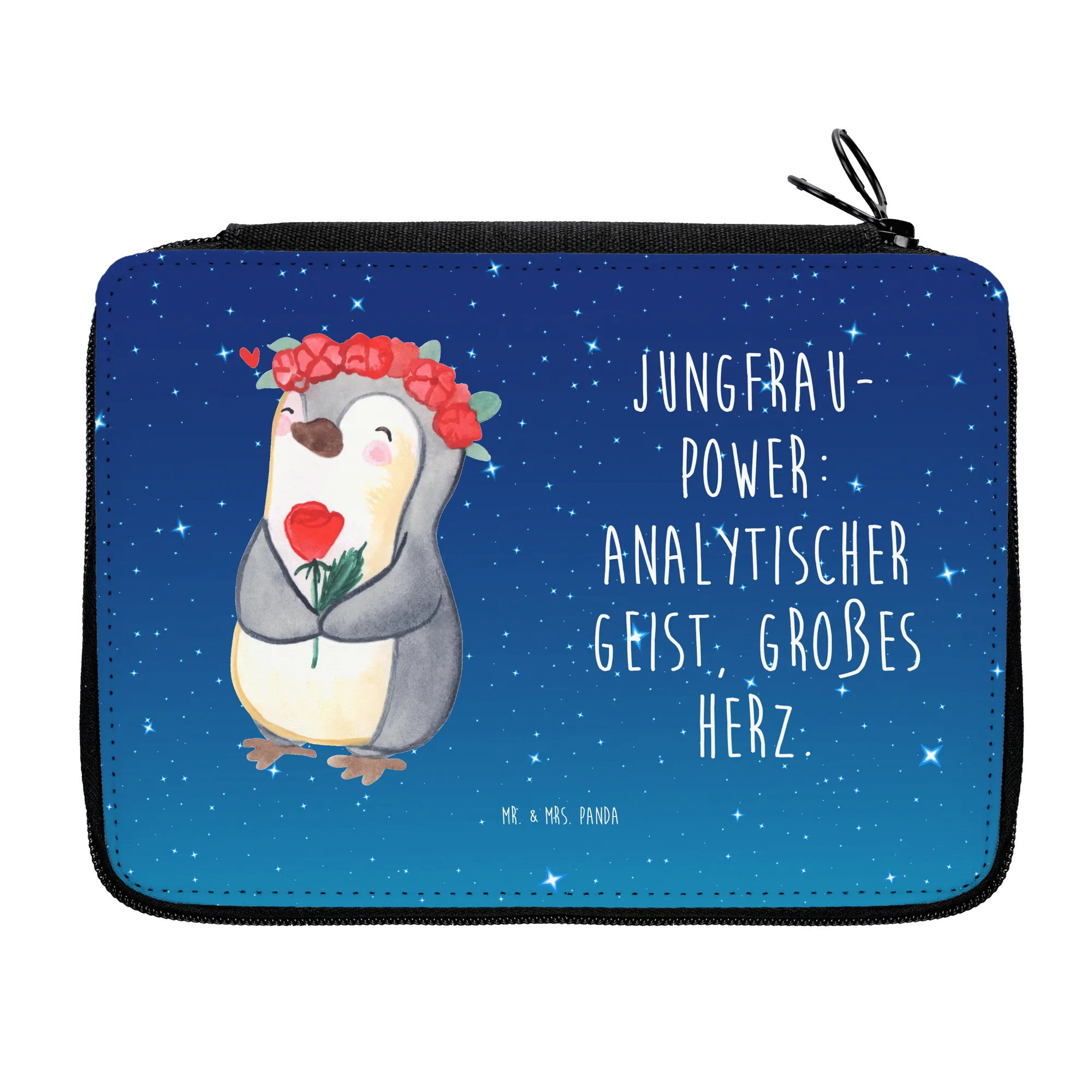 Ein ganz besonderer Hingucker ist das liebevoll handgezeichnete Motiv: ein Pinguin mit einem Herzen in der Flosse, der ein Blumenkranz trägt. Der Spruch "Jungfrau-Power: Analytischer Geist, großes Herz" macht das Federmäppchen zu einem hervorragenden Begleiter für Jungfrauen oder solche, die sich mit dem Sternzeichen identifizieren. Achte auf die hübschen Details - kleine Herzen und strahlende Farben, die vor Lebensfreude sprühen und eine positive Stimmung verbreiten!