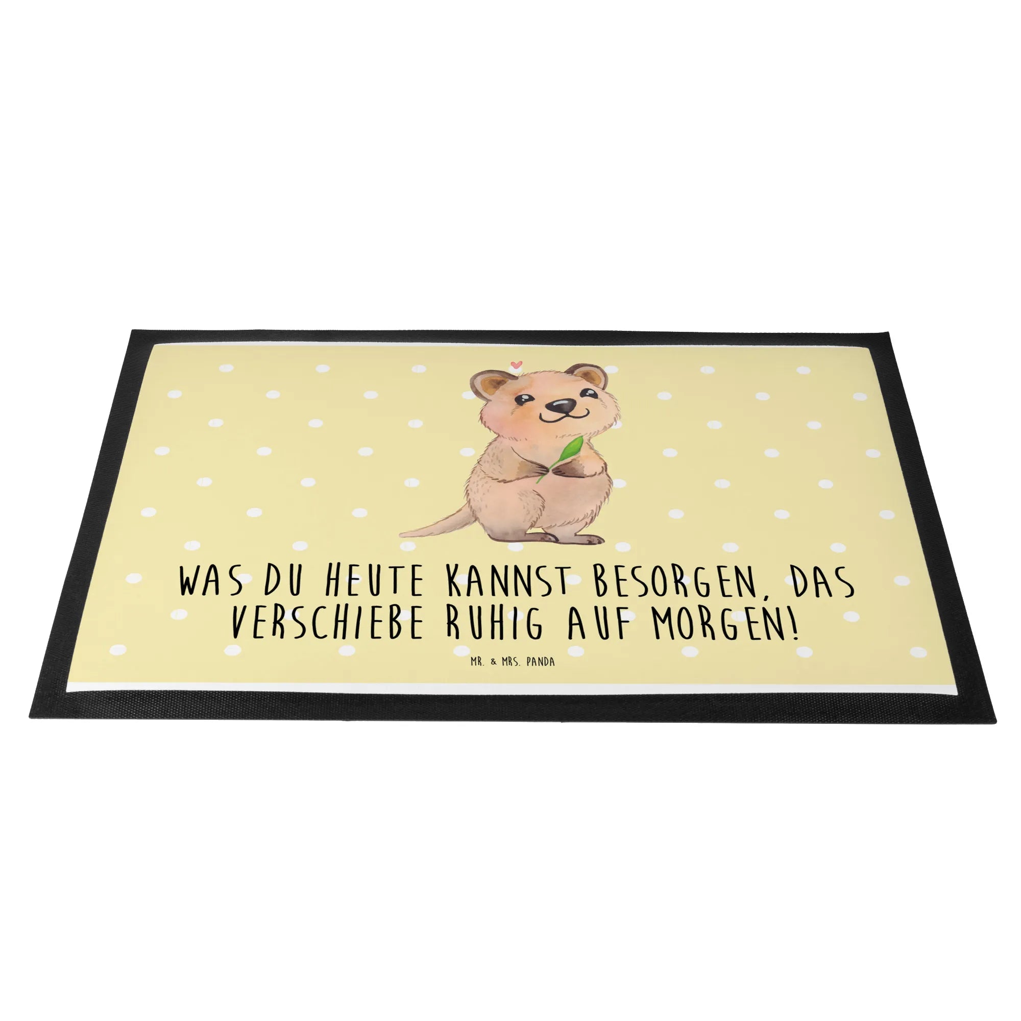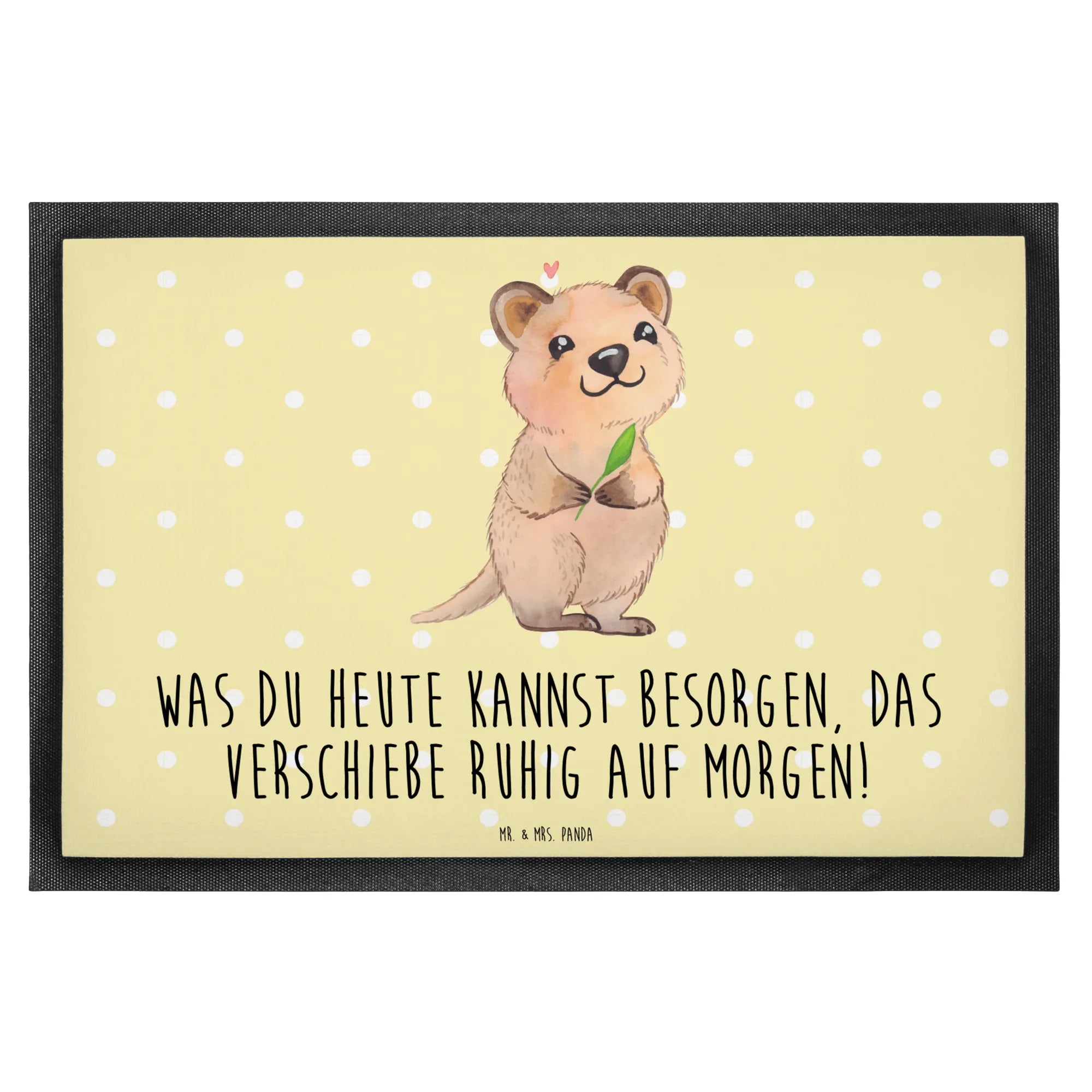 Entdecke die zauberhafte Fußmatte "Quokka Happy" aus der Small World Kollektion von Mr. & Mrs. Panda! Diese wunderschöne und hochfunktionale Fußmatte bringt nicht nur Farbe, sondern auch gute Laune in deinen Eingangsbereich. Mit ihrem niedlichen Quokka-Motiv, das fröhlich lächelt und ein grünes Blatt hält, ist sie ein echter Hingucker. Über dem kleinen Quokka schwebt ein rosa Herz, das die freundliche Ausstrahlung noch verstärkt. Das ermutigende Spruch-Motiv "Was du heute kannst besorgen, das verschiebe ruhig auf morgen!" bringt ein Lächeln in jeden Tag und ist perfekt für alle, die lieben, ihr Leben mit Humor zu nehmen.