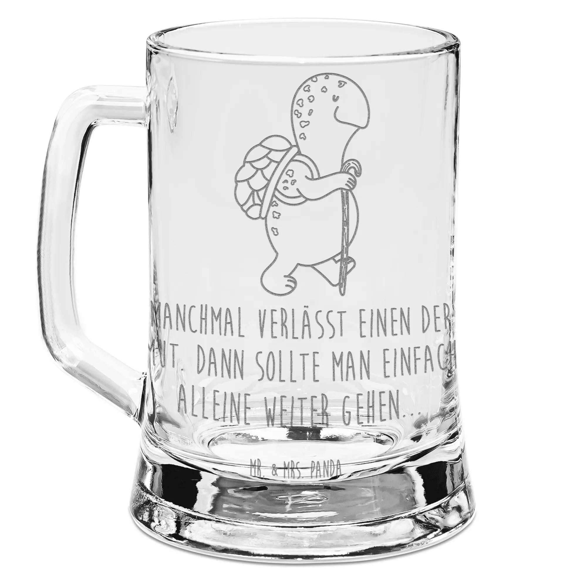 Der Gravur Bierkrug Schildkröte Wanderer von Mr. & Mrs. Panda ist nicht nur ein ganz besonderes Trinkgefäß, sondern auch ein einzigartiges Geschenk für alle Bierliebhaber und Schildkröten-Fans! Mit einer Höhe von 136 mm und einem Durchmesser von 85 mm bietet der robuste Bierkrug aus hochwertigem Premium-Glas eine Füllmenge von 450 ml – perfekt für ein kühles Bier an einem schönen Abend!