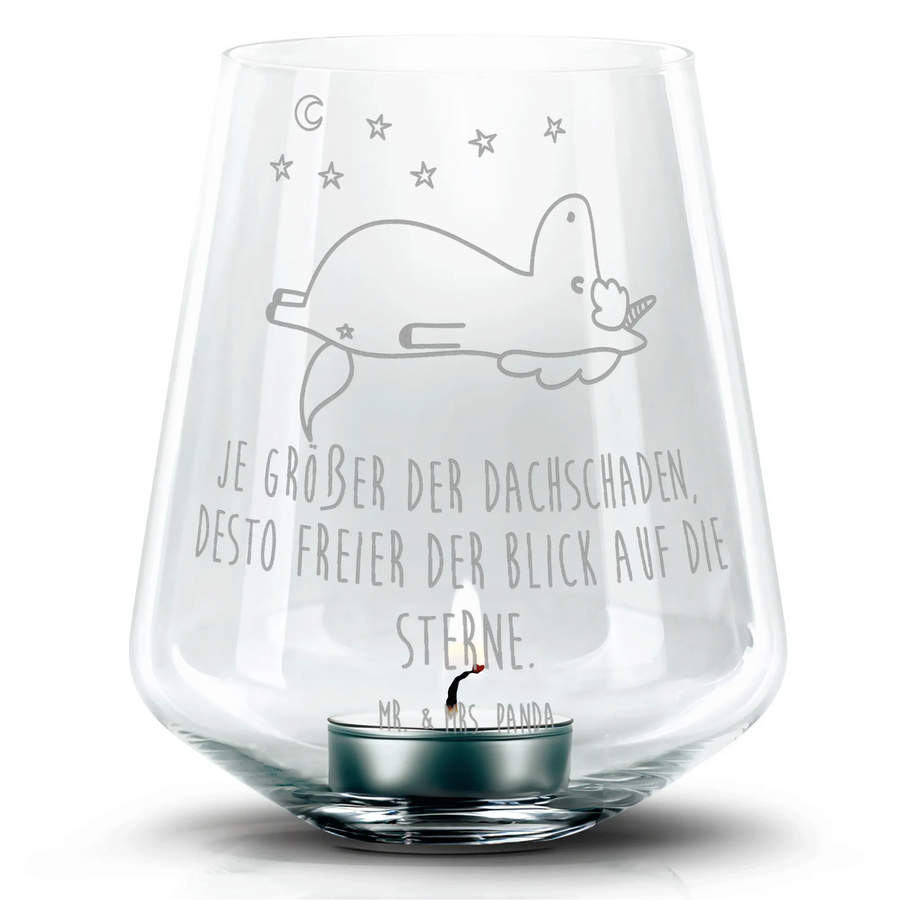 Das wundervolle Gravur Windlicht Einhorn Sternenhimmel von Mr. & Mrs. Panda ist das perfekte Geschenk für Einhornliebhaber und diejenigen, die das Besondere suchen! Mit einer liebevollen Lasergravur zeigt es ein zauberhaftes Einhorn, das mit seinen großen Augen den Sternenhimmel bewundert. Dieses niedliche Design inspiriert uns dazu, verrückt genug zu sein, um unseren Blick auf das Wunderbare zu richten! Mit dem Motto „Je größer der Dachschaden, desto freier der Blick auf die Sterne“ bietet es nicht nur eine wunderschöne Beleuchtung, sondern auch eine tolle Botschaft für das Leben.