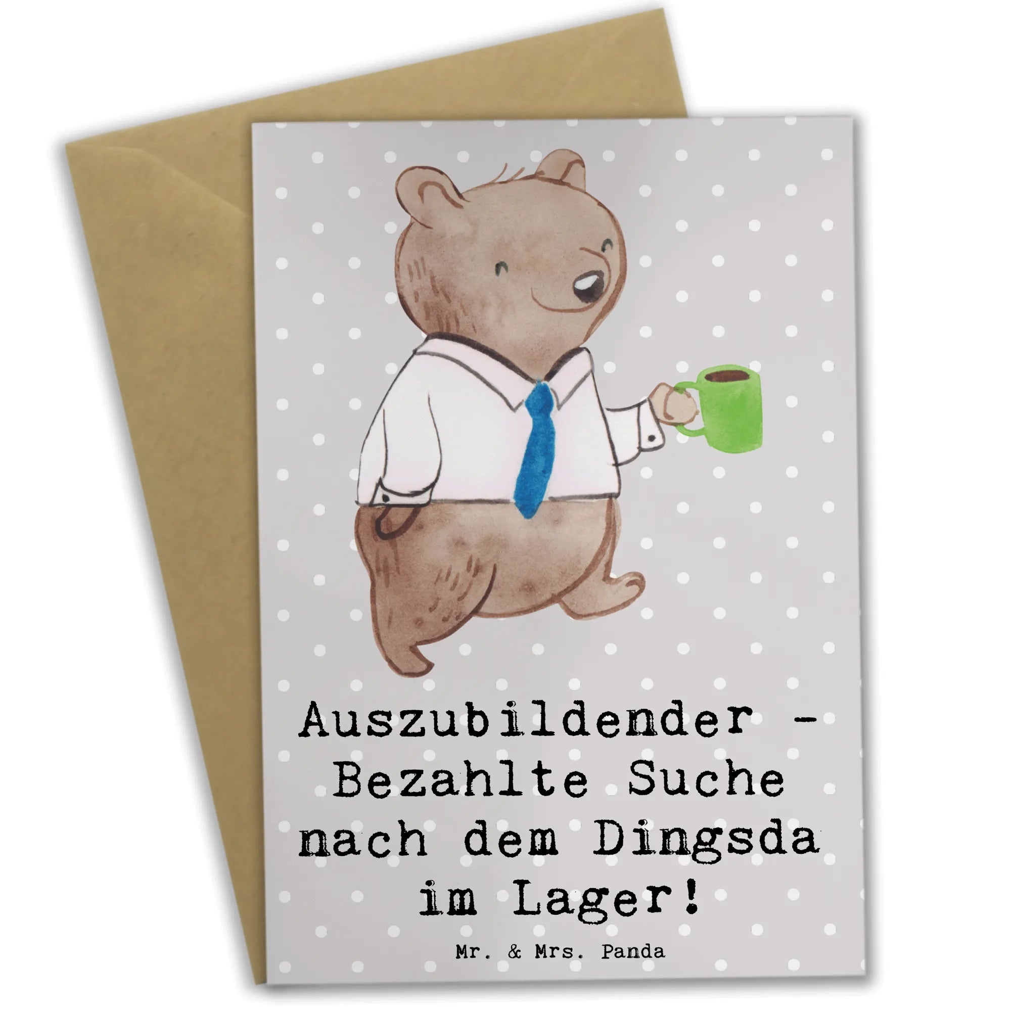 Die wunderschöne Grußkarte "Auszubildender - Bezahlte Suche nach dem Dingsda im Lager!" von Mr. & Mrs. Panda ist das perfekte Geschenk für alle, die gerade eine Ausbildung beginnen oder am Anfang ihrer beruflichen Laufbahn stehen. Diese liebevoll gestaltete Klappkarte bringt mit ihrem witzigen Spruch und dem charmanten Design ein Lächeln auf jedes Gesicht. Egal, ob Du sie zur bestandenen Prüfung, zum Ausbildungsbeginn oder einfach so verschenken möchtest, diese Karte macht immer eine gute Figur!