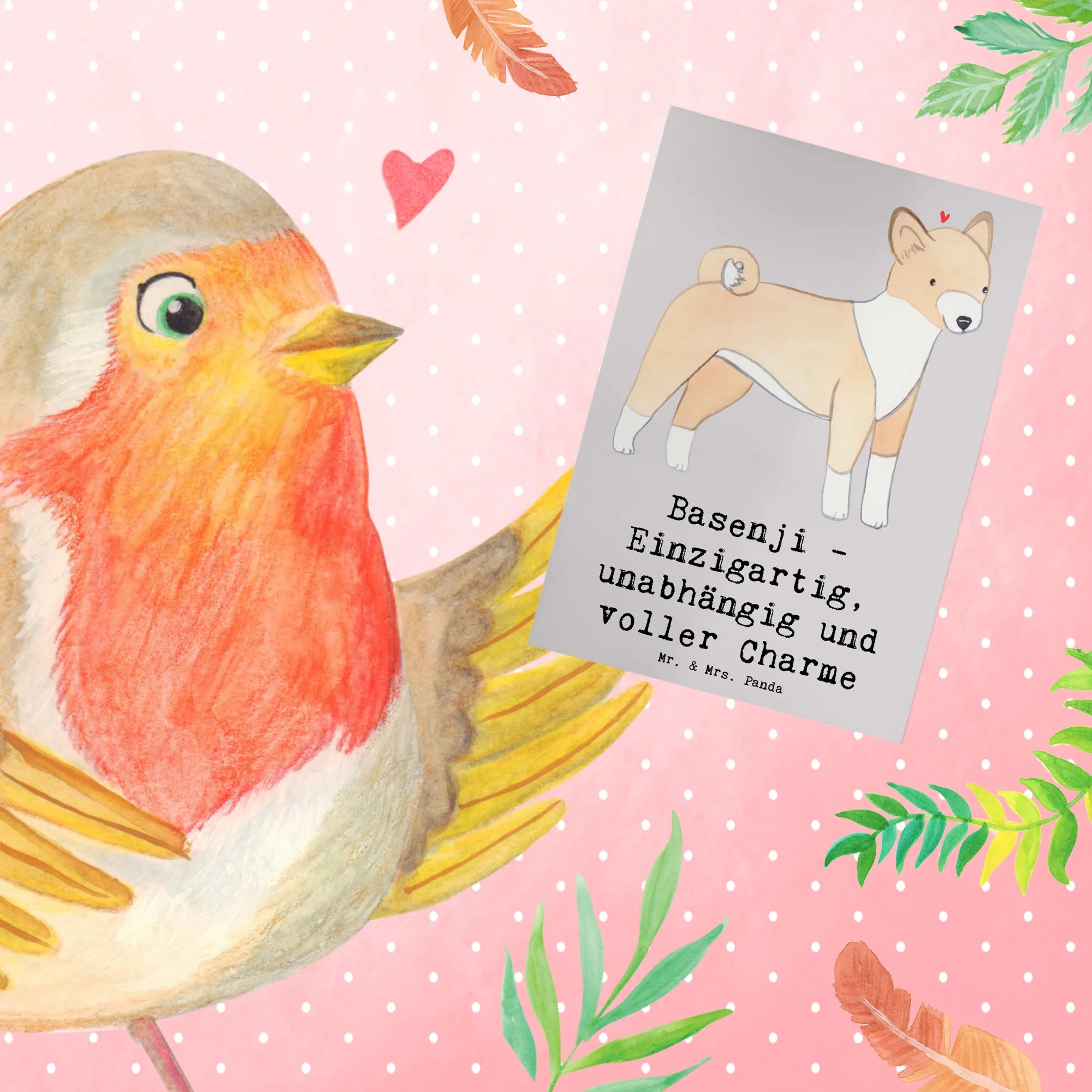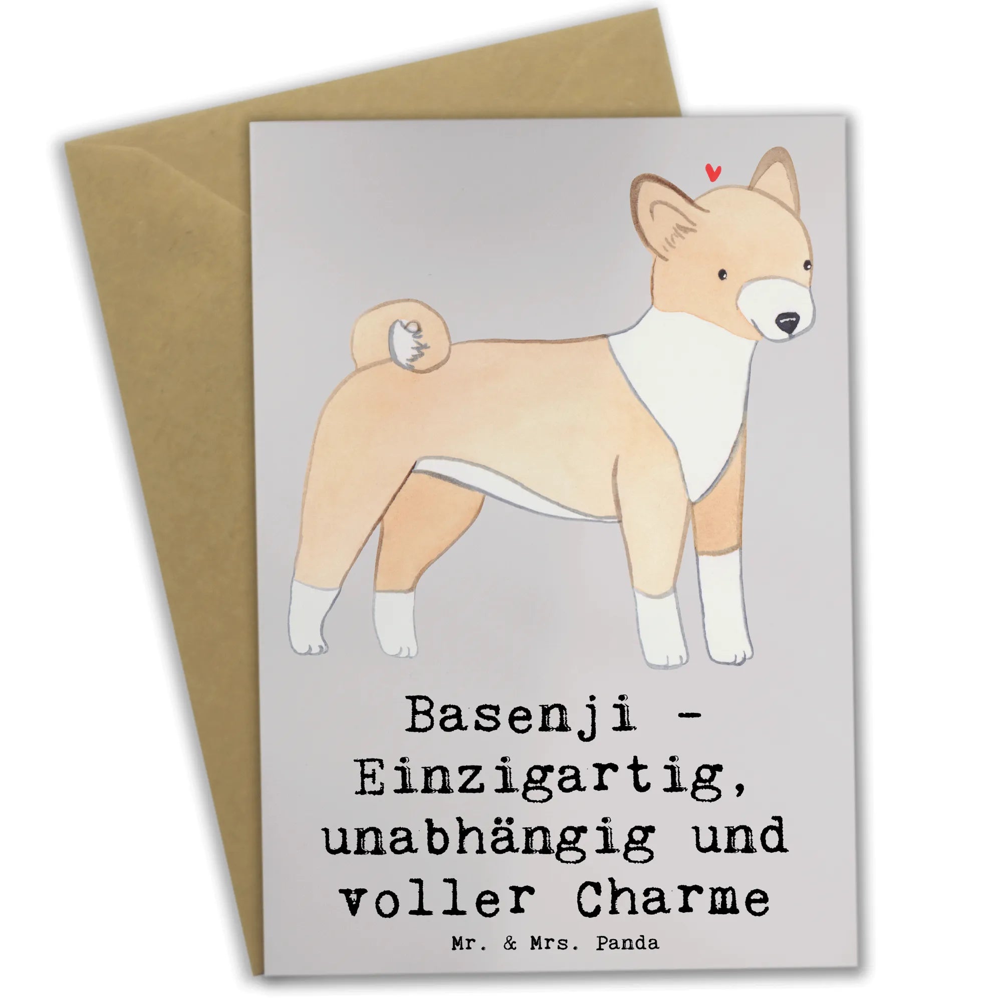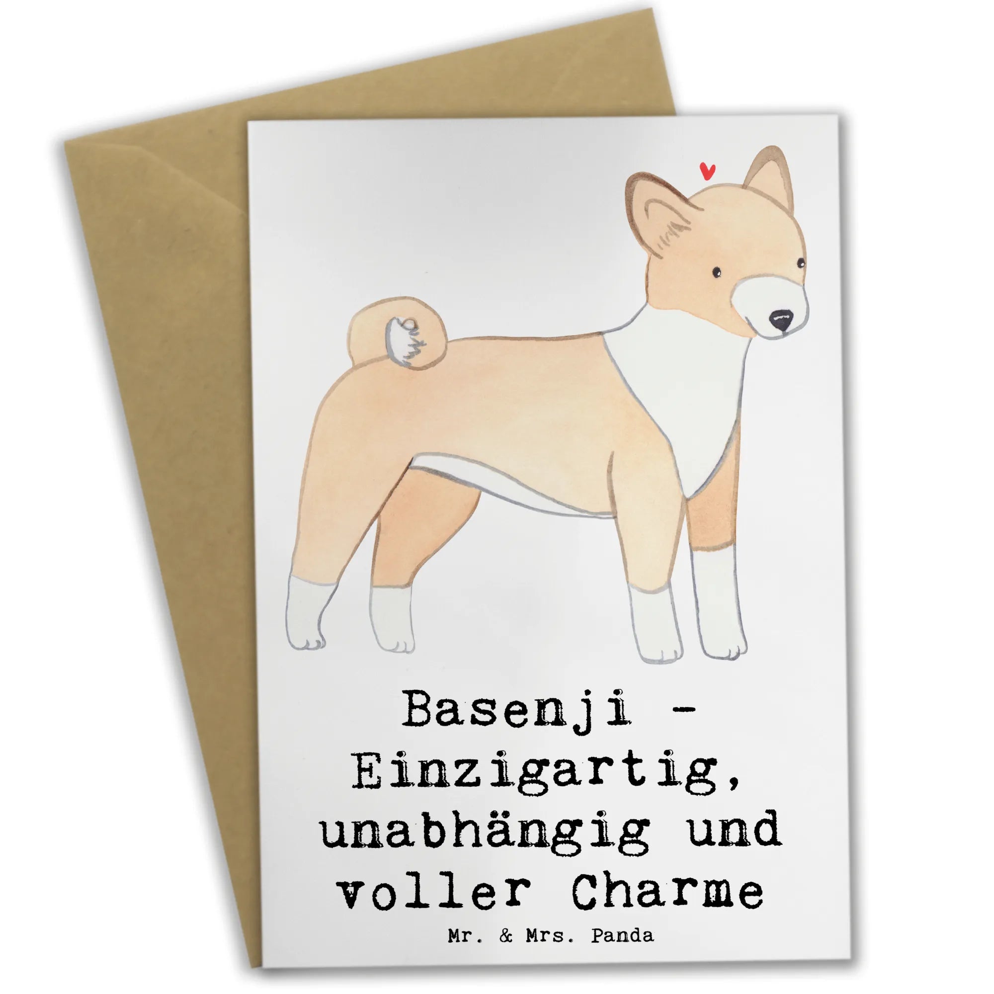 Die Grußkarte Basenji von Mr. & Mrs. Panda ist das perfekte Geschenk für alle Hundeliebhaber! Mit ihrem zauberhaften Motiv und dem inspirierenden Spruch "Basenji - Einzigartig, unabhängig und voller Charme" bringen sie Freude in jede Lebenslage. Ob zur Hochzeit, zum Geburtstag oder einfach als kleine Aufmerksamkeit - diese einzigartige Karte ist für viele Anlässe geeignet.